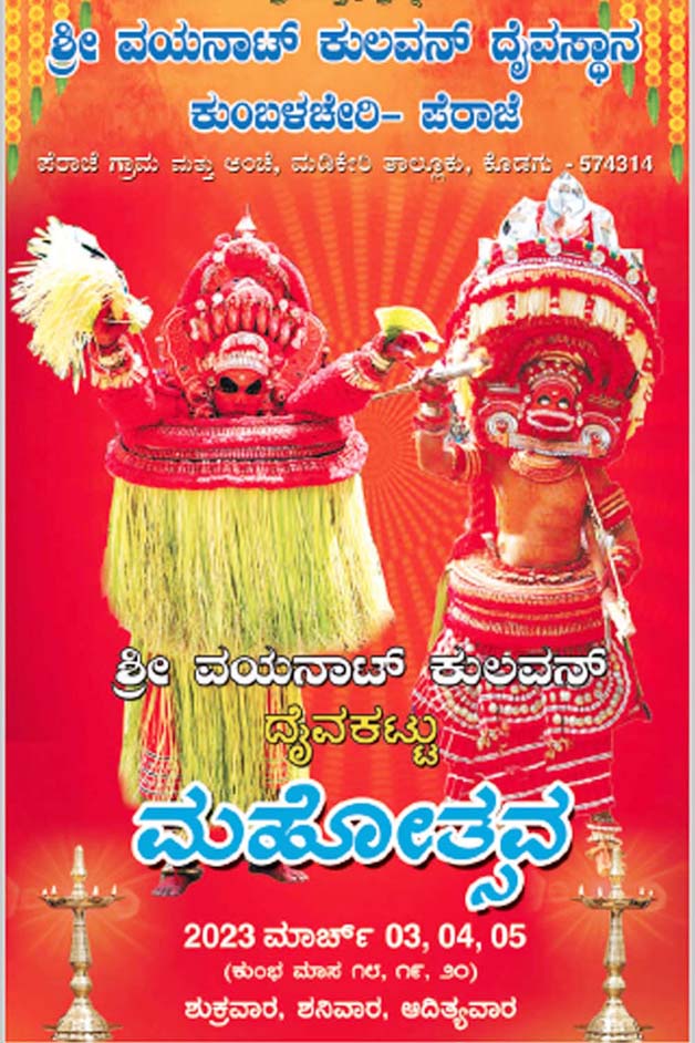 ನಾಪೋಕ್ಲು ಮಾ.1 : ಪೆರಾಜೆ ಗ್ರಾಮದ ಕುಂಬಳಚೇರಿಯ ಶ್ರೀ ವೈನಾಟ್ ಕುಲವನ್ ದೈವಸ್ಥಾನದ ಶ್ರೀ ವಯನಾಟ್ ಕುಲವನ್ ದೈವಕಟ್ಟು ಮಹೋತ್ಸವವು ಮಾ.3 ರಿಂದ ಮಾ.5ರ ವರೆಗೆ ಜರುಗಲಿದೆ.