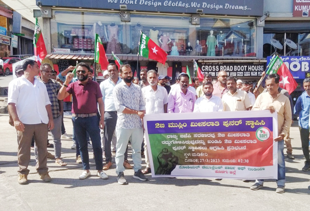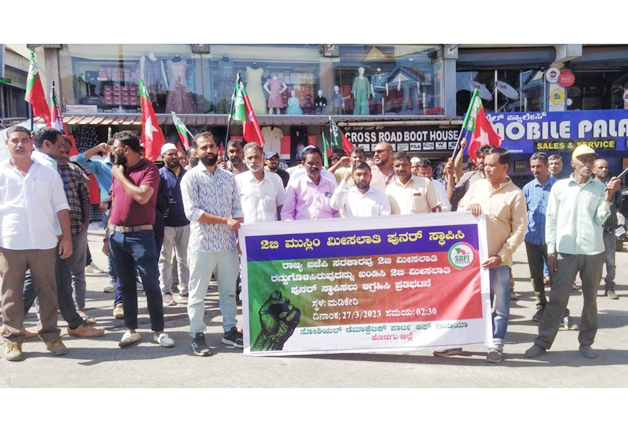 ಮಡಿಕೇರಿ ಮಾ.27 : ಅಲ್ಪಸಂಖ್ಯಾತ ಮುಸ್ಲಿಂ ಸಮುದಾಯಕ್ಕೆ ಮೀಸಲಿದ್ದ 2ಬಿ ಮೀಸಲಾತಿಯನ್ನು ಪುನರ್ ಸ್ಥಾಪಿಸುವಂತೆ ಆಗ್ರಹಿಸಿ ಸೋಶಿಯಲ್ ಡೆಮಾಕ್ರಟಿಕ್ ಪಾರ್ಟಿ ಆಫ್ ಇಂಡಿಯಾ ಪಕ್ಷ ಮಡಿಕೇರಿಯಲ್ಲಿ ಪ್ರತಿಭಟನೆ ನಡೆಸಿತು.