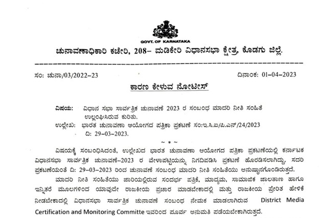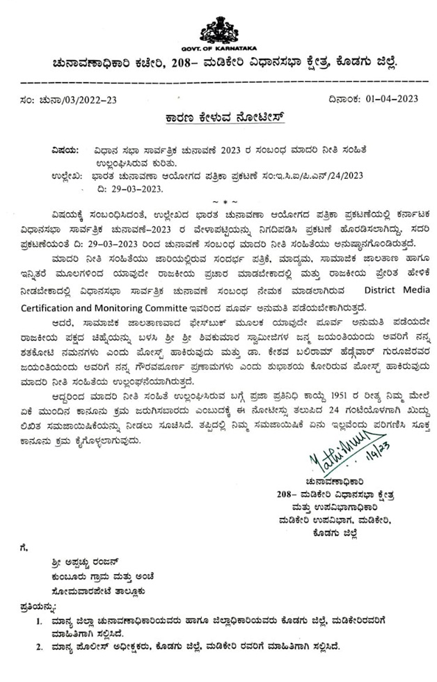 ಮಡಿಕೇರಿ ಏ.1 : ಮಡಿಕೇರಿ ಕ್ಷೇತದ ಶಾಸಕ ಎಂ.ಪಿ.ಅಪ್ಪಚ್ಚು ರಂಜನ್ ಅವರಿಗೆ ಮಡಿಕೇರಿ ವಿಧಾನಸಭಾ ಕ್ಷೇತ್ರದ ಚುನಾವಣಾಧಿಕಾರಿ ನೋಟೀಸ್ ನೀಡಿದ್ದಾರೆ.