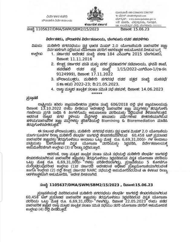 ::: ನಗರಸಭೆಯಿಂದ ಪ್ರಸ್ತಾವನೆ ::: ಹಸಿರು ನ್ಯಾಯಾಧೀಕರಣದ ಆದೇಶದ ಹಿನ್ನೆಲೆ ಮಡಿಕೇರಿ ನಗರಸಭೆಯ ಪೌರಾಯುಕ್ತರು ಪ್ರಸಕ್ತ ಸಾಲಿನ ಮೇ 21 ರಂದು ಸಚ್ಛ ಭಾರತ ಮಿಷನ್ 2.0 ಯೋಜನೆಯ ಮಾರ್ಗಸೂಚಿಗಳ ರೀತ್ಯಾ ಮಡಿಕೇರಿ ನಗರ ವ್ಯಾಪ್ತಿಯಲ್ಲಿ ಶೇಖರಣೆಯಾಗಿರುವ 60,458 ಟನ್ ಪ್ರಮಾಣದ ತ್ಯಾಜ್ಯವನ್ನು ತೆರವುಗೊಳಿಸಲು 6.69ಕೋಟಿ ವೆಚ್ಚದ ಅಂದಾಜು ಪಟ್ಟಿಯನ್ನು ಒಳಗೊಂಡಂತೆ ವಿಸ್ತೃತ ಯೋಜನಾ ವರದಿಯನ್ನು ಪೌರಾಡಳಿತ ನಿರ್ದೇಶನಾಲಯಕ್ಕೆ ಸಲ್ಲಿಸಿದ್ದರು.