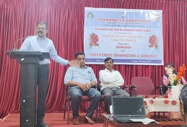 ಮಡಿಕೇರಿಯ ಫೀಲ್ಡ್ ಮಾರ್ಷಲ್ ಕೆ.ಎಂ.ಕಾರ್ಯಪ್ಪ ಕಾಲೇಜಿನ ಐಕ್ಯೂಎಸಿ, ಪ್ಲೇಸ್ ಮೆಂಟ್ ಮತ್ತು ಸ್ಕಿಲ್ ಡೆವಲಪ್ಮೆಂಟ್ ಕೋಶ( ವಿಭಾಗದ)ಗಳ ವತಿಯಿಂದ ಜಿಲ್ಲಾ ಉದ್ಯೋಗ ವಿನಿಮಯ ಮಾಹಿತಿ ಕೇಂದ್ರದ ಸಹಯೋಗದಲ್ಲಿ ನಡೆಸಲಾದ ಉದ್ಯೋಗ ಮಾಹಿತಿ ಮತ್ತು ಮಾರ್ಗದರ್ಶನ ಕಾರ್ಯಕ್ರಮದಲ್ಲಿ ವಿದ್ಯಾರ್ಥಿಗಳಿಗೆ ವಿವಿಧ ಸರಕಾರಿ ಮತ್ತು ಖಾಸಗಿ ಔದ್ಯೋಗಿಕ ಅವಕಾಶಗಳ ಕುರಿತು ಸಂಪನ್ಮೂಲ ವ್ಯಕ್ತಿಯಾಗಿ ಮಾಹಿತಿ ನೀಡಿದರು.