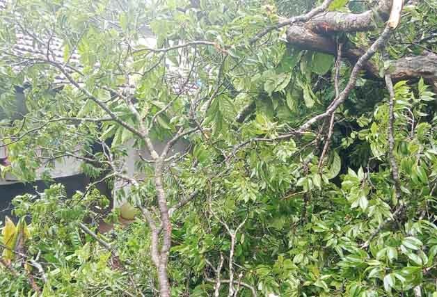 ಗುರುವಾರ ಬೆಳಗ್ಗೆ ಭೀಮಯ್ಯ ಎಂಬುವವರು ಮಕ್ಕಳನ್ನು ಶಾಲೆಗೆ ಕಳುಹಿಸಲು ತಯಾರಿ ನಡೆಸುವ ಸಂದರ್ಭ ಮನೆಯ ಮೇಲೆ ಏಕಾಏಕಿ ಮರ ಬಿದ್ದಿದೆ.ಇದರಿಂದ ಗಾಬರಿಗೊಂಡ ಮನೆ ಮಂದಿ ಮನೆಯಿಂದ ಓಡಿ ಹೊರ ಹೋಗಿದ್ದಾರೆ.ಇದರಿಂದ ಯಾವುದೇ ಅನಾಹುತ ಸಂಭವಿಸದೆ ಪ್ರಾಣಾಪಾಯದಿಂದ ಪಾರಾಗಿದ್ದಾರೆ.