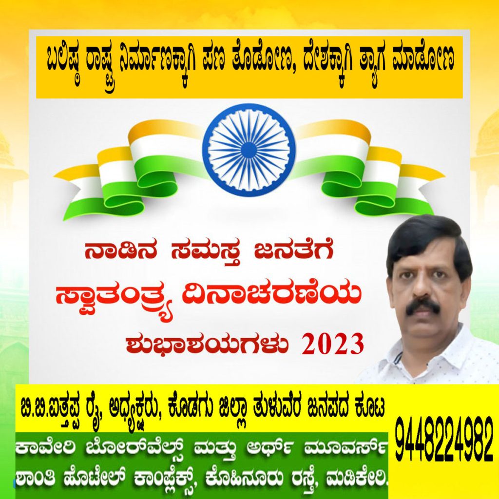 Share Facebook Twitter LinkedIn Pinterest WhatsApp Email ಮಡಿಕೇರಿ ಆ.15 : ನಾಡಿನ ಸಮಸ್ತ ಜನತೆಗೆ 77 ನೇ ಸ್ವಾತಂತ್ರ್ಯೋತ್ಸವದ ಶುಭಾಶಯಗಳು. ಬಲಿಷ್ಠ ರಾಷ್ಟ್ರ ನಿರ್ಮಾಣಕ್ಕಾಗಿ ಪಣ ತೊಡೋಣ, ದೇಶಕ್ಕಾಗಿ ತ್ಯಾಗ ಮಾಡೋಣ. (ಬಿ.ಬಿ.ಐತ್ತಪ್ಪ ರೈ, ಅಧ್ಯಕ್ಷರು, ಕೊಡಗು ಜಿಲ್ಲಾ ತುಳುವೆರ ಜನಪದ ಕೂಟ)