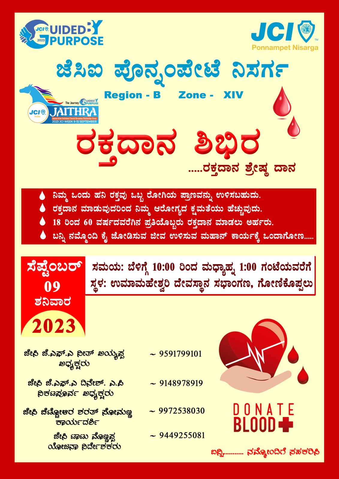 ಮಡಿಕೇರಿ ಸೆ.7 : ದಿನಾಂಕ 09-09-2023 ಶನಿವಾರದಂದು ಜೆಸಿಐ ಸಪ್ತಹ-2023ರ ಪ್ರಯುಕ್ತ ಸೆ.9 ರಂದು ಗೋಣಿಕೊಪ್ಪದಲ್ಲಿ ಸ್ವಯಂ ಪ್ರೇರಿತ ರಕ್ತದಾನ ಶಿಬಿರ ನಡೆಯಲಿದೆ.