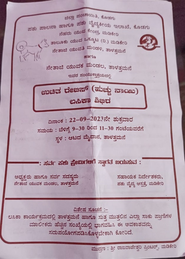 ಜಿಲ್ಲಾ ಪಂಚಾಯಿತಿ, ಕೊಡಗು ಪಶು ಪಲನಾ ಹಾಗೂ ಪಶು ವೈದ್ಯಕೀಯ ಇಲಾಖೆ, ಮಡಿಕೇರಿ ನೆಹರು ಯುವ ಕೇಂದ್ರ, ಮಡಿಕೇರಿ ತಾಲೂಕು ಯುವ ಒಕ್ಕೂಟ, ತಾಳತ್ತಮನೆ ನೇತಾಜಿ ಯುವತಿ ಮಂಡಳಿ ಹಾಗೂ ನೇತಾಜಿ ಯುವಕ ಮಂಡಲದ ಸಂಯುಕ್ತಶ್ರಾಯದಲ್ಲಿ ಬೆಳಿಗ್ಗೆ 9.30 ರಿಂದ 11.30 ಗಂಟೆಯವರೆಗೆ ತಾಳತ್ತಮನೆ ಆಟದ ಮೈದಾನದಲ್ಲಿ ಶಿಬಿರ ನಡೆಯಲಿದ್ದು, ತಾಳತ್ತಮನೆಯ ಹಾಗೂ ಸುತ್ತಮುತ್ತಲಿನ ಜನರು ತಮ್ಮ ಸಾಕು ಪ್ರಾಣಿಗಳನ್ನು ತರುವಂತೆ ನೇತಾಜಿ ಯುವಕ ಮಂಡಲದ ಅಧ್ಯಕ್ಷರು ಹಾಗೂ ಸರ್ವ ಸದಸ್ಯರು ಮನವಿ ಮಾಡಿದ್ದಾರೆ.