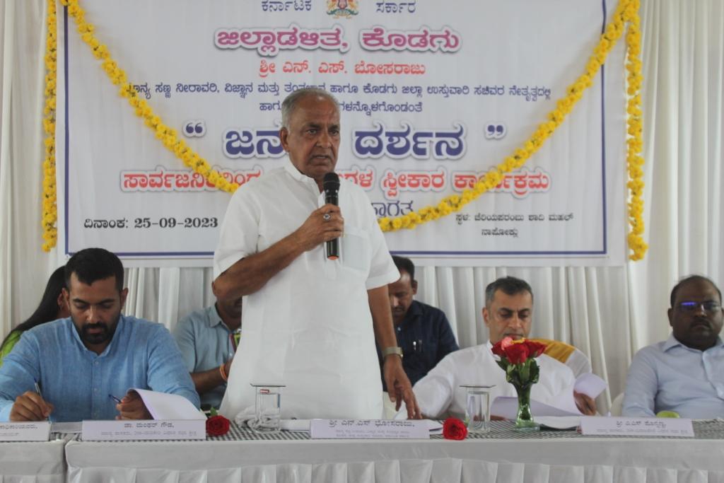 ಜನತಾ ದರ್ಶನ ಸಭೆಯ ಆರಂಭದಲ್ಲಿ ಮಾತನಾಡಿದ ಜಿಲ್ಲಾ ಉಸ್ತುವಾರಿ ಸಚಿವರಾದ ಎನ್.ಎಸ್.ಭೋಸರಾಜು ಅವರು ಜನರ ಬಳಿಗೆ ಸರ್ಕಾರದ ಆಡಳಿತ ಖುದ್ದು ಭೇಟಿ ಮಾಡಿ, ಗ್ರಾಮೀಣ ಜನರ ಸಮಸ್ಯೆಗಳನ್ನು ಆಲಿಸಿ ಪರಿಹರಿಸಬೇಕು ಎಂಬ ಉದ್ದೇಶದಿಂದ ಜನತಾ ಕಾರ್ಯಕ್ರಮವನ್ನು ಮುಖ್ಯಮಂತ್ರಿ ಅವರು ಎಲ್ಲಾ ಜಿಲ್ಲೆಗಳಲ್ಲಿ ಹಮ್ಮಿಕೊಳ್ಳುವಂತೆ ಸೂಚಿಸಿದ್ದಾರೆ. ಅದರಂತೆ ಕೊಡಗು ಜಿಲ್ಲೆಯಲ್ಲಿ ಗ್ರಾಮೀಣ ಪ್ರದೇಶದಲ್ಲಿ ಜನತಾ ದರ್ಶನ ಕಾರ್ಯಕ್ರಮ ಆಯೋಜಿಸಲಾಗಿದೆ ಎಂದರು.
