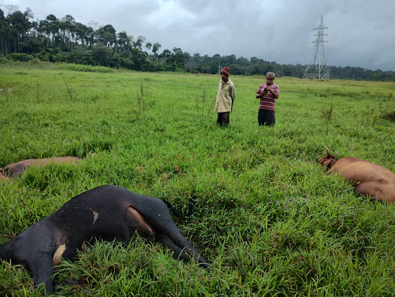 ಗ್ರಾಮದ ಆಲೆಮಾಡ ನಾಣಯ್ಯ ಅವರಿಗೆ ಸೇರಿದ ಹಸುಗಳನ್ನು ಭಾನುವಾರ ಮಧ್ಯಾಹ್ನ ಮೇಯಲು ಬಿಡಲಾಗಿತ್ತು. ಗದ್ದೆಯಲ್ಲಿ ವಿದ್ಯುತ್ ಮಾರ್ಗದ ವಿದ್ಯುತ್ ತಂತಿ ತುಂಡಾಗಿ ಬಿದ್ದಿದ್ದರಿಂದ ಮತ್ತು ತೇವಾಂಶ ಇದ್ದ ಪರಿಣಾಮ ವಿದ್ಯುತ್ ಹರಿದು ಸ್ಥಳದಲ್ಲಿಯೇ ಐದು ಜಾನುವಾರುಗಳು ಮೃತಪಟ್ಟಿವೆ.
