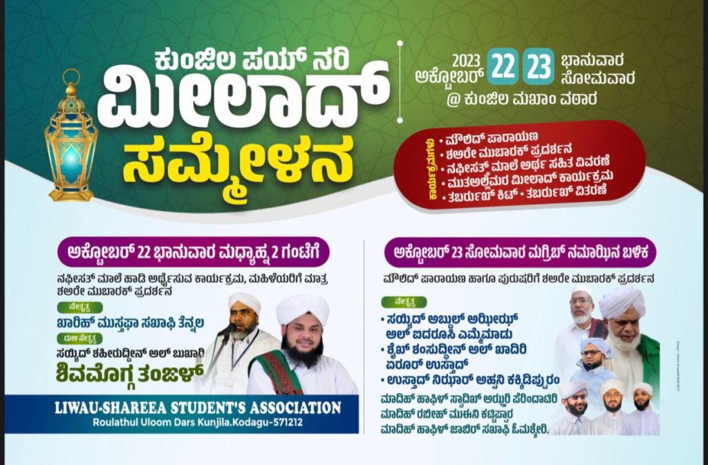 Share Facebook Twitter LinkedIn Pinterest WhatsApp Email ಕಕ್ಕಬ್ಬೆ ಅ.2 : ಕಕ್ಕಬ್ಬೆ ಸಮೀಪದಲ್ಲಿರುವ ಇತಿಹಾಸ ಪ್ರಸಿದ್ಧ ಪಯ್-ನರಿ ದರ್ಗಾ ವಠಾರದಲ್ಲಿ ಬೃಹತ್ ಮೀಲಾದ್ ಸಮ್ಮೇಳನ ಹಾಗೂ ಶಅರೇ ಮುಬಾರಕ್ ಪ್ರದರ್ಶನ ಅ.22 ಮತ್ತು 23 ರಂದು ನಡೆಯಲಿದೆ. ಪ್ರಮುಖ ಧರ್ಮಗುರುಗಳು ಹಾಗೂ ವಾಗ್ಮಿಗಳು ಪಾಲ್ಗೊಳ್ಳಲಿದ್ದಾರೆ ಎಂದು ಪ್ರಕಟಣೆ ತಿಳಿಸಿದೆ.