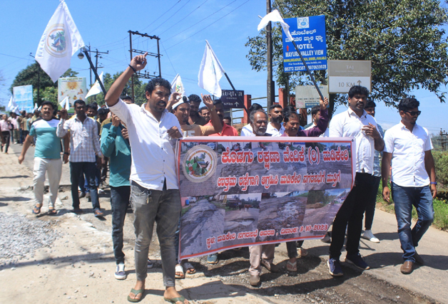 ಮಡಿಕೇರಿ ಅ.3 : ಮಡಿಕೇರಿ ನಗರದ ರಸ್ತೆಗಳ ಅಭಿವೃದ್ಧಿಗೆ ನಗರಸಭೆ ಯಾವುದೇ ಕಾಳಜಿ ತೋರುತ್ತಿಲ್ಲವೆಂದು ಆರೋಪಿಸಿ ಕೊಡಗು ರಕ್ಷಣಾ ವೇದಿಕೆ ನಗರದಲ್ಲಿ ಪ್ರತಿಭಟನೆ ನಡೆಸಿತು. ಸ್ಥಳಕ್ಕೆ ಆಗಮಿಸಿದ ಶಾಸಕ ಡಾ.ಮಂತರ್ ಗೌಡ ಅವರು ರಸ್ತೆ ದುರಸ್ತಿ ಸಂದರ್ಭ ಗುಣಮಟ್ಟ ಕಾಯ್ದುಕೊಳ್ಳುವ ಭರವಸೆ ನೀಡಿದರು.