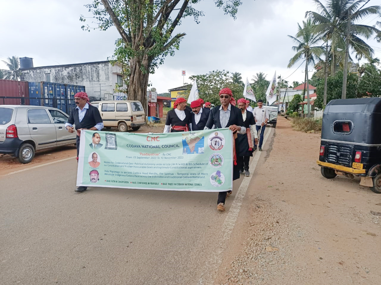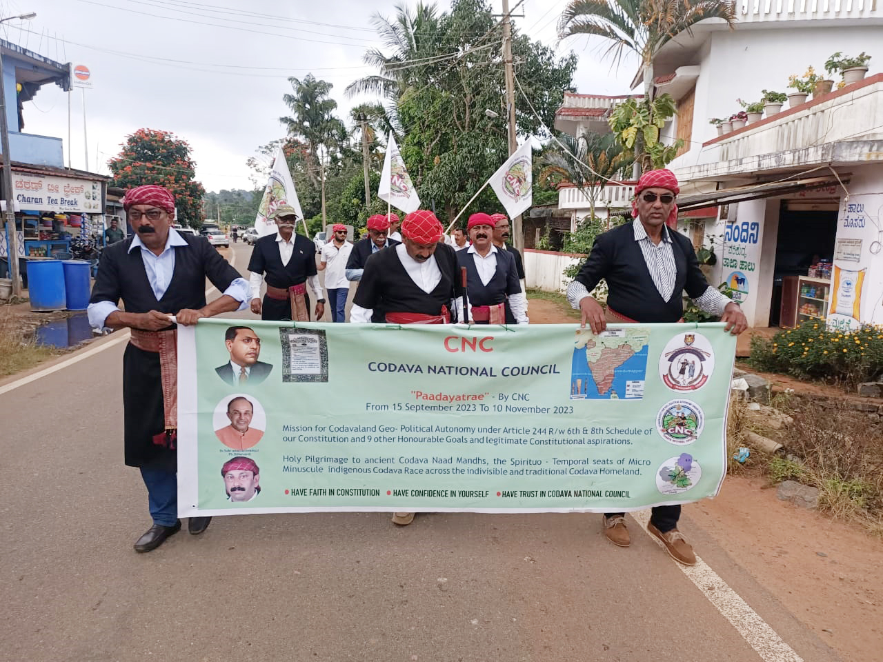 ಬಾಚರಣಿಯಂಡ ಚಿಪ್ಪಣ್ಣ, ಬೊಟ್ಟಂಗಡ ಗಿರೀಶ್ ಪೆಮ್ಮಯ್ಯ, ಕೊಟ್ರಂಗಡ ಉಷಾ ಮಾದಪ್ಪ, ಕಲ್ಲಂಗಡ ಬೋಪಯ್ಯ, ಅಜ್ಜಿಕುಟೀರ ಲೋಕೇಶ್, ಕೊಟ್ರಂಗಡ ಸನ್ನಿ, ಬೊಟ್ಟಂಗಡ ಸವಿ ಗಿರೀಶ್, ಬಾಚರಣಿಯಂಡ ಪ್ರಮೀಳಾ ಚಿಪ್ಪಣ್ಣ, ಕಲ್ಲಂಗಡ ತುಳಸಿ ಪೊನ್ನಣ್ಣ, ಮಾತ್ರಂಡ ಅನಿತಾ ಮಾದಪ್ಪ, ಮುಕ್ಕಾಟಿರ ದಿವ್ಯ ಸೋಮಣ್ಣ, ಮುಕ್ಕಾಟಿರ ಭವ್ಯ ಸುನಿಲ್, ಚೇಂದಂಡ ವಿಲ್ಮ ದೀಪಕ್, ಕೊಟ್ರಂಗಡ ಜಾಜಿ, ತೀತಿರ ಸೂರಜ್, ಮುಕ್ಕಾಟಿರ ದೇವಯ್ಯ, ಅಳ್ಮೇಂಗಡ ಮೋಟಯ್ಯ, ಕಲ್ಲಂಗಡ ಪೂಣಚ್ಚ, ಕಲ್ಲಂಗಡ ಗಣಪತಿ, ಕೊಟ್ರಂಗಡ ಅಪ್ಪಣ್ಣ, ಬಾಚಂಗಡ ಗಣಪತಿ, ಚೇಂದAಡ ದೀಪಕ್, ತೀರ್ಥೇಶ್ ತಿಮ್ಮಯ್ಯ, ನಿಶಾನ್ ಮಾದಪ್ಪ, ಮುದ್ದಿಯಡ ಸದಾ ಸೋಮಯ್ಯ, ಗುಡಿಯಂಗಡ ರಾಜ, ಮಾತ್ರಂಡ ಪೆಮ್ಮಯ್ಯ, ಕಾಳಿಮಾಡ ಹರೀಶ್, ಕಲ್ಲಂಗಡ ಶರಣು, ಕಲ್ಲಂಗಡ ಪೂವಣ್ಣ, ಮುಕ್ಕಾಟಿರ ಸೋಮಣ್ಣ, ಕಲ್ಲಂಗಡ ಚೆಂಗಪ್ಪ, ಕಲ್ಲಂಗಡ ಪೊನ್ನಣ್ಣ, ಕಲ್ಲಂಗಡ ಜಮುನ, ಅಜ್ಜಮಾಡ ಡೈಜಾ, ಅಜ್ಜಮಾಡ ಸಾವಿತ್ರಿ, ಅಜ್ಜಮಾಡ ಸುಮನ್, ಅಜ್ಜಮಾಡ ಅನಿತಾ, ಅಜ್ಜಮಾಡ ಪ್ರೇಮ ಬೋಪಣ್ಣ, ಅಜ್ಜಮಾಡ ದೀಕ್ಷ ಜಗತ್, ಅಜ್ಜಮಾಡ ತ್ಯಾಗಿ ಚೆಂಗಪ್ಪ, ಅಜ್ಜಮಾಡ ಶಿಲ್ಪ ಮಧು, ಅಜ್ಜಮಾಡ ರಚನ, ಅಜ್ಜಮಾಡ ಶೀಲ, ಅಜ್ಜಮಾಡ ಕಮಲ, ಅಜ್ಜಮಾಡ ಕಮಲ, ಅಜ್ಜಮಾಡ ಗುಲಾಬಿ, ಅಜ್ಜಮಾಡ ಚಿಮ್ಮ, ಅಜ್ಜಮಾಡ ಮೋಹನ, ಅಜ್ಜಮಾಡ ಬೋಪಣ್ಣ, ಅಜ್ಜಮಾಡ ಚೆಂಗಪ್ಪ, ಅಯ್ಯಮಾಡ ಉದಯ, ಅಯ್ಯಮಾಡ ಲೋಕೇಶ್, ಅಜ್ಜಮಾಡ ಲವ ಕುಶಾಲಪ್ಪ, ಅಜ್ಜಮಾಡ ಬಿಪಿನ್, ಅಜ್ಜಮಾಡ ಮಂದಣ್ಣ, ಅಜ್ಜಮಾಡ ರಮೇಶ್, ಎ.ಎಂ.ರಮೇಶ್, ಅಜ್ಜಮಾಡ ಜೀವನ್, ಅಜ್ಜಮಾಡ ಸಿದ್ದು, ಅಜ್ಜಿಕುಟ್ಟಿರ ರಾಯ್, ಅಯ್ಯಮಾಡ ಕಾರ್ಯಪ್ಪ, ಅಜ್ಜಮಾಡ ಸುರೇಶ್, ಅಜ್ಜಮಾಡ ದರ್ಶನ್, ಬೊಟ್ಟಂಗಡ ಜಪ್ಪು, ಜಮ್ಮಡ ಮೋಹನ್, ಕಾಂಡೇರ ಸುರೇಶ್, ಮಂದ್ರಿರ ಕರುಂಬಯ್ಯ, ಪಾರ್ವಂಗಡ ನವೀನ್ ಮತ್ತಿತರರು ಕೊಡವ ಸಾಂಪ್ರದಾಯಿಕ ಉಡುಪಿನಲ್ಲಿ ಪಾದಯಾತ್ರೆಯಲ್ಲಿ ಪಾಲ್ಗೊಂಡಿದ್ದರು. ಗಾಳಿಯಲ್ಲಿ ಗುಂಡು ಹಾರಿಸುವ ಮೂಲಕ ಸಭೆಯನ್ನು ಆರಂಭಿಸಲಾಯಿತು.