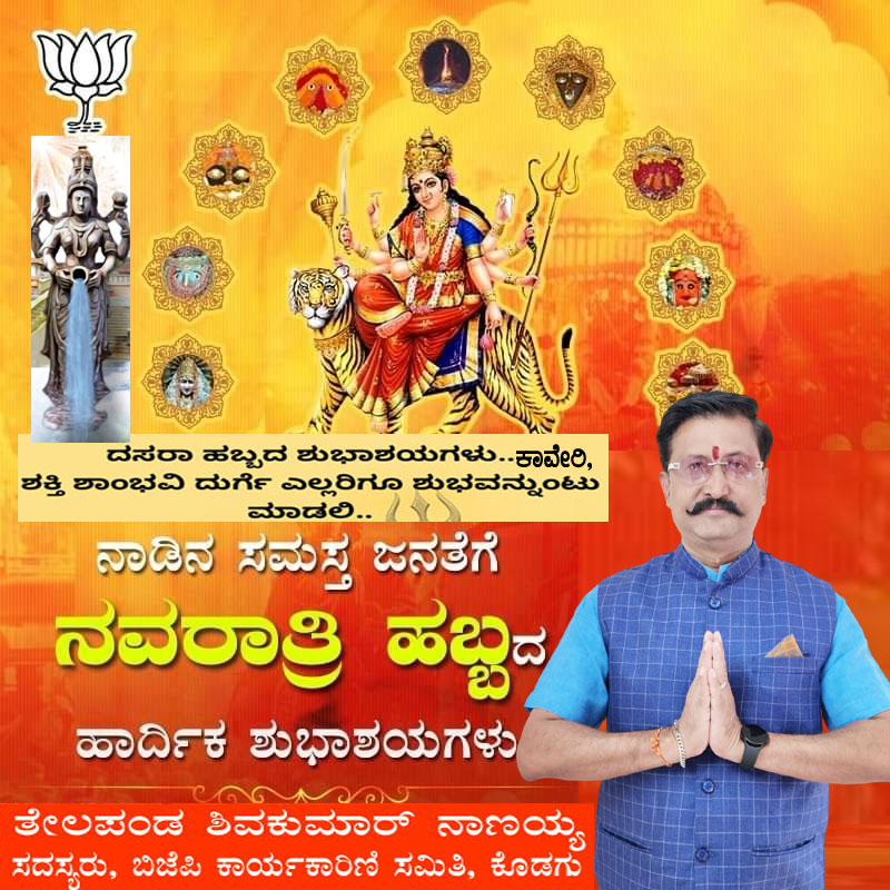 Share Facebook Twitter LinkedIn Pinterest WhatsApp Email *ದಸರಾ ಹಬ್ಬದ ಶುಭಾಶಯಗಳು : ಮಾತೆ ಕಾವೇರಿ ಹಾಗೂ ತಾಯಿ ದುರ್ಗೆ ಸರ್ವರಿಗೂ ಶುಭವನ್ನುಂಟು ಮಾಡಲಿ* (ತೇಲಪಂಡ ಶಿವಕುಮಾರ್ ನಾಣಯ್ಯ, ಸದಸ್ಯರು, ಕೊಡಗು ಜಿಲ್ಲಾ ಬಿಜೆಪಿ ಕಾರ್ಯಕಾರಿಣಿ ಸಮಿತಿ)