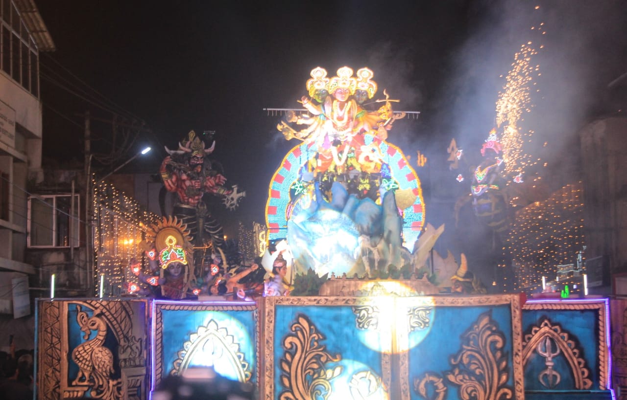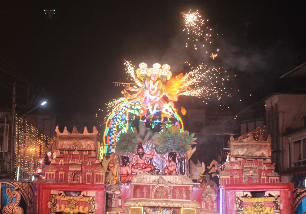 ನಗರದ ನಾಲ್ಕು ಶಕ್ತಿ ದೇವತೆಗಳಲ್ಲಿ ಒಂದಾದ ಶ್ರೀಕಂಚಿಕಾಮಾಕ್ಷಿ ಮುತ್ತು ಮಾರಿಯಮ್ಮ ದೇವಾಲಯ ದಸರಾ ಮಂಟಪ ಸಮಿತಿ 60ನೇ ವರ್ಷದ ಉತ್ಸವದಲ್ಲಿ ಶಿವನಿಂದ ತ್ರಿಪುರಾಸುರರ ವಧೆ ಕಥಾ ಸಾರಾಂಶವನ್ನು ಪ್ರಸ್ತುತ ಪಡಿಸಿತು.