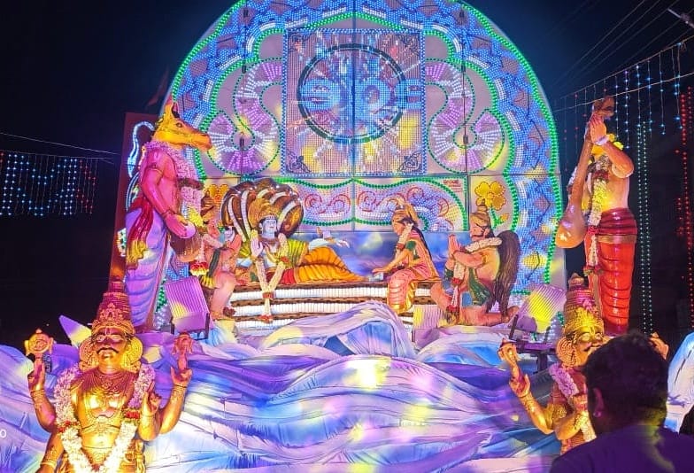 ಐತಿಹಾಸಿಕ ನಾಡಹಬ್ಬ ಮಡಿಕೇರಿ ದಸರಾ ಉತ್ಸವದಲ್ಲಿ ದಶಮಂಟಪಗಳ ಸಾರಥಿ ಎಂದೇ ಖ್ಯಾತಿ ಪಡೆದಿರುವ 150 ವರ್ಷಗಳ ಇತಿಹಾಸ ಹೊಂದಿರುವ ಪೇಟೆ ಶ್ರೀ ರಾಮಮಂದಿರ ದೇವಾಲಯ ದಸರಾ ಮಂಟಪ ಸಮಿತಿ ಈ ಬಾರಿ ಮಂಟಪದಲ್ಲಿ ವೈಕುಂಠ ದರ್ಶನ ಕಥಾ ಸಾರಾಂಶವನ್ನು ಪ್ರದರ್ಶಿಸಿತು.