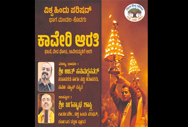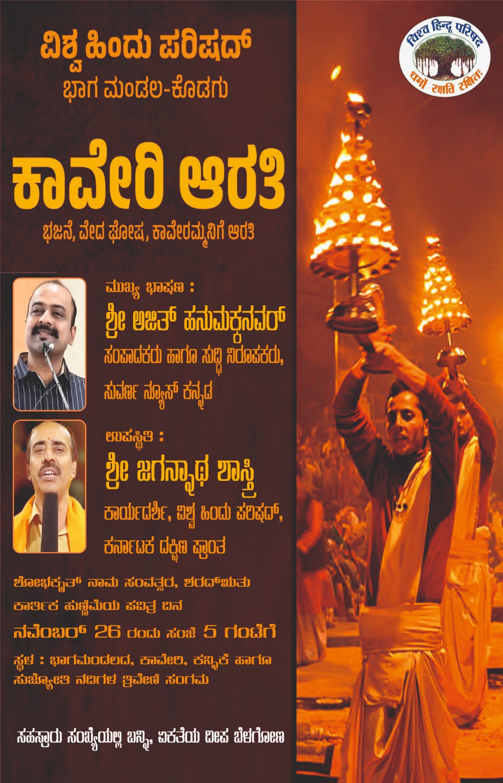 ಮಡಿಕೇರಿ ನ.23 : ವಿಶ್ವ ಹಿಂದು ಪರಿಷದ್ ವತಿಯಿಂದ ನ.26 ರಂದು ಭಾಗಮಂಡಲದಲ್ಲಿ ಕಾವೇರಿ ಆರತಿ ನಡೆಯಲಿದೆ.