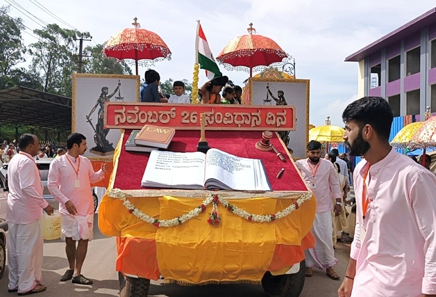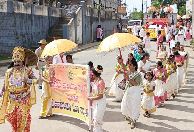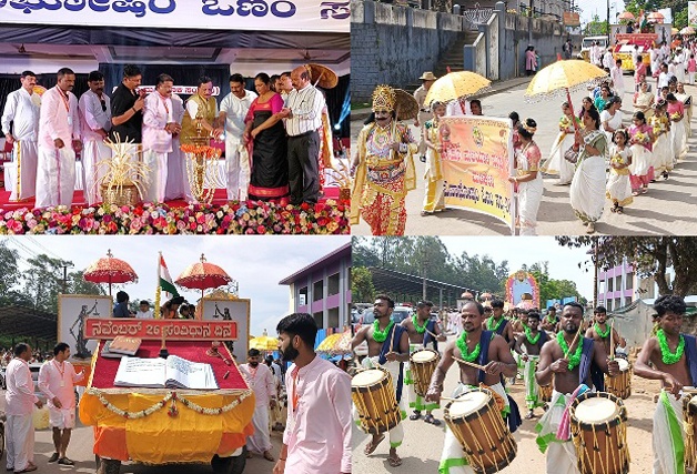 ಆಕರ್ಷಕ ಮೆರವಣಿಗೆ : ನಗರದ ಗಾಂದಿ ಮೈದಾನ ದಲ್ಲಿ ಮುಖ್ಯಬೀದಿಯಲ್ಲಿ ಸಾಗಿದ ಮೆರವಣಿಗೆ ಆಕರ್ಷಕವಾಗಿ ಮೂಡಿಬಂತು. ಸಾಂಪ್ರದಾಯಿಕ ಉಡುಗೆ ತೊಟ್ಟು ಪುರುಷ ಮಹಿಳೆಯರು ಮೆರವಣಿಗೆಯಲ್ಲಿ ಪಾಲ್ಗೊಂಡರು. ಜೊತೆಗೆ ಪುಟಾಣಿಗಳು ಛದ್ಮವೇಷ ಧರಿಸಿ ಗಮನಸೆಳೆದರು. ಮೆರವಣಿಗೆಯಲ್ಲಿ ವಿಶೇಷವಾಗಿ ಸಂವಿಧಾನ ಪೀಠಿಕೆ ಇರುವ ರಥ ಸಾಗಿತು. ಇದರೊಂದಿಗೆ ಕೇರಳದ ಚಂಡೆ ವಾದ್ಯ ಆಕರ್ಷಕವಾಗಿತ್ತು. ಕಾವೇರಿ ಹಾಲ್ನಲ್ಲಿ ಮಹಿಳೆಯರು ರಚಿಸಿದ್ದ ಹೂವಿನ ರಂಗೋಲಿಗಳು (ಪೊಕೊಳಂ) ಜನಮನ ಸೆಳೆದವು.