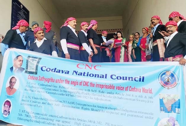 ನಗರದಲ್ಲಿ ಜಿಲ್ಲಾಧಿಕಾರಿಗಳ ಕಚೇರಿ ಎದುರು ಶಾಂತಿಯುವ ಧರಣಿ ಸತ್ಯಾಗ್ರಹ ನಡೆಸಿದ ಸಿಎನ್ಸಿ ಅಧ್ಯಕ್ಷ ಎನ್.ಯು.ನಾಚಪ್ಪ ಹಾಗೂ ಪ್ರಮುಖರು ಅಂತರರಾಷ್ಟ್ರೀಯ ಕಾನೂನಿನಡಿ ಕೊಡವರಿಗೆ ಮಾನ್ಯತೆ, ಕೊಡವ ಲ್ಯಾಂಡ್ ಭೂರಾಜಕೀಯ ಸ್ವಾಯತ್ತತೆ ಮತ್ತು ಕೊಡವರಿಗೆ ಎಸ್ಟಿ ಟ್ಯಾಗ್ ನೀಡಬೇಕೆಂದು ಒತ್ತಾಯಿಸಿದರು.