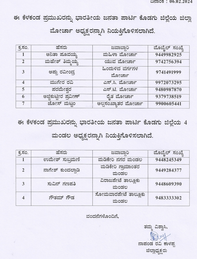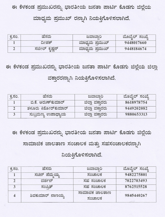 ಜಿಲ್ಲಾ ವಕ್ತಾರರಾಗಿ ಬಿ.ಕೆ.ಅರುಣ್ ಕುಮಾರ್, ತಳೂರು ಕಿಶೋರ್ ಕುಮಾರ್, ಸುಬ್ರಮಣ್ಯ ಉಪಾಧ್ಯಾಯ, ಉಪಾಧ್ಯಕ್ಷರುಗಳಾಗಿ ಹೆಚ್.ಕೆ.ಮಾದಪ್ಪ, ಅರುಣ್ ಭೀಮಯ್ಯ, ಕಿಲನ್ ಗಣಪತಿ, ಆರ್.ಕೆ.ಚಂದ್ರು, ಭವ್ಯ ಅಪ್ಪಡೇರಂಡ, ಕಾಂಗೀರ ಸತೀಶ್ ಅಶ್ವಿನ್, ಮನು ಮಂಜುನಾಥ್, ಮನು ಕುಮಾರ್ ರೈ, ಕಾರ್ಯದರ್ಶಿಗಳಾಗಿ ಪ್ರಶಾಂತ್ ಭೀಮಯ್ಯ, ಕನ್ನಿಕೆ, ಮಲಚೀರ ಕವಿತ, ಉಮಾ ಪ್ರಭು, ಇಂದಿರಾ ರಮೇಶ್, ಅನಂತ ಕುಮಾರ್, ಜಯವರ್ಧನ, ಬೀನಾ ಬೊಳ್ಳಮ್ಮ, ಕೋಶಾಧಿಕಾರಿಯಾಗಿ ಕನ್ನಂಡ ಸಂಪತ್, ಮಾಧ್ಯಮ ಪ್ರಮುಖ್ ರಾಗಿ ದೀಪಕ್, ಸಜೀಲ್ ಕೃಷ್ಣನ್, ಸಾಮಾಜಿಕ ಜಾಲತಾಣ ಸಂಚಾಲಕರಾಗಿ ಸಚಿನ್ ಪೆಮ್ಮಯ್ಯ, ಸಹ ಸಂಚಾಲಕರಾಗಿ ದರ್ಶನ್, ಸಂಪ್ರೀತ್, ಸಾಮಾಜಿಕ ಜಾಲತಾಣದ ಸಂಚಾಲಕರಾಗಿ ಶಿವಕುಮಾರ್ ನಾಣಯ್ಯ, ಯುವ ಮೋರ್ಚಾದ ಜಿಲ್ಲಾಧ್ಯಕ್ಷರಾಗಿ ಮಹೇಶ್ ತಿಮ್ಮಯ್ಯ, ಹಿಂದುಳಿದ ವರ್ಗಗಳ ಮೋರ್ಚಾದ ಜಿಲ್ಲಾಧ್ಯಕ್ಷರಾಗಿ ಅಪ್ರು ರವೀಂದ್ರ, ಎಸ್ಸಿ ಮೋರ್ಚಾದ ಜಿಲ್ಲಾಧ್ಯಕ್ಷರಾಗಿ ಪಿ.ಎಂ.ರವಿ, ಎಸ್ಟಿ ಮೋರ್ಚಾದ ಜಿಲ್ಲಾಧ್ಯಕ್ಷರಾಗಿ ಪರಮೇಶ್ವರ, ರೈತ ಮೋರ್ಚಾದ ಜಿಲ್ಲಾಧ್ಯಕ್ಷರಾಗಿ ಅಜ್ಜಿಕುಟ್ಟೀರ ಪ್ರವೀಣ್, ಅಲ್ಪಸಂಖ್ಯಾತರ ಮೋರ್ಚಾದ ಜಿಲ್ಲಾಧ್ಯಕ್ಷರಾಗಿ ಜೋಸ್ ಮಟ್ಟಂ, ಮಡಿಕೇರಿ ನಗರ ಮಂಡಲದ ಅಧ್ಯಕ್ಷರಾಗಿ ಉಮೇಶ್ ಸುಬ್ರಮಣಿ, ಮಡಿಕೇರಿ ಗ್ರಾಮಾಂತರ ಮಂಡಲ ಅಧ್ಯಕ್ಷರಾಗಿ ನಾಗೇಶ್ ಕುಂದಲ್ಪಾಡಿ, ವಿರಾಜಪೇಟೆ ತಾಲ್ಲೂಕು ಮಂಡಲ ಅಧ್ಯಕ್ಷರಾಗಿ ಸುವಿನ್ ಗಣಪತಿ ಹಾಗೂ ಸೋಮವಾರಪೇಟೆ ತಾಲ್ಲೂಕು ಮಂಡಲ ಅಧ್ಯಕ್ಷರಾಗಿ ಗೌತಮ್ ಗೌಡ ನಿಯೋಜನೆಗೊಂಡಿದ್ದಾರೆ.