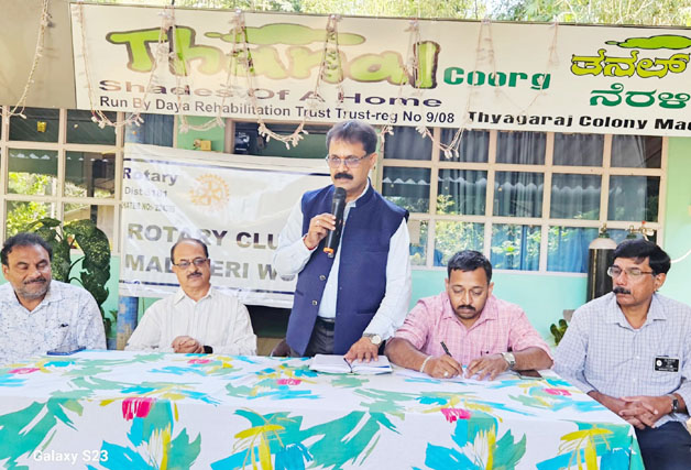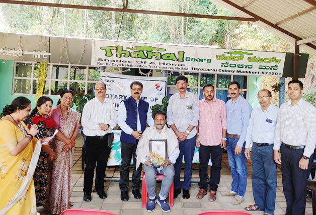 ತನಾಲ್ ಆಶ್ರಮದಲ್ಲಿ ನಡೆದ ಸರಳ ಸಮಾರಂಭದಲ್ಲಿ ರೋಟರಿ ಮಡಿಕೇರಿ ವುಡ್ಸ್ನ ಪ್ರಮುಖರು ಗಾಲಿ ಕುರ್ಚಿಯನ್ನು ಹಸ್ತಾಂತರಿಸಿದರು.