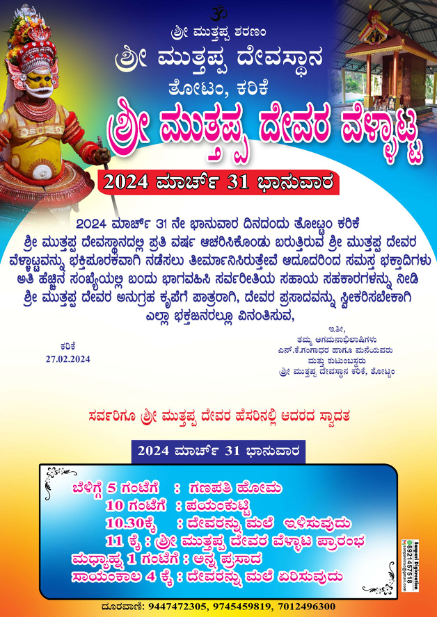 ಅಂದು ಮುಂಜಾನೆ 5 ಗಂಟೆಗೆ ಗಣಪತಿ ಹೋಮ, ಬೆಳಿಗ್ಗೆ 10 ಗಂಟೆ ಪಯಂಕುಟ್ಟಿ, 10.30ಕ್ಕೆ ದೇವರನ್ನು ಮಲೆ ಇಳಿಸುವುದು, 11 ಗಂಟೆಗೆ ಶ್ರೀ ಮುತ್ತಪ್ಪ ದೇವರ ವೆಳ್ಳಾಟ ಪ್ರಾರಂಭವಾಗಲಿದೆ.
