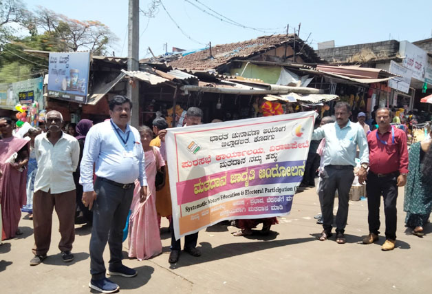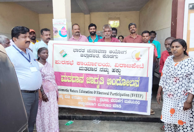 ವಿರಾಜಪೇಟೆ ಪುರಸಭೆ ವ್ಯಾಪ್ತಿಯ ಖಾಸಗಿ ಬಸ್ ನಿಲ್ದಾಣ, ಮಾರುಕಟ್ಟೆ ಪ್ರದೇಶ ಸೇರಿದಂತೆ ಪಟ್ಟಣದ ಪ್ರಮುಖ ಬೀದಿಗಳಲ್ಲಿ ಮತದಾನದ ಜಾಗೃತಿ ಮೂಡಿಸಲಾಯಿತು.