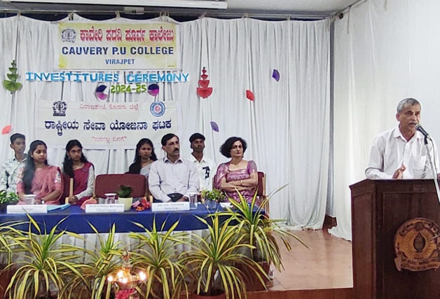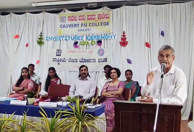 ವಿರಾಜಪೇಟೆ NEWS DESK ಆ.27 : ವಿರಾಜಪೇಟೆ ಕಾವೇರಿ ಪದವಿಪೂರ್ವ ಕಾಲೇಜು 2024-25ನೇ ಶೈಕ್ಷಣಿಕ ಸಾಲಿನ ವಿದ್ಯಾರ್ಥಿ ಕ್ಷೇಮಾಭಿವೃದ್ಧಿ ಸಂಘ ಹಾಗೂ ರಾಷ್ಟ್ರೀಯ ಸೇವಾ ಯೋಜನೆ ಘಟಕದ ಉದ್ಘಾಟನಾ ಸಮಾರಂಭ ಕಾಲೇಜಿನ ಸಭಾಂಗಣದಲ್ಲಿ ನಡೆಯಿತು. ಕಾರ್ಯಕ್ರಮದಲ್ಲಿ ಮುಖ್ಯ ಅತಿಥಿಗಳಾಗಿ ಪಾಲ್ಗೊಂಡ ಪೊನ್ನಂಪೇಟೆ ಕೊಡವ ಸಮಾಜದ ಅಧ್ಯಕ್ಷ ಕಾಳಿಮಾಡ ಮೋಟಯ್ಯ ಅವರು ಆಯ್ಕೆಯಾದ ಪದಾಧಿಕಾರಿಗಳಿಗೆ ಪ್ರತಿಜ್ಞಾವಿಧಿ ಬೋಧಿಸಿದರು.