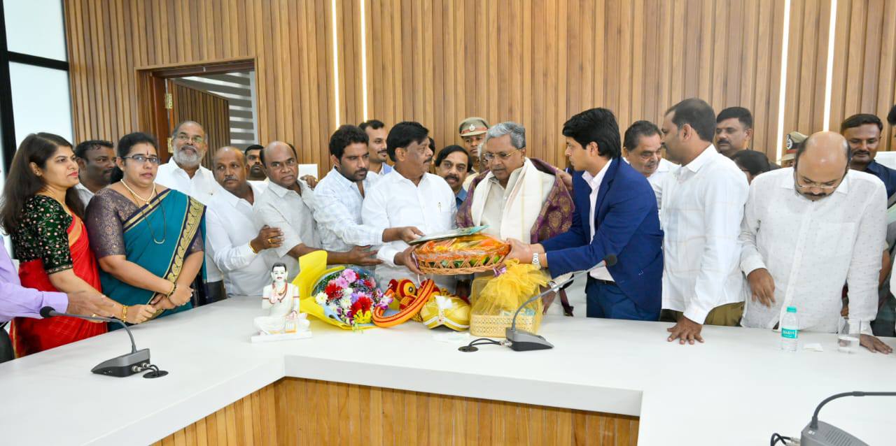 ಮೈಸೂರು ಸೆ.26 NEWS DESK : ಮೈಸೂರು ಜಿಲ್ಲಾ ಉಸ್ತುವಾರಿ ಸಚಿವರಾದ ಹೆಚ್.ಸಿ.ಮಹದೇವಪ್ಪ ಅವರ ನೇತೃತ್ವದಲ್ಲಿ ಮೈಸೂರು ಜಿಲ್ಲಾಧಿಕಾರಿಗಳು ಹಾಗೂ ಜಿಲ್ಲಾ ಮಟ್ಟದ ಅಧಿಕಾರಿಗಳು ಇಂದು ಸಿದ್ದರಾಮಯ್ಯ ಅವರನ್ನು ನಾಡ ಹಬ್ಬ ದಸರಾಗೆ ಆಹ್ವಾನಿಸಿದರು. ಈ ಸಂದರ್ಭ ಮುಖ್ಯಮಂತ್ರಿಗಳ ರಾಜಕೀಯ ಕಾರ್ಯದರ್ಶಿ ಗೋವಿಂದರಾಜು ಮತ್ತು ಮೈಸೂರು ಮತ್ತು ಚಾಮರಾಜನಗರ ಜಿಲ್ಲೆಯ ಶಾಸಕರುಗಳು, ನಾಯಕರು ಉಪಸ್ಥಿತರಿದ್ದರು.