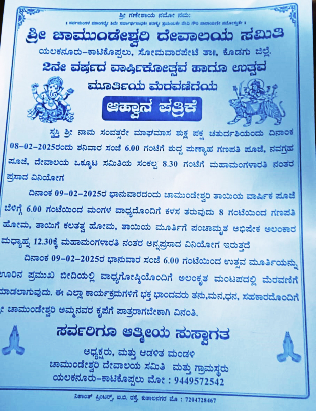 ಮಡಿಕೇರಿ ಫೆ.8 NEWS DESK : ಯಲಕನೂರು-ಕಾಟಿಕೊಪ್ಪಲು ಶ್ರೀ ಚಾಮುಂಡೇಶ್ವರಿ ದೇವಾಲಯದ ಎರಡನೇ ವಾರ್ಷಿಕೋತ್ಸವ ಹಾಗೂ ಉತ್ಸವ ಮೂರ್ತಿಯ ಮೆರವಣಿಗೆ ಫೆ.8 ಮತ್ತು 9 ರಂದು ನಡೆಯಲಿದೆ. ದೇವಾಲಯದಲ್ಲಿ ಎರಡು ದಿನಗಳ ಕಾಲ ವಿವಿಧ ಧಾರ್ಮಿಕ ಪೂಜಾ ಕೈಂಕರ್ಯಗಳು ಜರುಗಲಿದೆ. ಫೆ.8 ರಂದು ಸಂಜೆ 6 ಗಂಟೆಗೆ ಶುದ್ದ ಪುಣ್ಯಾಹ ಗಣಪತಿ ಪೂಜೆ, ನವಗ್ರಹ ಪೂಜೆ, ದೇವಾಲಯ ಒಕ್ಕೂಟ ಸಮಿತಿಯ ಸಂಕಲ್ಪ, 8.30 ಗಂಟೆಗೆ ಮಹಾಮಂಗಳಾರತಿ ಹಾಗೂ ಪ್ರಸಾದ ವಿತರಣೆ ನಡೆಯಲಿದೆ. ಫೆ.9 ರಂದು ಚಾಮುಂಡೇಶ್ವರಿ ತಾಯಿಯ ವಾರ್ಷಿಕ ಪೂಜೆ ಜರುಗಲಿದ್ದು, ಬೆಳಿಗ್ಗೆ 6 ಗಂಟೆಗೆ ಮಂಗಳ ವಾಧ್ಯದೊಂದಿಗೆ ಕಳಸ ತರುವುದು, 8 ಗಂಟೆಯಿಂದ ಗಣಪತಿ ಹೋಮ, ತಾಯಿಗೆ ಕಲತತ್ವ ಹೋಮ, ತಾಯಿಯ ಮೂರ್ತಿಗೆ ಪಂಚಾಮೃತ ಅಭಿಷೇಕ, ಅಲಂಕಾರ, ಮಧ್ಯಾಹ್ನ 12.30ಕ್ಕೆ ಮಹಾಮಂಗಳಾರತಿ ನಡೆಯಲಿದೆ. ನಂತರ ಅನ್ನಪ್ರಸಾದ ವಿನಿಯೋಗ ನೆರವೇರಲಿದೆ. ಸಂಜೆ 6 ಗಂಟೆಯಿಂದ ಉತ್ಸವ ಮೂರ್ತಿಯನ್ನು ಊರಿನ ಪ್ರಮುಖ ಬೀದಿಯಲ್ಲಿ ವಾಧ್ಯಗೋಷ್ಠಿಯೊಂದಿಗೆ ಅಲಂಕೃತ ಮಂಟಪದಲ್ಲಿ ಮೆರವಣಿಗೆ ಮಾಡಲಾಗುವುದು. ಭಕ್ತಾಧಿಗಳು ಹೆಚ್ಚಿನ ಸಂಖ್ಯೆಯಲ್ಲಿ ಪಾಲ್ಗೊಳ್ಳುವಂತೆ ದೇವಾಲಯದ ಆಡಳಿತ ಮಂಡಳಿ ಕೋರಿದೆ.