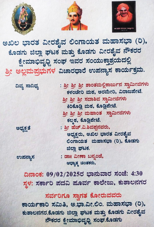 ಮಡಿಕೇರಿ ಫೆ.8 NEWS DESK : ಅಖಿಲ ಭಾರತ ವೀರಶೈವ ಲಿಂಗಾಯತ ಮಹಾಸಭಾ ಕೊಡಗು ಜಿಲ್ಲಾ ಘಟಕ ಮತ್ತು ಕೊಡಗು ವೀರಶೈವ ನೌಕರರ ಕ್ಷೇಮಾಭಿವೃದ್ಧಿ ಸಂಘದ ಸಂಯುಕ್ತಾಶ್ರಯದಲ್ಲಿ ಫೆ.9 ರಂದು ಕುಶಾಲನಗರದಲ್ಲಿ ಶ್ರೀ ಅಲ್ಲಮಪ್ರಭುಗಳ ವಿಚಾರಧಾರೆ ಉಪನ್ಯಾಸ ಕಾರ್ಯಕ್ರಮ ನಡೆಯಲಿದೆ. ಕುಶಾಲನಗರ ಸರ್ಕಾರಿ ಪದವಿ ಪೂರ್ವ ಕಾಲೇಜಿನಲ್ಲಿ ಸಂಜೆ 4.30 ಗಂಟೆಗೆ ವಿರಾಜಪೇಟೆ ಅರಮೇರಿ ಕಳಂಚೇರಿ ಮಠದ ಶ್ರೀ ಶಾಂತಮಲ್ಲಿಕಾರ್ಜುನ ಸ್ವಾಮಿಜಿ, ಕೊಡ್ಲಿಪೇಟೆ ಕಿರಿಕೊಡ್ಲಿ ಮಠದ ಶ್ರೀ ಸದಾಶಿವ ಸ್ವಾಮೀಜಿ, ಕೊಡ್ಲಿಪೇಟೆ ಕಲ್ಮಠ ಶ್ರೀ ಮಹಾಂತ ಸ್ವಾಮೀಜಿಗಳ ದಿವ್ಯ ಸಾನಿಧ್ಯದಲ್ಲಿ ನಡೆಯಲಿದ್ದು, ಅಧ್ಯಕ್ಷತೆಯನ್ನು ಅಖಿಲ ಭಾರತ ವೀರಶೈವ ಲಿಂಗಾಯತ ಮಹಾಸಭಾ ಕೊಡಗು ಜಿಲ್ಲಾ ಘಟಕದ ಅಧ್ಯಕ್ಷ ಹೆಚ್.ವಿ.ಶಿವಪ್ಪ ಅಧ್ಯಕ್ಷತೆಯಲ್ಲಿ ನಡೆಯಲಿದೆ. ಆಧ್ಯಾತ್ಮ ಚಿಂತಕರಾದ ಡಾ.ವೀಣಾ ಬನ್ನಂಜೆ ಉಪನ್ಯಾಸ ನೀಡಲಿದ್ದಾರೆ.