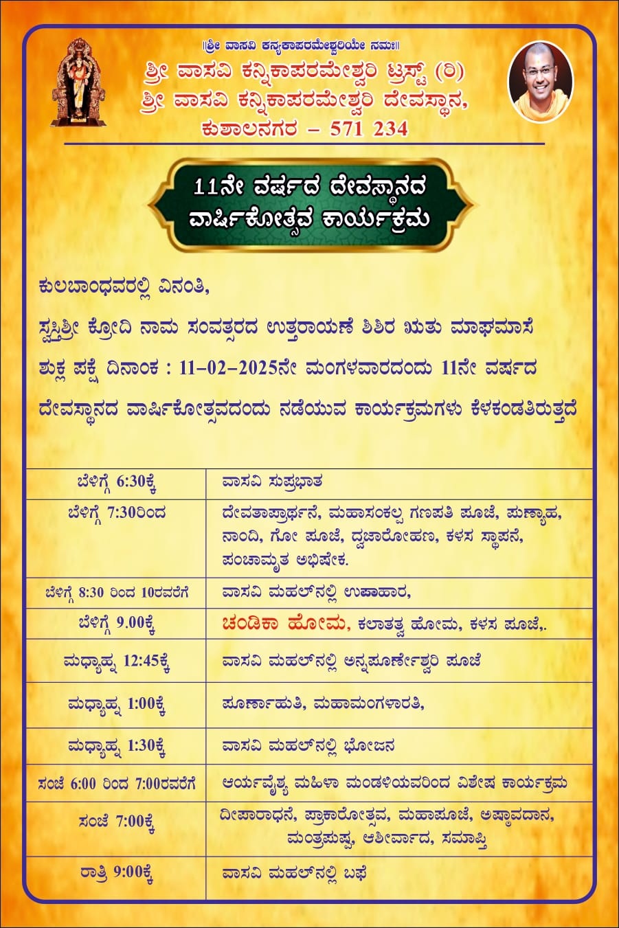 ಕುಶಾಲನಗರ NEWS DESK ಫೆ.9 : ಕುಶಾಲನಗರದ ರಥ ಬೀದಿಯಲ್ಲಿರುವ ಗೋಲ್ಡನ್ ಟೆಂಪಲ್ ಎಂದೇ ಖ್ಯಾತಿ ಗಳಿಸಿರುವ ಶ್ರೀಮದ್ ವಾಸವಿ ಕನ್ನಿಕಾಪರಮೇಶ್ವರಿ ದೇವಸ್ಥಾನದ 11 ನೇ ವಾರ್ಷಿಕೋತ್ಸವ ಫೆ.11 ರಂದು ನಡೆಯಲಿದೆ ಎಂದು ಶ್ರೀ ವಾಸವಿ ಕನ್ನಿಕಾಪರಮೇಶ್ವರಿ ಟ್ರಸ್ಟ್ ನ ಅಧ್ಯಕ್ಷ ಬಿ.ಎಲ್.ಉದಯ್ ಕುಮಾರ್ ತಿಳಿಸಿದ್ದಾರೆ. ಮಂಗಳವಾರ ಬೆಳಿಗ್ಗೆ 6.30 ಕ್ಕೆ ವಾಸವಿ ಸುಪ್ರಭಾತ, 7.30 ಕ್ಕೆ ದೇವತಾ ಪ್ರಾರ್ಥನೆ, ಮಹಾಸಂಕಲ್ಪ ಗಣಪತಿ ಪೂಜೆ, ಪುಣ್ಯಾಹ, ನಾಂದಿ, ಗೋ ಪೂಜೆ, ಧ್ವಜಾರೋಹಣ, ಕಳಸ ಸ್ಥಾಪನೆ, ಪಂಚಾಮೃತ ಅಭಿಷೇಕ, 9 ಗಂಟೆಗೆ ಚಂಡಿಕಾ ಹೋಮ, ಕಲಾತ್ವತ ಹೋಮ, ಕಳಸ ಪೂಜೆ, 1 ಗಂಟೆಗೆ ಪೂರ್ಣಾಹುತಿ, ಮಹಾ ಮಂಗಳಾರತಿ ದೇವಸ್ಥಾನದ ಅರ್ಚಕರಾದ ಗಿರೀಶ್ ಭಟ್ ಮತ್ತು ಯೋಗೀಶ್ ಭಟ್ ನೇತೃತ್ವದಲ್ಲಿ ನಡೆಯಲಿದೆ. ಸಂಜೆ 6 ಗಂಟೆಯಿಂದ 7 ಗಂಟೆ ವರೆಗೆ ಆರ್ಯವೈಶ್ಯ ಮಹಿಳಾ ಮಂಡಳಿ ವತಿಯಿಂದ ವಿಶೇಷ ಕಾರ್ಯಕ್ರಮವನ್ನು ಆಯೋಜಿಸಲಾಗಿದೆ ಎಂದು ಅಧ್ಯಕ್ಷೆ ಲಕ್ಷ್ಮಿ ಶ್ರೀನಿವಾಸ್ ತಿಳಿಸಿದ್ದಾರೆ. 7 ಗಂಟೆಯ ನಂತರ ದೀಪಾರಾಧನೆ, ಪ್ರಾಕಾರೋತ್ಸವ, ಮಹಾಪೂಜೆ, ಅಷ್ಟಾವಧಾನ, ಮಂತ್ರ ಪುಷ್ಪ, ಆಶೀರ್ವಾದದೊಂದಿಗೆ ಎಲ್ಲಾ ಧಾರ್ಮಿಕ ಕಾರ್ಯಕ್ರಮಗಳು ಸಂಪನ್ನಗೊಳ್ಳಲಿದೆ.