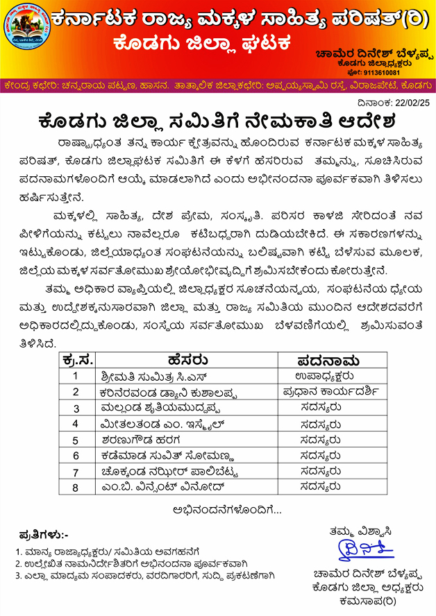 ವಿರಾಜಪೇಟೆ, ಫೆ.24 NEWS DESK : ಕರ್ನಾಟಕ ರಾಜ್ಯ ಮಕ್ಕಳ ಸಾಹಿತ್ಯ ಪರಿಷತ್ ಕೊಡಗು ಜಿಲ್ಲೆಯ ಎಲ್ಲಾ ತಾಲ್ಲೂಕುಗಳ ಅಧ್ಯಕ್ಷರನ್ನು ನೇಮಕಮಾಡಿ, ಜಿಲ್ಲಾ ಅಧ್ಯಕ್ಷ ಚಾಮೆರ ದಿನೇಶ್ ಬೆಳ್ಯಪ್ಪ ಆದೇಶಿಸಿದ್ದಾರೆ. ಮಡಿಕೇರಿ ತಾಲ್ಲೂಕು ಅಧ್ಯಕ್ಷರಾಗಿ ಪಾಲೇರ ಮಂದಣ್ಣ, ಸೋಮವಾರಪೇಟೆ ತಾಲ್ಲೂಕು ಅಧ್ಯಕ್ಷರಾಗಿ ಅಪ್ಪುಡ ಸುದೀಶ್ ಕುಶಾಲಪ್ಪ, ವಿರಾಜಪೇಟೆ ತಾಲ್ಲೂಕು ಅಧ್ಯಕ್ಷರಾಗಿ ವಿಜಯ್ ಪೂಜಾರಿ, ಪೊನ್ನಂಪೇಟೆ ತಾಲ್ಲೂಕು ಅಧ್ಯಕ್ಷರಾಗಿ ಬೊಟ್ಟಂಗಡ ಸುಮನ್ ಸೀತಮ್ಮ, ಕುಶಾಲನಗರ ತಾಲ್ಲೂಕು ಅಧ್ಯಕ್ಷರಾಗಿ ಸಿಂಚನ ಸಿ.ಮೋಹನ್ ಅವರುಗಳನ್ನು ಆಯ್ಕೆ ಮಾಡಲಾಗಿದ್ದು, ತಕ್ಷಣದಿಂದ ತಾಲ್ಲೂಕು ಉಪಾಧ್ಯಕ್ಷರು, ಪ್ರಧಾನ ಕಾರ್ಯದರ್ಶಿಗಳನ್ನು ಒಳಗೊಂಡಂತೆ ಸದಸ್ಯರನ್ನು ನೇಮಿಸಿ, ಜಿಲ್ಲೆಯಲ್ಲಿ ಮಕ್ಕಳ ಸಾಹಿತ್ಯ ಪರಿಷತ್ ಬೆಳವಣಿಗೆಗೆ ಪೂರಕ ಕಾರ್ಯಯೋಜನೆ ಸಿದ್ದಪಡಿಸುವಂತೆ ತಿಳಿಸಲಾಗಿದೆ ಎಂದು ಚಾಮೆರ ದಿನೇಶ್ ಬೆಳ್ಯಪ್ಪ ಹೇಳಿದ್ದಾರೆ.