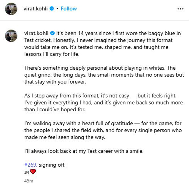 ಈ ಕುರಿತಂತೆ ಸಾಮಾಜಿಕ ಜಾಲತಾಣದಲ್ಲಿ ಪೋಸ್ಟ್ ಹಂಚಿಕೊಂಡಿದ್ದು ಕೊಹ್ಲಿ ಅಧಿಕೃತವಾಗ ನಿವೃತ್ತಿ ಘೋಷಿಸಿದ್ದಾರೆ. 14 ವರ್ಷಗಳ ತಮ್ಮ ಟೆಸ್ಟ್ ಕೆರಿಯರ್ಗೆ ವಿರಾಮ ಇಟ್ಟಿರುವ ಕಿಂಗ್ ಕೊಹ್ಲಿ ಏಕದಿನ ಕ್ರಿಕೆಟ್ನಲ್ಲಿ ಮಾತ್ರ ಮುಂದುವರೆಯುವುದಾಗಿ ತಿಳಿಸಿದ್ದಾರೆ. ಇದಕ್ಕೂ ಮುನ್ನ 2024 ರಲ್ಲಿ ನಡೆದ ಟಿ20 ವಿಶ್ವಕಪ್ನ ಫೈನಲ್ ಪಂದ್ಯದ ಬೆನ್ನಲ್ಲೇ ಕೊಹ್ಲಿ ಟಿ20 ಅಂತಾರಾಷ್ಟ್ರೀಯ ಕ್ರಿಕೆಟ್ಗೆ ವಿದಾಯ ಹೇಳಿದ್ದರು. ಟೀಮ್ ಇಂಡಿಯಾ ಪರ 123 ಟೆಸ್ಟ್ ಪಂದ್ಯಗಳಲ್ಲಿ ಕಣಕ್ಕಿಳಿದಿರುವ ಅವರು 210 ಇನಿಂಗ್ಸ್ಗಳಲ್ಲಿ ಬ್ಯಾಟ್ ಬೀಸಿದ್ದಾರೆ. ಈ ವೇಳೆ 16608 ಎಸೆತಗಳನ್ನು ಎದುರಿಸಿರುವ ಕೊಹ್ಲಿ ಒಟ್ಟು 9230 ರನ್ ಕಲೆಹಾಕಿದ್ದಾರೆ. ಇದರ ನಡುವೆ 30 ಶತಕ ಹಾಗೂ 31 ಅರ್ಧಶತಕಗಳನ್ನು ಬಾರಿಸಿದ್ದಾರೆ. ಹಾಗೆಯೇ ಭಾರತ ಟೆಸ್ಟ್ ತಂಡವನ್ನು 68 ಪಂದ್ಯಗಳಲ್ಲಿ ಮುನ್ನಡೆಸಿದ್ದಾರೆ. ಕೊಹ್ಲಿ ನಾಯಕತ್ವದಲ್ಲಿ ಟೀಮ್ ಇಂಡಿಯಾ 40 ಪಂದ್ಯಗಳಲ್ಲಿ ಜಯ ಸಾಧಿಸಿದರೆ, ಕೇವಲ 17 ಮ್ಯಾಚ್ಗಳಲ್ಲಿ ಮಾತ್ರ ಸೋಲನುಭವಿಸಿದೆ. ಇನ್ನು 11 ಪಂದ್ಯಗಳಲ್ಲಿ ಭಾರತ ತಂಡವು ಡ್ರಾ ಸಾಧಿಸಿದೆ. ಈ ಮೂಲಕ ವಿರಾಟ್ ಕೊಹ್ಲಿ ಭಾರತ ಟೆಸ್ಟ್ ತಂಡದ ಅತ್ಯಂತ ಯಶಸ್ವಿ ನಾಯಕ ಎನಿಸಿಕೊಂಡಿದ್ದಾರೆ. ಟೆಸ್ಟ್ ಕ್ರಿಕೆಟ್ನಲ್ಲಿ ಮೊದಲ ಬಾರಿಗೆ ಬ್ಯಾಗಿ ಬ್ಲೂ ಕ್ಯಾಪ್ ಧರಿಸಿ 14 ವರ್ಷಗಳು ಕಳೆದಿವೆ. ಪ್ರಾಮಾಣಿಕವಾಗಿ ಹೇಳಬೇಕೆಂದರೆ, ಈ ಸ್ವರೂಪವು ನನ್ನನ್ನು ಈ ಪ್ರಯಾಣಕ್ಕೆ ಕರೆದೊಯ್ಯುತ್ತದೆ ಎಂದು ನಾನು ಎಂದಿಗೂ ಊಹಿಸಿರಲಿಲ್ಲ. ಇದು ನನ್ನನ್ನು ಪರೀಕ್ಷಿಸಿದೆ, ನನ್ನನ್ನು ರೂಪಿಸಿದೆ ಮತ್ತು ನಾನು ಜೀವನಪರ್ಯಂತ ಸಾಗಿಸುವ ಪಾಠಗಳನ್ನು ಕಲಿಸಿದೆ. ಬಿಳಿಯ ಉಡುಪಿನಲ್ಲಿ ಆಡುವುದರಲ್ಲಿ ಆಳವಾದ ವೈಯಕ್ತಿಕ ಅಂಶವಿದೆ. ಶಾಂತವಾದ ಜಂಜಾಟ, ದೀರ್ಘ ದಿನಗಳು, ಯಾರೂ ನೋಡದ ಸಣ್ಣ ಕ್ಷಣಗಳು. ಇವೆಲ್ಲವೂ ನಿಮ್ಮೊಂದಿಗೆ ಶಾಶ್ವತವಾಗಿ ಉಳಿಯುತ್ತವೆ. ನಾನು ಈ ಸ್ವರೂಪದಿಂದ ದೂರ ಸರಿಯುತ್ತಿರುವುದು ಸುಲಭದ ನಿರ್ಧಾರವಲ್ಲ. ಆದರೆ ಇದುವೇ ಸರಿ ಎಂದು ಅನಿಸುತ್ತದೆ. ನಾನು ಹೊಂದಿದ್ದ ಎಲ್ಲವನ್ನೂ ಟೆಸ್ಟ್ ಕ್ರಿಕೆಟ್ಗೆ ನೀಡಿದ್ದೇನೆ. ಅಲ್ಲದೆ ನಾನು ನಿರೀಕ್ಷಿಸಿದ್ದಕ್ಕಿಂತ ಹೆಚ್ಚಿನದನ್ನು ಅದರಿಂದ ನನಗೆ ದಕ್ಕಿದೆ. ನನ್ನೊಂದಿಗೆ ಆಡಿದ ಪ್ರತಿಯೊಬ್ಬರಿಗೂ ಕೃತಜ್ಣತೆ ಅರ್ಪಿಸುತ್ತೇನೆ. ಅಲ್ಲದೆ ಯಾವತ್ತಿದ್ದರೂ ನಾನು ನನ್ನ ಟೆಸ್ಟ್ ವೃತ್ತಿಜೀವನವನ್ನು ನಗುವಿನೊಂದಿಗೆ ಹಿಂತಿರುಗಿ ನೋಡುತ್ತೇನೆ #269, ಸೈನ್ ಆಫ್ ಎಂದಿದ್ದಾರೆ.