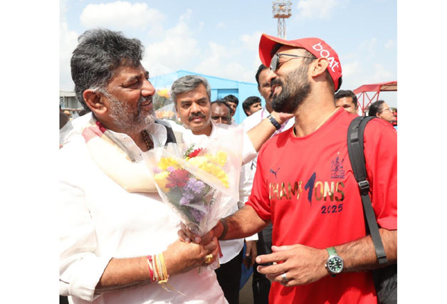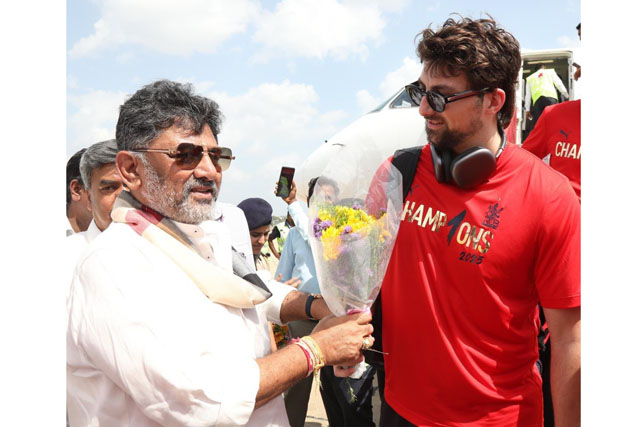 ಬೆಂಗಳೂರು ಜೂ.4 NEWS DESK : ಮೊದಲ ಬಾರಿ ಐಪಿಎಲ್ ಚಾಂಪಿಯನ್ಸ್ ಆಗಿ ಬೆಂಗಳೂರಿಗೆ ಆಗಮಿಸಿದ ಬೆಂಗಳೂರು ರಾಯಲ್ ಚಾಲೆಂಜರ್ಸ್ (RCB) ತಂಡವನ್ನು ಉಪಮುಖ್ಯಮಂತ್ರಿ ಡಿ.ಕೆ.ಶಿವಕುಮಾರ್ ಎಚ್ಎಎಲ್ ವಿಮಾನ ನಿಲ್ದಾಣದಲ್ಲಿ ಸರ್ಕಾರದ ಪರವಾಗಿ ಸ್ವಾಗತಿಸಿದರು. ಆರ್ಸಿಬಿ ತಂಡಕ್ಕೆ ರಾಜ್ಯ ಸರ್ಕಾರ ಇಂದು ವಿಧಾಸೌಧದ ಮುಂದೆ ಭವ್ಯವಾದ ಅಭಿನಂದನಾ ಸಮಾರಂಭ ಆಯೋಜಿಸಿದೆ. ಮುಖ್ಯಮಂತ್ರಿ ಸಿದ್ದರಾಮಯ್ಯ, ಡಿಸಿಎಂ ಡಿಕೆ ಶಿವಕುಮಾರ್, ಸಚಿವರು ಮತ್ತು ಶಾಸಕರು ವಿಧಾನಸೌಧದ ಮೆಟ್ಟಿಲುಗಳ ಮೇಲೆ ರಜತ್ ಪಟಿದಾರ್ ನೇತೃತ್ವದ ತಂಡವನ್ನು ಸನ್ಮಾನಿಸಲಿದ್ದಾರೆ. ಐಪಿಎಲ್ ಕಪ್ ಜಯಿಸಿ ತವರಿಗೆ ಮರಳಿರುವ RCB ತಂಡಕ್ಕೆ ಬೆಂಗಳೂರಿನಲ್ಲಿ ಅಭಿಮಾನಿಗಳಿಂದಲೂ ಅದ್ದೂರಿ ಸ್ವಾಗತ ದೊರೆತಿದೆ.