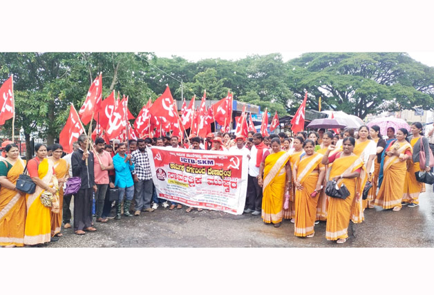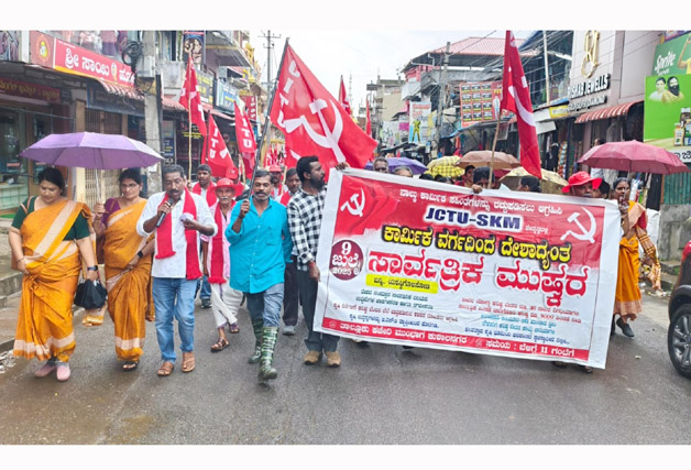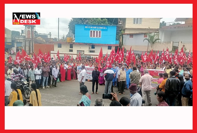 ಕುಶಾಲನಗರ ಜು.10 NEWS DESK : ನಾಲ್ಕು ಕಾರ್ಮಿಕ ಸಂಹಿತೆಗಳನ್ನು ರದ್ದುಪಡಿಸುವಂತೆ ಹಾಗೂ ವಿವಿಧ ಬೇಡಿಕೆಗಳನ್ನು ಈಡೇರಿಸುವಂತೆ ಆಗ್ರಹಿಸಿ ಕಾರ್ಮಿಕ ವರ್ಗದಿಂದ ಕುಶಾಲನಗರದ ಕಾರ್ಯಪ್ಪ ವೃತ್ತದಲ್ಲಿ ಪ್ರತಿಭಟನೆ ನಡೆಸಲಾಯಿತು. ಜೆ.ಸಿ.ಟಿ.ಯು ಹಾಗೂ ಎಸ್.ಕೆ.ಎಂ ನೇತೃತ್ವದಲ್ಲಿ ನಡೆದ ಪ್ರತಿಭಟನೆಯಲ್ಲಿ ಕೇಂದ್ರ ಸರ್ಕಾರವು ಕಾರ್ಮಿಕ ವಿರೋಧಿ ನೀತಿಗಳನ್ನು ರದ್ದುಗೊಳಿಸುವಂತೆ ಆಗ್ರಹಿಸಿ ಪ್ರತಿಭಟನೆ ನಡೆಸಿದರು. ಅಲ್ಲದೇ ಕಾರ್ಮಿಕರ ಹತ್ತಲವಾರು ಬೇಡಿಕೆಗಳನ್ನು ಸರ್ಕಾರ ಜಾರಿಗೊಳಿಸಬೇಕು ಎಂದು ಅವರು ಪಟ್ಟು ಹಿಡಿದರು. ನಂತರ ತಹಶಿಲ್ದಾರರ ಕಚೇರಿಗೆ ಮೆರವಣಿಗೆ ಸಾಗಿದ ಪ್ರತಿಭಟನಾಕಾರರು, ತಹಶಿಲ್ದಾರರ ಮೂಲಕ ಪ್ರಧಾನ ಮಂತ್ರಿಯವರಿಗೆ ಮನವಿ ಪತ್ರ ನೀಡಿದರು. ಸಿ.ಐ.ಟಿ.ಯು ಜಿಲ್ಲಾಧ್ಯಕ್ಷ ಪಿ.ಆರ್.ಭರತ್ ಮಾತನಾಡಿ, ಅಖಿಲ ಭಾರತ ಸಾರ್ವತ್ರಿಕ ಮುಷ್ಕರದ ಭಾಗವಾಗಿ ಕುಶಾಲನಗರದ ಕಾರ್ಯಪ್ಪ ವೃತ್ತದಲ್ಲಿ ಪ್ರತಿಭಟನೆ ನಡೆಸಲಾಗಿದೆ. ಸರ್ಕಾರ ಕಾರ್ಮಿಕ ಆಗ್ರಹ, ಬೇಡಿಕೆಗಳನ್ನು ಈಡೇರಿಸಬೇಕು ಎಂದರು. ಈ ಸಂದರ್ಭ ವಿವಿಧ ಸಂಘಟನೆಗಳ ಪ್ರಮುಖರಾದ ಉದಯ್ ಕುಮಾರ್, ಜಮುನಾ, ಸಾವಿತ್ರಿ, ರಾಣಿ, ಲಲಿತಮ್ಮ, ರಘು, ಗಿರೀಶ್, ಕೃಷ್ಣಕುಮಾರ್, ಜಯರಾಮ್, ಯೋಗೇಶ್, ಜಯಣ್ಣ, ಮಂಜುನಾಥ್ ಹಾಗೂ ಐವತ್ತಕ್ಕೂ ಅಧಿಕ ಜನರು ಭಾಗವಹಿಸಿದ್ದರು.
