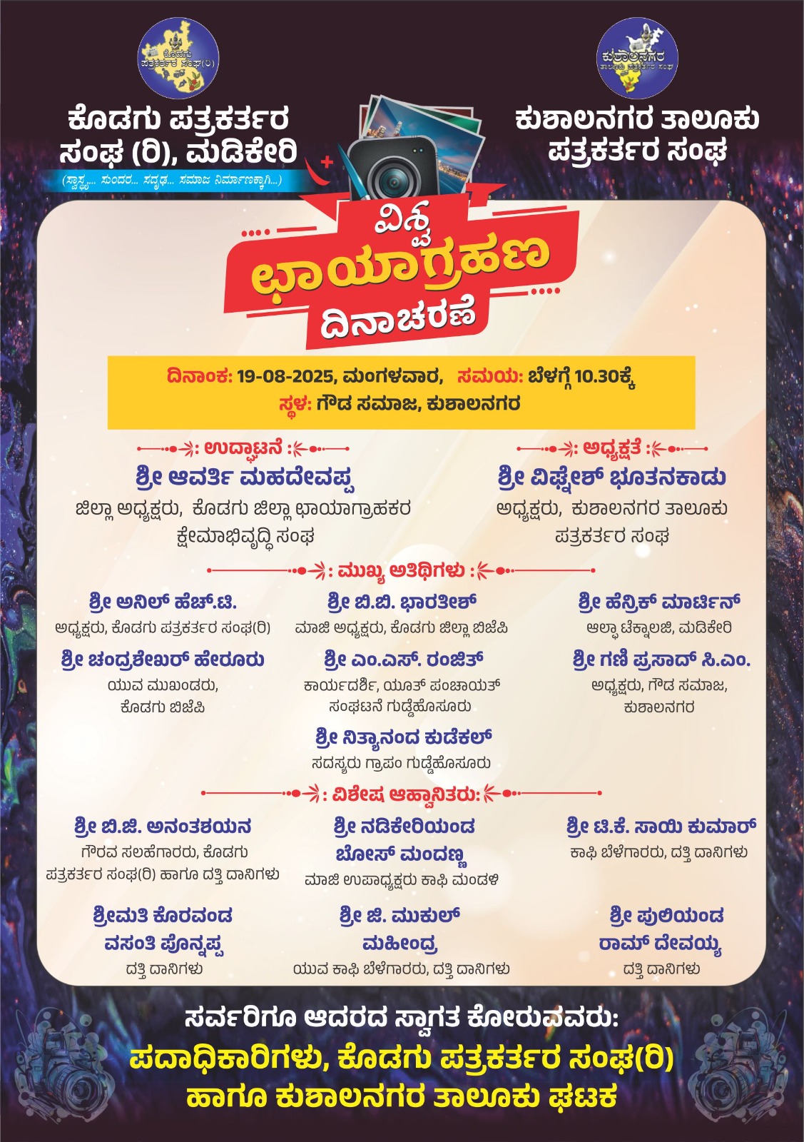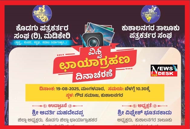 ಮಡಿಕೇರಿ ಆ.16 NEWS DESK : ಕೊಡಗು ಪತ್ರಕರ್ತರ ಸಂಘ ಮತ್ತು ಕುಶಾಲನಗರ ತಾಲೂಕು ಪತ್ರಕರ್ತರ ಸಂಘದಿಂದ ಆ.19 ರಂದು ಮಂಗಳವಾರ ಕುಶಾಲನಗರದಲ್ಲಿ ವಿಶ್ವ ಛಾಯಾಗ್ರಹಣ ದಿನಾಚರಣೆ ಆಯೋಜಿಸಲಾಗಿದೆ. ಕುಶಾಲನಗರದ ಗೌಡ ಸಮಾಜದ ಸಭಾಂಗಣದಲ್ಲಿ ಮಂಗಳವಾರ ಬೆಳಗ್ಗೆ 10.30 ಗಂಟೆಗೆ ಆಯೋಜಿತ ವಿಶ್ವಛಾಯಾಗ್ರಹಣ ದಿನಾಚರಣೆಯನ್ನು ಕೊಡಗು ಜಿಲ್ಲಾ ಛಾಯಾಗ್ರಾಹಕರ ಕ್ಷೇಮಾಭಿವೃದ್ಧಿ ಸಂಘದ ಅಧ್ಯಕ್ಷ ಆವರ್ತಿ ಮಹದೇವಪ್ಪ ಉದ್ಘಾಟಿಸಲಿದ್ದಾರೆ. ಕುಶಾಲನಗರ ತಾಲೂಕು ಪತ್ರಕರ್ತರ ಸಂಘದ ಅಧ್ಯಕ್ಷ ವಿಘ್ನೇಶ್ ಭೂತನಕಾಡು ಅಧ್ಯಕ್ಷತೆಯಲ್ಲಿ ಆಯೋಜಿತ ಕಾರ್ಯಕ್ರಮದಲ್ಲಿ ಕೊಡಗು ಪತ್ರಕರ್ತರ ಸಂಘದ ಅಧ್ಯಕ್ಷ ಅನಿಲ್ ಹೆಚ್.ಟಿ.,ಕೊಡಗು ಜಿಲ್ಲಾ ಬಿಜೆಪಿಯ ಮಾಜಿ ಅಧ್ಯಕ್ಷ ಬಿ.ಬಿ.ಭಾರತೀಶ್, ಉದ್ಯಮಿ ಹೆನ್ರಿಕ್ ಮಾರ್ಟಿನ್, ಬಿಜೆಪಿ ಯುವ ಮುಖಂಡ ಚಂದ್ರಶೇಖರ್ ಹೇರೂರು, ಗುಡ್ಡೆಹೊಸೂರು ಪಂಚಾಯತ್ ಯೂತ್ ಮೂವ್ ಮೆಂಟ್ ಕಾರ್ಯದರ್ಶಿ ಎಂ.ಎಸ್. ರಂಜಿತ್, ಕುಶಾಲನಗರ ಗೌಡ ಸಮಾಜ ಅಧ್ಯಕ್ಷರಾದ ಸಿ.ಎಂ.ಗಣಿಪ್ರಸಾದ್, ಗುಡ್ಡೆಹೊಸೂರು ಗ್ರಾಪಂ ಸದಸ್ಯ ನಿತ್ಯಾನಂದ ಕುಡೆಕಲ್ ಪಾಲ್ಗೊಳ್ಳಲಿದ್ದಾರೆ. ಕಾರ್ಯಕ್ರಮದಲ್ಲಿ ವಿಶೇಷ ಆಹ್ವಾನಿತರಾಗಿ ಹಿರಿಯ ಪತ್ರಕರ್ತ ಬಿ.ಜಿ. ಅನಂತಶಯನ, ಭಾರತೀಯ ಕಾಫಿ ಮಂಡಳಿ ಮಾಜಿ ಉಪಾಧ್ಯಕ್ಷ ನಡಿಕೇರಿಯಂಡ ಬೋಸ್ ಮಂದಣ್ಣ, ಕಾಫಿ ಬೆಳೆಗಾರರಾದ ಟಿ.ಕೆ.ಸಾಯಿಕುಮಾರ್, ಕೊರವಂಡ ವಸಂತಿ ಪೊನ್ನಪ್ಪ, ಜಿ.ಮುಕುಲ್ ಮಹೀಂದ್ರ, ಪುಲಿಯಂಡ ರಾಮ್ ದೇವಯ್ಯ ಪಾಲ್ಗೊಳ್ಳಲಿದ್ದಾರೆ. ವಿಶ್ವಛಾಯಾಗ್ರಹಣ ದಿನಾಚರಣೆ ಅಂಗವಾಗಿ ಪತ್ರಕರ್ತರ ಸಂಘದಿಂದ ಹಿರಿಯ ಛಾಯಾಗ್ರಾಹಕರಾದ ಸಂದೀಪ್ ಮತ್ತು ಮಹಮ್ಮದ್ ಹನೀಫ್ ಅವರನ್ನು ಸನ್ಮಾನಿಸಲಾಗುತ್ತದೆ. ಅಂತೆಯೇ ಪತ್ರಕತ9ರ ಸಂಘದಿಂದ ಆಯೋಜಿತ ಛಾಯಾಚಿತ್ರ, ವಿಡಿಯೋ, ರೀಲ್ಸ್ ಸ್ಪರ್ಧೆಗಳ ವಿಜೇತರಿಗೆ ಬಹುಮಾನ ವಿತರಿಸಲಾಗುತ್ತದೆ. ಪುಲಿಯಂಡ ರಾಮ್ ದೇವಯ್ಯ ಅವರು ಜ್ಞಾನಗಂಗಾ ಶಾಲೆಯ ಹೆಸರಿನಲ್ಲಿ ಕುಶಾಲನಗರ ತಾಲೂಕು ಪತ್ರಕರ್ತರ ಸಂಘದಲ್ಲಿ ಹಿರಿಯ ವರದಿಗಾರರಿಗೆ ಸ್ಥಾಪಿಸಿರುವ ದತ್ತಿ ಪ್ರಶಸ್ತಿಗೆ ಸುಂಟಿಕೊಪ್ಪದ ಹಿರಿಯ ವರದಿಗಾರ ಕೆ. ಶಿವಣ್ಣ ಆಯ್ಕೆಯಾಗಿದ್ದು, ಅವರನ್ನು ಕಾರ್ಯಕ್ರಮದಲ್ಲಿ ಸನ್ಮಾನಿಸಿ ಗೌರವಿಸಲಾಗುತ್ತದೆ. ಸಂಘದ ನಿರ್ದೇಶಕ ನವೀನ್ ಚಿನ್ನಪ್ಪ ಅವರನ್ನು ಕಾರ್ಯಕ್ರಮದಲ್ಲಿ ಸನ್ಮಾನಿಸಲಾಗುತ್ತದೆ ಎಂದು ಕುಶಾಲನಗರ ತಾಲೂಕು ಪತ್ರಕರ್ತರ ಸಂಘದ ಪ್ರಧಾನ ಕಾರ್ಯದರ್ಶಿ ಎಂ.ಬಿ. ವಿನ್ಸೆಂಟ್ ಮಾಹಿತಿ ನೀಡಿದ್ದಾರೆ.