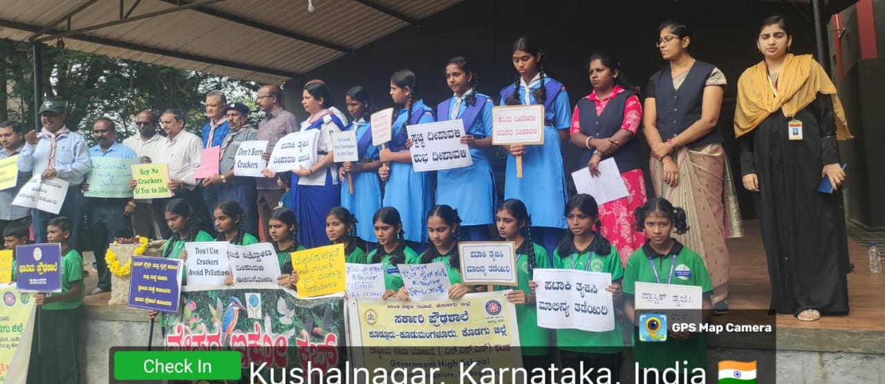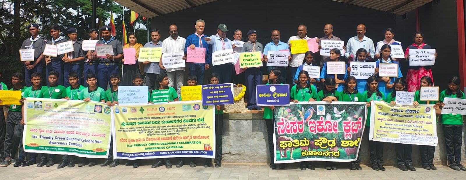 ಕರ್ನಾಟಕ ರಾಜ್ಯ ವಿಜ್ಞಾನ ಪರಿಷತ್ತಿನ ಕೊಡಗು ಜಿಲ್ಲಾ ಸಮಿತಿ,ಭಾರತ್ ಸ್ಕೌಟ್ಸ್ ,ಗೈಡ್ಸ್ ನ ಕುಶಾಲನಗರ ಸ್ಥಳೀಯ ಸಂಸ್ಥೆ ಹಾಗೂ ಕೂಡುಮಂಗಳೂರು ಸರ್ಕಾರಿ ಪ್ರೌಢಶಾಲೆಯ ಎನ್.ಎಸ್.ಎಸ್.ಘಟಕದ ಸಂಯುಕ್ತಾಶ್ರಯದಲ್ಲಿ ಶನಿವಾರ (ಅ.19 ರಂದು ) ಕುಶಾಲನಗರ ಪಟ್ಟಣದ ಫಾತಿಮ ಪ್ರೌಢಶಾಲೆಯಲ್ಲಿ ನೇಸರ ಇಕೋ ಕ್ಲಬ್ ನ ಸಹಯೋಗದೊಂದಿಗೆ ‘ನಮ್ಮ ನಡೆ ಹಸಿರೆಡೆಗೆ: ಗೋ ಗ್ರೀನ್ *ಅಭಿಯಾನದಡಿ ಸ್ವಚ್ಛ, ಸ್ವಸ್ಥ ಹಾಗೂ ಪರಿಸರ ಸ್ನೇಹಿ ಹಸಿರು ದೀಪಾವಳಿ ಆಚರಣೆ’ ಕುರಿತಂತೆ ಪರಿಸರ ಜಾಗೃತಿ ಆಂದೋಲನ ನಡೆಸಲಾಯಿತು. ವಿದ್ಯಾರ್ಥಿಗಳಿಗೆ ಹಸಿರು ದೀಪಾವಳಿ ಆಚರಣೆ ಕುರಿತು ಪ್ರತಿಜ್ಞಾ ವಿಧಿ ಬೋಧಿಸಿ ಮಾತನಾಡಿದ ಸೋಮವಾರಪೇಟೆ ತಾಲ್ಲೂಕು ಕ್ಷೇತ್ರ ಶಿಕ್ಷಣಾಧಿಕಾರಿ ಎಂ.ಕೃಷ್ಣಪ್ಪ , ನಾವು ಪರಿಸರಕ್ಕೆ ಯಾವುದೇ ರೀತಿಯಲ್ಲೂ ಹಾನಿಯುಂಟು ಮಾಡುವ ಪಟಾಕಿಯನ್ನು ತ್ಯಜಿಸುವ ಮೂಲಕ ಉತ್ತಮ ಪರಿಸರ ಸಂರಕ್ಷಣೆಗಾಗಿ ನಾವು ಸ್ವಚ್ಛ ಸ್ವಸ್ಥ ಹಾಗೂ ಹಸಿರು ದೀಪಾವಳಿ ಆಚರಣೆ ಬಗ್ಗೆ ಹೆಚ್ಚಿನ ಒತ್ತು ನೀಡಬೇಕು ಎಂದರು. ವಿದ್ಯಾರ್ಥಿಗಳು ಅಪಾಯಕಾರಿ ಪಟಾಕಿ ತ್ಯಜಿಸಿ ಹಣತೆ ಬೆಳಗಿಸುವ ಮೂಲಕ ಸುರಕ್ಷತಾ ಕ್ರಮಗಳನ್ನು ಅನುಸರಿಸುವ ಮೂಲಕ