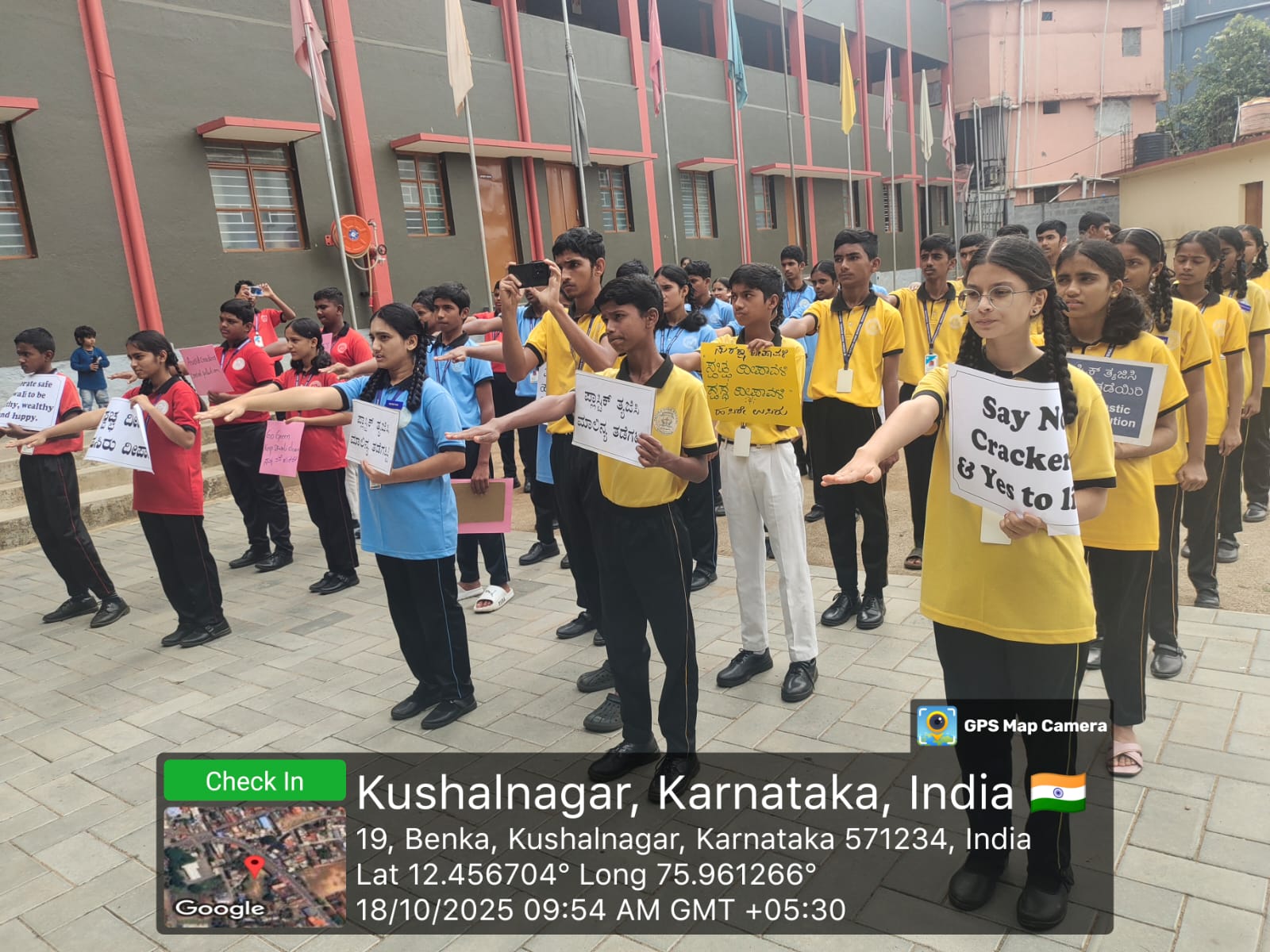 ಕುಶಾಲನಗರ ಅ.20 NEWS DESK : ಬೆಳಕಿನ ಹಬ್ಬ ದೀಪಾವಳಿ ಹಬ್ಬದ ಸಂದರ್ಭ ಪಟಾಕಿ ಸಿಡಿತದಿಂದ ಉಂಟಾಗುವ ಅನಾಹುತಗಳು ಹಾಗೂ ಮಾಲಿನ್ಯದ ದುಷ್ಪರಿಣಾಮಗಳ ಕುರಿತು ಜನಜಾಗೃತಿ ಮೂಡಿಸುವ ಕುರಿತಂತೆ ಜಿಲ್ಲಾಡಳಿತ, ಜಿ.ಪಂ.,ಕರ್ನಾಟಕ ರಾಜ್ಯ ಮಾಲಿನ್ಯ ನಿಯಂತ್ರಣ ಮಂಡಳಿಯ ಕೊಡಗು ಪ್ರಾದೇಶಿಕ ಕಛೇರಿ, ಕುಶಾಲನಗರ ಪುರಸಭೆ ಕಾರ್ಯಾಲಯ, ಶಾಲಾ ಶಿಕ್ಷಣ ಇಲಾಖೆಯ ರಾಷ್ಟ್ರೀಯ ಹಸಿರು ಪಡೆಯ ಇಕೋ ಕ್ಲಬ್ ವತಿಯಿಂದ