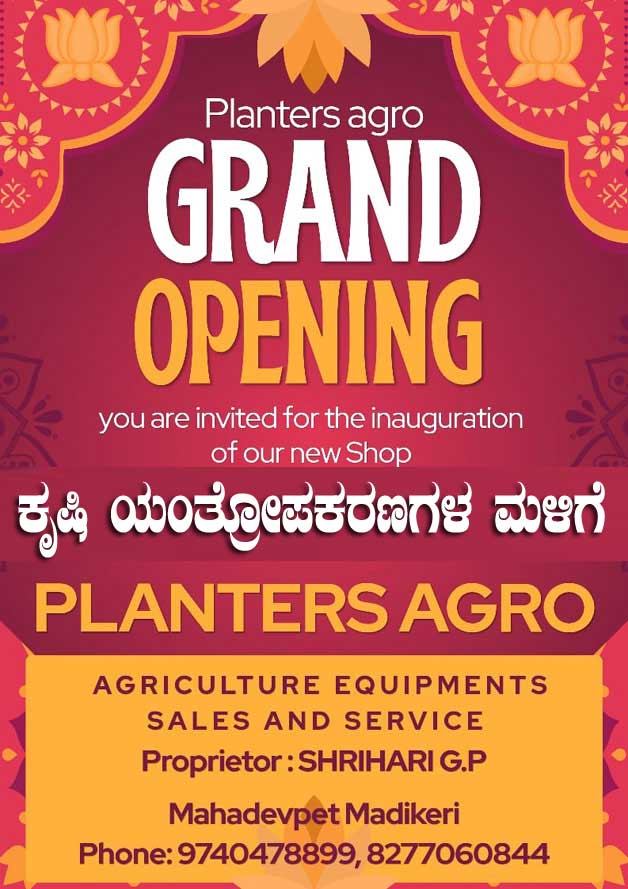 ಮಡಿಕೇರಿ NEWS DESK ಅ.27 : ಮಡಿಕೇರಿ ನಗರದ ಮಹದೇವಪೇಟೆಯಲ್ಲಿ ಕೃಷಿ ಯಂತ್ರೋಪಕರಣಗಳ ಮಳಿಗೆ ಪ್ಲಾಂಟರ್ಸ್ ಆಗ್ರೋ ಶುಭಾರಂಭಗೊಂಡಿದೆ. ಮಡಿಕೇರಿ ವಿಧಾನಸಭಾ ಕ್ಷೇತ್ರದ ಶಾಸಕ ಡಾ.ಮಂತರ್ ಗೌಡ ಅವರು ಮಳಿಗೆಯನ್ನು ಉದ್ಘಾಟಿಸಿ ಮಾಲೀಕ ಶ್ರೀಹರಿ ಜಿ.ಪಿ ಹಾಗೂ ಕುಟುಂಬ ವರ್ಗಕ್ಕೆ ಶುಭ ಹಾರೈಸಿದರು. ನಗರಸಭಾ ಸದಸ್ಯರು, ಮಾಜಿ ಸದಸ್ಯರು, ವಿವಿಧ ಸಂಘ ಸಂಸ್ಥೆಗಳ ಪ್ರಮುಖರು, ವಾಣಿಜ್ಯೋದ್ಯಮಿಗಳು, ವರ್ತಕರು, ವಿವಿಧ ಪಕ್ಷಗಳ ಪದಾಧಿಕಾರಿಗಳು ಹಾಗೂ ಕೃಷಿಕರು ಈ ಸಂದರ್ಭ ಹಾಜರಿದ್ದು ಶುಭ ಕೋರಿದರು. ಪ್ಲಾಂಟರ್ಸ್ ಆಗ್ರೋ ಮಳಿಗೆಯ ಮಾಲೀಕ ಶ್ರೀಹರಿ ಜಿ.ಪಿ ಮಾತನಾಡಿ ಕೃಷಿ ಯಂತ್ರೋಪಕರಣಗಳ ಮಾರಾಟ ಮತ್ತು ಸರ್ವಿಸ್ ಕೂಡ ಇದೆ. ರೈತರ ಸಂತೃಪ್ತಿಯೇ ನಮ್ಮ ತೃಪ್ತಿ, ಆದ್ದರಿಂದ ಎಲ್ಲಾ ರೀತಿಯ ಯಂತ್ರೋಪಕರಣಗಳನ್ನು ಮಾರಾಟ ಮಾಡಲಾಗುವುದು ಎಂದು ತಿಳಿಸಿದರು. ಹೆಚ್ಚಿನ ಮಾಹಿತಿಗೆ ಶ್ರೀಹರಿ ಜಿ.ಪಿ, ಮಾಲೀಕರು, ಪ್ಲಾಂಟರ್ಸ್ ಆಗ್ರೋ 9740478899, 8277060844 ಸಂಪರ್ಕಿಸಬಹುದು.