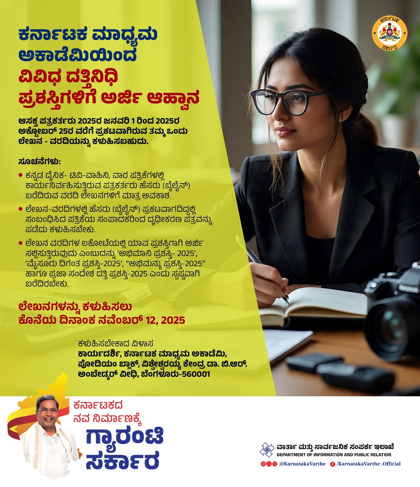 ಮಡಿಕೇರಿ ಅ.29 NEWS DESK : ಕರ್ನಾಟಕ ಮಾಧ್ಯಮ ಅಕಾಡೆಮಿಯು 2025ನೇ ಸಾಲಿನ ವಿವಿಧ ದತ್ತಿನಿಧಿ ಪ್ರಶಸ್ತಿಗಳಿಗಾಗಿ ಪತ್ರಕರ್ತರಿಂದ ಲೇಖನಗಳನ್ನು ಆಹ್ವಾನಿಸಿದೆ. ವಿವಿಧ ಮಾಧ್ಯಮ ಸಂಸ್ಥೆಗಳು ದತ್ತಿನಿದಿ ಪ್ರಶಸ್ತಿಗಳನ್ನು ಸ್ಥಾಪಿಸಿದ್ದು, ಬೆಂಗಳೂರಿನ ‘ಅಭಿಮಾನಿ ಪ್ರಕಾಶನ’ ಸಂಸ್ಥೆಯು ರಾಜ್ಯ ಮತ್ತು ಜಿಲ್ಲಾಮಟ್ಟದ ಕನ್ನಡ ಪತ್ರಿಕೆಗಳಲ್ಲಿ ‘ಸಾಮಾಜಿಕ ಸಮಸ್ಯೆ’ಗಳನ್ನು ಪರಿಣಾಮಕಾರಿಯಾಗಿ ಪ್ರತಿಬಿಂಬಿಸುವ ಲೇಖನ-ವರದಿಗಳಿಗೆ ʼಅಭಿಮಾನಿ ಪ್ರಶಸ್ತಿʼ, ಮೈಸೂರಿನ ʼಮೈಸೂರು ದಿಗಂತʼ ಪತ್ರಿಕಾ ಸಂಸ್ಥೆಯು ʼ‘ಮಾನವೀಯ ಸಮಸ್ಯೆʼಗಳನ್ನು ಪರಿಣಾಮಕಾರಿಯಾಗಿ ಪ್ರತಿಬಿಂಬಿಸುವ ಲೇಖನ-ವರದಿಗಳಿಗೆ ʼಮೈಸೂರು ದಿಗಂತ ಪ್ರಶಸ್ತಿʼ, ಬೆಂಗಳೂರಿನ ಅಭಿಮನ್ಯು ಪತ್ರಿಕೆ ಸಂಸ್ಥೆಯು ದಮನಿತ ಸಮುದಾಯಗಳ ಪರ ದನಿಯಾದ ಅತ್ಯುತ್ತಮ ಲೇಖನ/ ಅಂಕಣ/ ಸಂಪಾದಕೀಯ/ ಪರಿಣಾಮಕಾರಿ ವರದಿಗೆ ʼಅಭಿಮನ್ಯು ಪ್ರಶಸ್ತಿʼ, ಬೆಂಗಳೂರಿನ ʼಪ್ರಜಾ ಸಂದೇಶʼ ಪತ್ರಿಕಾ ಸಂಸ್ಥೆಯು ಶೋಷಣೆಯನ್ನು ಪರಿಣಾಮಕಾರಿಯಾಗಿ ಬಿಂಬಿಸುವ ಲೇಖನಕ್ಕೆ ʼಪ್ರಜಾ ಸಂದೇಶ ದತ್ತಿ ಪ್ರಶಸ್ತಿʼಗಳನ್ನು ಸ್ಥಾಪಿಸಿವೆ. ಈ ದತ್ತಿ ಪ್ರಶಸ್ತಿಗಳು ತಲಾ 10,000/- (ಹತ್ತು ಸಾವಿರ) ರೂ .ನಗದು ಬಹುಮಾನ ಒಳಗೊಂಡಿವೆ. ಆಸಕ್ತ ಪತ್ರಕರ್ತರು 2025ರ ಜನವರಿ 1 ರಿಂದ 2025ರ ಅಕ್ಟೋಬರ್ 25ರ ವರೆಗೆ ಪ್ರಕಟವಾಗಿರುವ ತಮ್ಮ ಒಂದು ಲೇಖನ – ವರದಿಯನ್ನು ಕಳುಹಿಸಬಹುದು. ಕನ್ನಡ ದೈನಿಕ- ಟಿವಿ-ವಾಹಿನಿ, ವಾರ ಪತ್ರಿಕೆಗಳಲ್ಲಿ ಕಾರ್ಯನಿರ್ವಹಿಸುತ್ತಿರುವ ಪತ್ರಕರ್ತರು ಹೆಸರು (ಬೈಲೈನ್) ಬರೆದಿರುವ ವರದಿ ಲೇಖನಗಳಿಗೆ ಮಾತ್ರ ಅವಕಾಶ. ಲೇಖನ-ವರದಿಗಳಲ್ಲಿ ಹೆಸರು (ಬೈಲೈನ್) ಪ್ರಕಟವಾಗದಿದ್ದಲ್ಲಿ ಸಂಬಂಧಿಸಿದ ಪತ್ರಿಕೆಯ ಸಂಪಾದಕರಿಂದ ದೃಢೀಕರಣ ಪತ್ರವನ್ನು ಪಡೆದು ಕಳುಹಿಸಬೇಕು. ಲೇಖನ ವರದಿಗಳ ಲಕೋಟೆಯಲ್ಲಿ ಯಾವ ಪ್ರಶಸ್ತಿಗಾಗಿ ಅರ್ಜಿ ಸಲ್ಲಿಸುತ್ತಿರುವುದು ಎಂಬುದನ್ನು ‘ಅಭಿಮಾನಿ ಪ್ರಶಸ್ತಿ- 2025’, ‘ಮೈಸೂರು ದಿಗಂತ ಪ್ರಶಸ್ತಿ-2025’, “ಅಭಿಮನ್ಯು ಪ್ರಶಸ್ತಿ-2025” ಹಾಗೂ ʼಪ್ರಜಾ ಸಂದೇಶ ದತ್ತಿ ಪ್ರಶಸ್ತಿ-2025ʼ ಎಂದು ಸ್ಪಷ್ಟವಾಗಿ ಬರೆದು ಲೇಖನಗಳನ್ನು ಇದೇ ನವೆಂಬರ್ 12ರ ಒಳಗಾಗಿ ಕಾರ್ಯದರ್ಶಿ, ಕರ್ನಾಟಕ ಮಾಧ್ಯಮ ಅಕಾಡೆಮಿ, ಪೋಡಿಯಂ ಬ್ಲಾಕ್, ವಿಶ್ವೇಶ್ವರಯ್ಯ ಕೇಂದ್ರ ಡಾ. ಬಿ.ಆರ್. ಅಂಬೇಡ್ಕರ್ ವೀಧಿ, ಬೆಂಗಳೂರು-560001 ಇವರಿಗೆ ಅಂಚೆ ಮೂಲಕ ಅಥವಾ ಖುದ್ದಾಗಿ ತಲುಪಿಸಬಹುದು.
