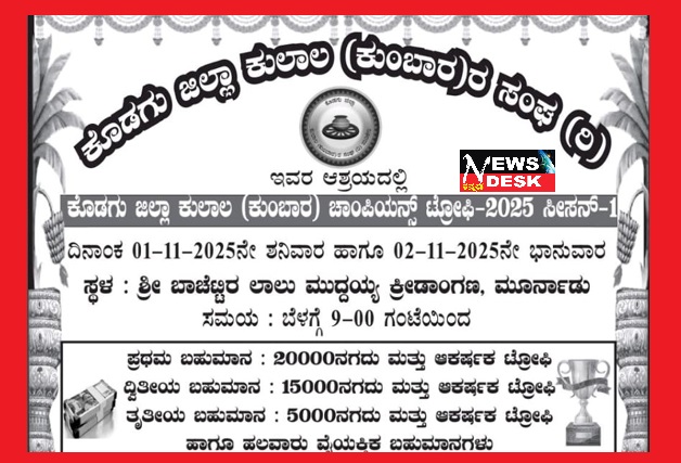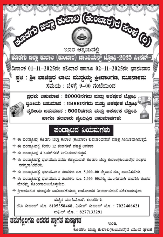 ಮಡಿಕೇರಿ ಅ.29 NEWS DESK : ಕೊಡಗು ಜಿಲ್ಲಾ ಕುಲಾಲ (ಕುಂಬಾರ)ರ ಸಂಘದ ಯುವ ಘಟಕದ ವತಿಯಿಂದ ನ.1 ಮತ್ತು 2 ರಂದು ಕೊಡಗು ಜಿಲ್ಲಾ ಕುಲಾಲ (ಕುಂಬಾರ) ಕ್ರಿಕೆಟ್ ಚಾಂಪಿಯನ್ಸ್ ಟ್ರೋಫಿ-2025 ಸೀಸನ್-1 ನಡೆಯಲಿದೆ. ಮೂರ್ನಾಡುವಿನ ಬಾಚೆಟ್ಟಿರ ಲಾಲು ಮುದ್ದಯ್ಯ ಕ್ರೀಡಾಂಗಣದಲ್ಲಿ ನಡೆಯಲಿರುವ ಪಂದ್ಯಾವಳಿಗೆ ನ.1 ರಂದು ಬೆಳಿಗ್ಗೆ 9 ಗಂಟೆಗೆ ಚಾಲನೆ ದೊರೆಯಲಿದೆ. ವಿಜೇತ ತಂಡಕ್ಕೆ 20,000 ನಗದು ಮತ್ತು ಆಕರ್ಷಕ ಟ್ರೋಫಿ, ದ್ವಿತೀಯ 15,000 ನಗದು ಮತ್ತು ಟ್ರೋಫಿ, ತೃತೀಯ ಬಹುಮಾನ 5,000 ನಗದು ಮತ್ತು ಆಕರ್ಷಕ ಟ್ರೋಫಿ ಹಾಗೂ ಹಲವಾರು ವೈಯಕ್ತಿಕ ಬಹುಮಾನವನ್ನು ನೀಡಲಾಗುವುದು. ಪಂದ್ಯಾವಳಿಯು ಕೊಡಗು ಜಿಲ್ಲಾ ಕುಲಾಲ (ಕುಂಬಾರ) ಕುಲಬಾಂಧವರಿಗೆ ಮಾತ್ರ ಸೀಮಿತವಾಗಿದ್ದು, 4 ಓವರ್ಗಳಿಗೆ ಸೀಮಿತವಾಗಿದೆ ಎಂದು ಕೊಡಗು ಜಿಲ್ಲಾ ಕುಲಾಲ (ಕುಂಬಾರ)ರ ಸಂಘದ ಯುವ ಘಟಕ ಪತ್ರಿಕಾ ಪ್ರಕಟಣೆಯಲ್ಲಿ ತಿಳಿಸಿದೆ. ಹೆಚ್ಚಿನ ಮಾಹಿತಿಗೆ 8105358468, 7022466621, 8277133291 ಸಂಪರ್ಕಿಸಬಹುದಾಗಿದೆ.