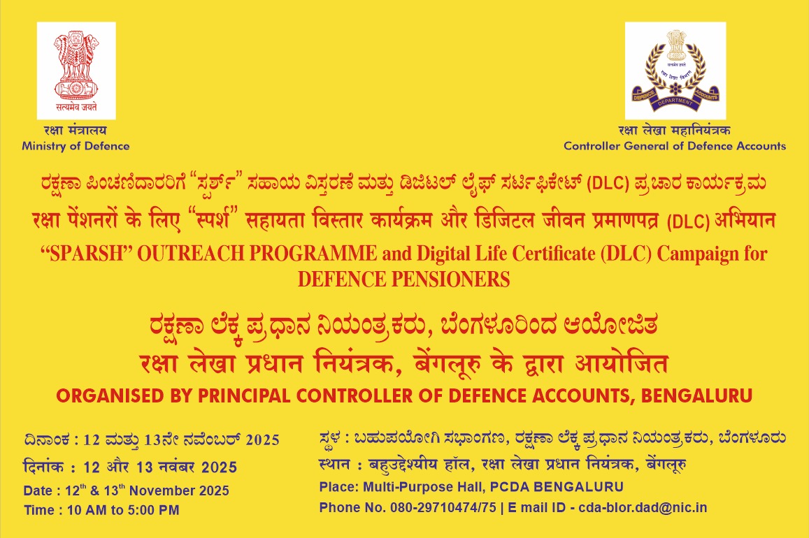 ಬೆಂಗಳೂರು ನ.10 NEWS DESK : ಬೆಂಗಳೂರಿನ ರಕ್ಷಣಾ ಲೆಕ್ಕಪತ್ರಗಳ ಪ್ರಧಾನ ನಿಯಂತ್ರಕರು 2025ರ ನವೆಂಬರ್ 12 ಮತ್ತು 13 ರಂದು ಬೆಳಿಗ್ಗೆ 10 ರಿಂದ ಸಂಜೆ 5 ರವರೆಗೆ ಬೆಂಗಳೂರಿನ ಪಿಸಿಡಿಎ ಕಚೇರಿಯ ಬಹುಪಯೋಗಿ ಸಭಾಂಗಣದಲ್ಲಿ ಸ್ಪರ್ಶ್ ಜನಸಂಪರ್ಕ (ಔಟ್ ರೀಚ್) ಕಾರ್ಯಕ್ರಮವನ್ನು ನಡೆಸುತ್ತಿದ್ದಾರೆ. ಸ್ಪರ್ಶ್-ಸಂಬಂಧಿತ ಎಲ್ಲಾ ಸಮಸ್ಯೆಗಳು ಮತ್ತು ಪಿಂಚಣಿದಾರರು ಮತ್ತು ಕುಟುಂಬ ಪಿಂಚಣಿದಾರರ ಕುಂದುಕೊರತೆಗಳನ್ನು ಪರಿಹರಿಸಲು ಮತ್ತು ಪರಿಹರಿಸಲು ಈ ವಿಶೇಷ ಕಾರ್ಯಕ್ರಮವನ್ನು ಆಯೋಜಿಸಲಾಗುತ್ತಿದೆ. ಕಾರ್ಯಕ್ರಮದ ಸಮಯದಲ್ಲಿ ಡಿಜಿಟಲ್ ಲೈಫ್ ಸರ್ಟಿಫಿಕೇಟ್ (ಡಿಎಲ್ ಸಿ) ಅಭಿಯಾನವನ್ನು ಸಹ ನಡೆಸಲಾಗುತ್ತದೆ. ಸ್ಪರ್ಶ್ ಮತ್ತು ಪಿಂಚಣಿಗೆ ಸಂಬಂಧಿಸಿದ ಎಲ್ಲಾ ಪ್ರಶ್ನೆಗಳಿಗೆ ಸ್ಥಳದಲ್ಲೇ ಸಹಾಯ, ಮಾರ್ಗದರ್ಶನ ಮತ್ತು ಬೆಂಬಲವನ್ನು ಒದಗಿಸಲು ಸಮರ್ಪಿತ ತಂಡ ಲಭ್ಯವಿರುತ್ತದೆ. ಕಾರ್ಯಕ್ರಮದಲ್ಲಿ ಭಾಗವಹಿಸುವ ರಕ್ಷಣಾ ಪಿಂಚಣಿದಾರರು ಮತ್ತು ಕುಟುಂಬ ಪಿಂಚಣಿದಾರರು ತಮ್ಮ ಕುಂದು ಕೊರತೆಗಳನ್ನು ಸಕಾಲಿಕವಾಗಿ ಪರಿಹರಿಸಲು ಈ ಕೆಳಗಿನ ದಾಖಲೆಗಳನ್ನು ತೆಗೆದುಕೊಂಡು ಬರಲು ಕೋರಲಾಗಿದೆ. 1. ನೋಂದಾಯಿತ ಮೊಬೈಲ್ ಫೋನ್, 2. ಆಧಾರ್ ಕಾರ್ಡ್, 3. ಪ್ಯಾನ್ ಕಾರ್ಡ್, 4. ಬ್ಯಾಂಕ್ ಪಾಸ್ಬುಕ್, 5. ಡಿಸ್ಚಾರ್ಜ್ ಪುಸ್ತಕ (ಸೇನೆ/ನೌಕಾಪಡೆ/ವಾಯುಪಡೆ ಪಿಂಚಣಿದಾರರಿಗೆ), 6. ಪಿಪಿಒಗಳ ಪ್ರತಿಗಳು 7. ಯಾವುದೇ ಇತರ ಸಂಬಂಧಿತ ಸೇವೆ/ಪಿಂಚಣಿ ದಾಖಲೆಗಳು