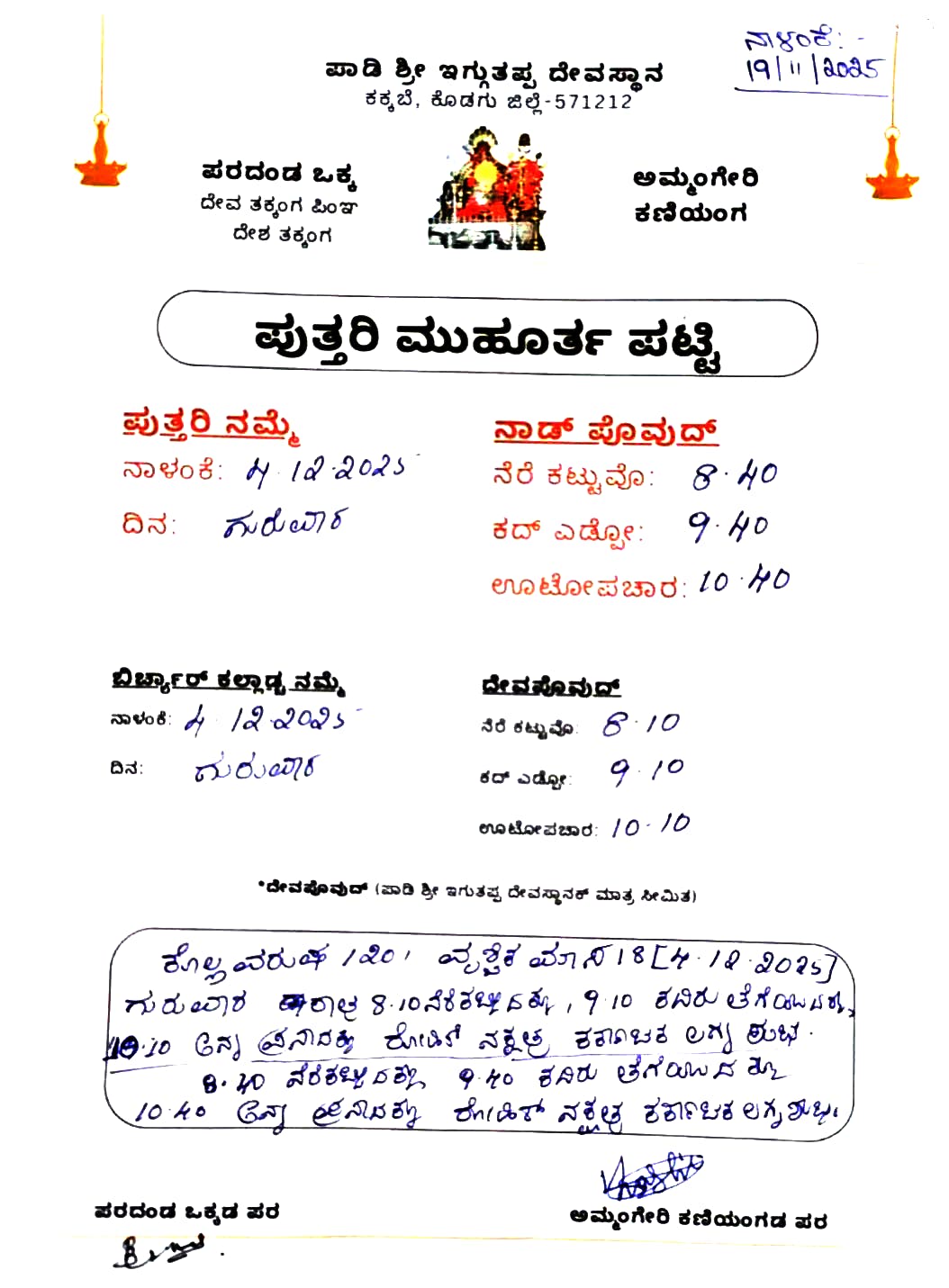 ಮಡಿಕೇರಿ ನ.19 NEWS DESK : ಕೊಡಗಿನ ವಿಶಿಷ್ಟ ಮತ್ತು ಸಂಭ್ರಮದ ಹಬ್ಬಗಳಲ್ಲಿ ಒಂದಾಗಿರುವ ಪುತ್ತರಿ (ಹುತ್ತರಿ) ಯನ್ನು ಡಿಸೆಂಬರ್ 4 ರಂದು ಆಚರಿಸಲು ಸಂಪ್ರದಾಯದಂತೆ ಪಾಡಿ ಶ್ರೀ ಇಗ್ಗುತ್ತಪ್ಪ ದೇಗುಲದಲ್ಲಿ ಬುಧವಾರದಂದು ದಿನ ಮತ್ತು ಗಳಿಗೆಯನ್ನು ಗೊತ್ತುಪಡಿಸಲಾಯಿತು. ಪಾಡಿ ಶ್ರೀ ಇಗ್ಗುತ್ತಪ್ಪ ದೇಗುಲದಲ್ಲಿ ದೇವಾಲಯ ಸಮಿತಿ ಪ್ರಮುಖರು, ಮುಜರಾಯಿ ಇಲಾಖಾ ಪ್ರಮುಖರು, ದೇಶ ತಕ್ಕರು, ನಾಡ ತಕ್ಕರ ಸಮ್ಮುಖದಲ್ಲಿ ಪಾರಂಪರಿಕವಾಗಿ ನಡೆದುಕೊಂಡು ಬಂದಂತೆ ಕಣಿಯ ಸಮೂಹದ ಪ್ರಮುಖರು ಪುತ್ತರಿ (ಹುತ್ತರಿ) ಮತ್ತು ಪಾಡಿ ಶ್ರೀ ಇಗ್ಗುತ್ತಪ್ಪ ದೇವಸ್ಥಾನದ ಕಲಾಡ್ಚ ಹಬ್ಬಕ್ಕೆ ದಿನ ನಿಗದಿ ಮಾಡಿದರು. ದೇವಾಲಯದಲ್ಲಿ ದಿನ ನಿಗದಿ ಪಡಿಸಿದಂತೆ ಡಿ.4 ರಂದು ರೋಹಿಣಿ ನಕ್ಷತ್ರದಲ್ಲಿ ಹುತ್ತರಿ ಹಬ್ಬ ನಡೆಯಲಿದೆ. ಅಂದು ಪಾಡಿ ಶ್ರೀ ಇಗ್ಗುತ್ತಪ್ಪ ದೇಗುಲದಲ್ಲಿ ರಾತ್ರಿ 8.10 ಗಂಟೆಗೆ ನೆರೆ ಕಟ್ಟುವುದು, ರಾತ್ರಿ 9.10 ಗಂಟೆಗೆ ಕದಿರು ತೆಗೆಯುವುದು ಮತ್ತು ಭೋಜನಕ್ಕೆ 10.10 ಗಂಟೆ ಸಮಯವನ್ನು ನಿಗದಿಪಡಿಸಲಾಗಿದೆ. :: ಸಾರ್ವಜನಿಕ ಹಬ್ಬಾಚರಣೆ :: ಸಾರ್ವಜನಿಕವಾಗಿ ರಾತ್ರಿ 8.40 ಗಂಟೆಗೆ ನೆರೆ ಕಟ್ಟುವುದು, ರಾತ್ರಿ 9.40 ಗಂಟೆಗೆ ಕದಿರು ತೆಗೆಯುವುದು ಮತ್ತು ಭೋಜನಕ್ಕೆ ರಾತ್ರಿ 10.40 ಗಂಟೆಯೆಂದು ಸಮಯ ನಿಗದಿಯಾಗಿದೆ. :: ಕಲಾಡ್ಚ ಹಬ್ಬ :: ಪಾಡಿ ಶ್ರೀ ಇಗ್ಗುತ್ತಪ್ಪ ದೇಗುಲದಲ್ಲಿ ಹುತ್ತರಿ ಹಬ್ಬದ ದಿನವಾದ ಡಿ.4 ರಂದೇ ಕಲಾಡ್ಚ ಹಬ್ಬವನ್ನು ನಡೆಸಲು ದಿನವನ್ನು ನಿಗದಿಪಡಿಸಲಾಯಿತು.