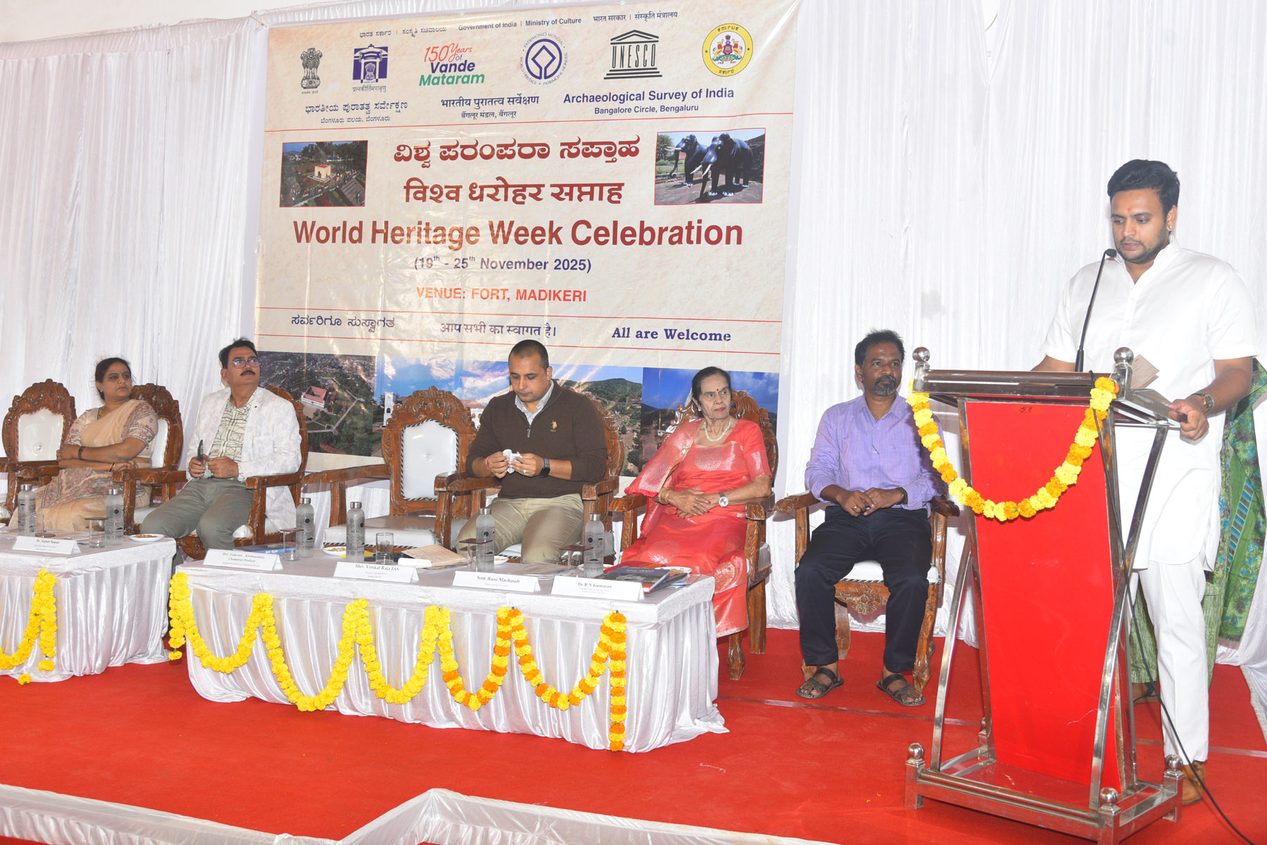 ಮಡಿಕೇರಿ ನ.19 NEWS DESK : ಭಾರತೀಯ ಪುರಾತತ್ವ ಸರ್ವೇಕ್ಷಣಾ ಇಲಾಖೆ ಹಾಗೂ ಪುರಾತತ್ವ, ಸಂಗ್ರಹಾಲಯಗಳು ಮತ್ತು ಪರಂಪರೆ ಇಲಾಖೆ ವತಿಯಿಂದ ನ.25 ರವರೆಗೆ ನಡೆಯುವ ವಿಶ್ವ ಪಾರಂಪರ ಸಪ್ತಾಹ ಹಾಗೂ ಶಾಶ್ವತ ಛಾಯಾಚಿತ್ರ ಪ್ರದರ್ಶನ, ಗ್ಯಾಲರಿ ಸಹಿತ ವ್ಯಾಖ್ಯಾನ ಕೇಂದ್ರವನ್ನು ಸಂಸದರಾದ ಯದುವೀರ್ ಕೃಷ್ಣದತ್ತ ಚಾಮರಾಜ ಒಡೆಯರ್ ಅವರು ನಗರದ ಕೋಟೆ ಆವರಣದಲ್ಲಿ ಉದ್ಘಾಟಿಸಿದರು. ಬಳಿಕ ಮಾತನಾಡಿದ ಸಂಸದರು, ಕೊಡಗು ಜಿಲ್ಲೆಗೆ ತನ್ನದೇ ಆದ ಇತಿಹಾಸವಿದ್ದು, 1600 ವರ್ಷಗಳ ಹಿಂದೆಯೇ ಕೊಡಗನ್ನು ಹಲವರು ಆಡಳಿತ ಮಾಡಿದ್ದು, ಕೊಡಗಿನ ಇತಿಹಾಸ, ಪರಂಪರೆ ಮತ್ತು ಸಂಸ್ಕøತಿ ಬಗ್ಗೆ ಪ್ರತಿಯೊಬ್ಬರೂ ತಿಳಿದುಕೊಳ್ಳುವಂತಾಗಬೇಕು ಎಂದು ಅವರು ಹೇಳಿದರು. ಕೊಡಗಿನ ಇತಿಹಾಸ, ಸಂಸ್ಕøತಿ, ಪರಂಪರೆ ಕಲೆಗಳು ಶ್ರೀಮಂತಿಕೆ ಹೊಂದಿದ್ದು, ಅದನ್ನು ಮುಂದಿನ ಪೀಳಿಗೆಗೆ ಉಳಿಸಿ ಬೆಳೆಸುವಂತಾಗಬೇಕು. ಆ ನಿಟ್ಟಿನಲ್ಲಿ ಕೋಟೆಯಲ್ಲಿ ಇತಿಹಾಸದ ಪರಂಪರಿಕ ಛಾಯಾಚಿತ್ರ ಪ್ರದರ್ಶನ ಮತ್ತಿತರ ಕಲಾ ಚಟುವಟಿಕೆಗಳು ನಡೆಯುವಂತಾಗಬೇಕು ಎಂದು ಸಂಸದರು ಹೇಳಿದರು. ನಗರದ ಕೋಟೆಯನ್ನು ಮತ್ತಷ್ಟು ಅಭಿವೃದ್ಧಿ ಪಡಿಸುವ ನಿಟ್ಟಿನಲ್ಲಿ ಕೇಂದ್ರ ಸರ್ಕಾರದಿಂದ ಅನುದಾನ ಒದಗಿಸಲಾಗುವುದು. ಕೋಟೆಯನ್ನು ಶಾಶ್ವತ ಪಾರಂಪರಿಕ ಕೇಂದ್ರವನ್ನಾಗಿ ಮಾಡುವಲ್ಲಿ ಎಲ್ಲಾ ರೀತಿಯ ಪ್ರಯತ್ನ ಮಾಡಲಾಗುವುದು ಎಂದು ಯದುವೀರ್ ಕೃಷ್ಣದತ್ತ ಚಾಮರಾಜ ಒಡೆಯರ್ ಅವರು ನುಡಿದರು. ಕಲೆ, ಸಂಸ್ಕøತಿ, ಸಾಹಿತ್ಯ. ಪರಂಪರೆ ಸಂಬಂಧ ನಗರದ ಕೋಟೆ ಹಳೇ ವಿಧಾನ ಸಭಾಂಗಣದಲ್ಲಿ ಕಾರ್ಯಕ್ರಮಗಳು ಸಹ ಜರುಗುವಂತಾಗಬೇಕು. ಸಾರ್ವಜನಿಕರು ಸಹ ವೀಕ್ಷಣೆಗೆ ಅವಕಾಶವಾಗುವಂತಾಗಬೇಕು ಎಂದು ಸಂಸದರು ಸಲಹೆ ನೀಡಿದರು. ಕೊಡಗು ಜಿಲ್ಲೆಗೆ ಅನನ್ಯ ಇತಿಹಾಸವಿದ್ದು, ರಾಜ್ಯದಲ್ಲಿ ಕದಂಬರು, ಹೊಯ್ಸಲರು, ವಿಜಯನಗರ ಹಾಗೂ ಮೈಸೂರು ರಾಜ ಅರಸರು ಹೀಗೆ ಹಲವರು ಆಡಳಿತ ಮಾಡಿದ್ದಾರೆ. ಕೊಡಗಿನ ರಾಜರು ಸಹ ಆಡಳಿತ ಮಾಡಿದ್ದಾರೆ. ಈ ಬಗ್ಗೆ ಇತಿಹಾಸವನ್ನು ಅಧ್ಯಯನ ಮಾಡುವಂತಾಗಬೇಕು ಎಂದು ಸಂಸದರು ತಿಳಿಸಿದರು. ಕೊಡಗು ಮತ್ತು ಮೈಸೂರು ಜಿಲ್ಲೆಗೆ ಅವಿನಾಭಾವ ಸಂಬಂಧವಿದ್ದು, ಮೈಸೂರು ದಸರಾ ಸಂದರ್ಭದಲ್ಲಿಯೂ ಮಡಿಕೇರಿಯಲ್ಲಿಯೂ ದಸರಾ ನಡೆಯುವುದು ವಿಶೇಷವಾಗಿದೆ ಎಂದು ಸಂಸದರು ಹೇಳಿದರು. ಜಿಲ್ಲಾಧಿಕಾರಿ ವೆಂಕಟ್ ರಾಜಾ ಅವರು ಮಾತನಾಡಿ, ಪಾರಂಪರಿಕ ಸ್ಥಳಗಳಲ್ಲಿ ಹಲವು ಸಾಂಸ್ಕøತಿಕ ಚಟುವಟಿಕೆಗಳು ನಡೆಯುವಂತಾಗಬೇಕು. ಜಿಲ್ಲೆಯ ಪರಂಪರೆ, ಇತಿಹಾಸ, ಸಂಸ್ಕøತಿಯನ್ನು ಮುಂದಿನ ಪೀಳಿಗೆಗೆ ತಿಳಿಸಬೇಕು. ನಗರದ ಕೋಟೆಯು ಬಹಳಷ್ಟು ಸುಧಾರಣೆಯಾಗಿದ್ದು, ಇನ್ನೂ ಸುಧಾರಣೆಯಾಗಬೇಕಿದೆ ಎಂದರು. ಕೋಟೆಯ ಒಳ ಆವರಣದಲ್ಲಿರುವ ಕಟ್ಟಡವನ್ನು ನಿಯಮಾನುಸಾರ ತೆರವುಗೊಳಿಸಲು ಕ್ರಮವಹಿಸಬೇಕು. ಪಾರಂಪರಿಕ ಕಟ್ಟಡದಲ್ಲಿ ವಿವಿಧ ಸಾಂಸ್ಕøತಿಕ ಚಟುವಟಿಕೆಗಳು ನಡೆಯುವಂತಾಗಬೇಕು. ಕೋಟೆಯನ್ನು ಅಭಿವೃದ್ಧಿಪಡಿಸುವಲ್ಲಿ ಎಲ್ಲರ ಸಲಹೆ, ಸಹಕಾರ ಅತ್ಯಗತ್ಯ ಎಂದರು. ಭಾರತೀಯ ಪುರಾತತ್ವ ಇಲಾಖೆಯ ಅಧೀಕ್ಷಕರಾದ ಸುಜಿತ್ ನಯನ್ ಮಾತನಾಡಿ, ರಾಜ್ಯ ಸರ್ಕಾರದಿಂದ 10 ಕೋಟಿ ರೂ. ಬಿಡುಗಡೆಯಾಗಿದ್ದು, ನವೀಕರಣ ಕಾಮಗಾರಿ ಕೈಗೊಳ್ಳಲಾಗಿದೆ, ಇದೊಂದು ಪಾರಂಪರಿಕ ಕಟ್ಟಡವಾಗಿ ಉಳಿಯಲಿದ್ದು, ಕೇಂದ್ರ ಮತ್ತು ರಾಜ್ಯ ಸರ್ಕಾರಗಳು ಅಗತ್ಯ ಸಹಕಾರ ನೀಡಿದೆ ಎಂದು ಹೇಳಿದರು. ಪದ್ಮಶ್ರೀ ಪ್ರಶಸ್ತಿ ಪುರಸ್ಕøತರಾದ ರಾಣಿ ಮಾಚಯ್ಯ ಅವರು ಮಾತನಾಡಿದರು. ಮಡಿಕೇರಿ ಕ