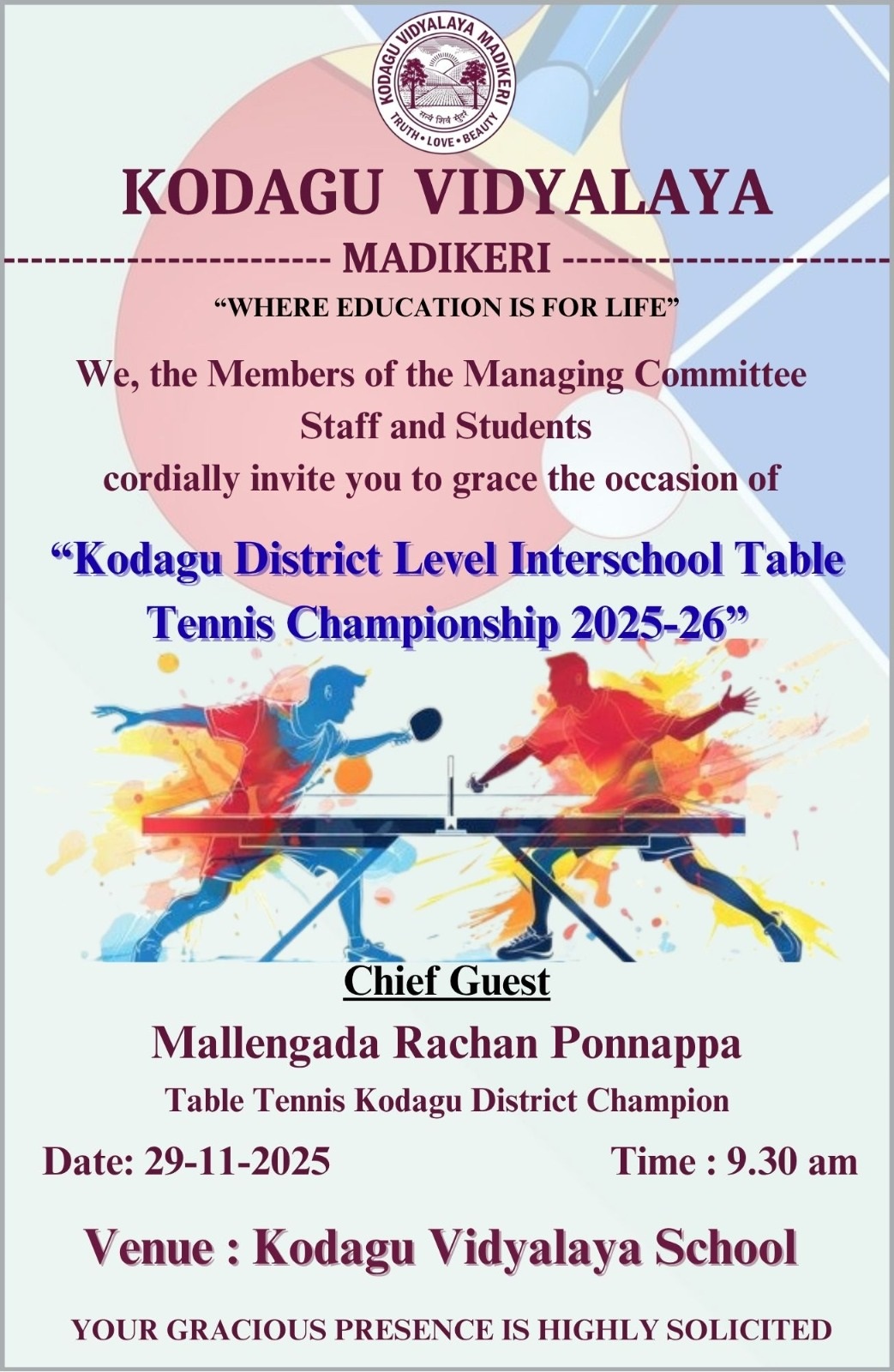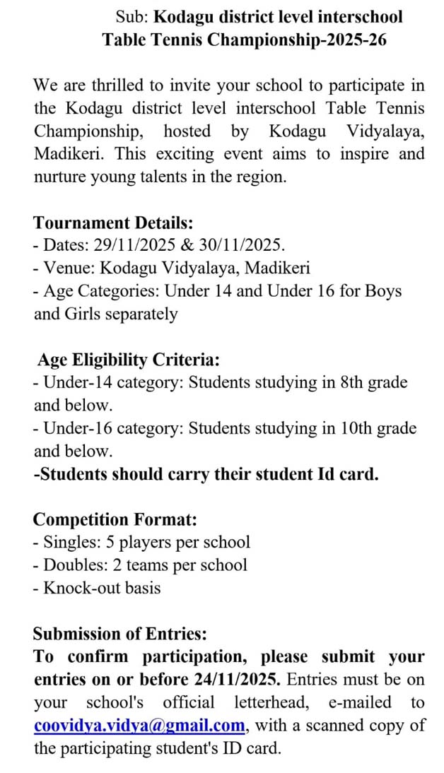 ಮಡಿಕೇರಿ ನ.22 NEWS DESK : ನಗರದ ಕೊಡಗು ವಿದ್ಯಾಲಯದಲ್ಲಿ ನ.29 ಮತ್ತು 30ರಂದು ವಿದ್ಯಾರ್ಥಿಗಳಿಗಾಗಿ “ಕೊಡಗು ಜಿಲ್ಲಾ ಮಟ್ಟದ ಅಂತರಶಾಲಾ ಟೇಬಲ್ ಟೆನ್ನಿಸ್ ಚಾಂಪಿಯನ್ಶಿಪ್ 2025-26” ನಡೆಯಲಿದೆ. ನ.29 ರಂದು ಬೆಳಿಗ್ಗೆ 9.30 ಗಂಟೆಗೆ ಶಾಲೆಯ ಸಭಾಂಗಣದಲ್ಲಿ ಪಂದ್ಯಾವಳಿಯನ್ನು ಗಣ್ಯರು ಉದ್ಘಾಟಿಸಲಿದ್ದು, ಮುಖ್ಯ ಅತಿಥಿಗಳಾಗಿ ಟೇಬಲ್ ಟೆನ್ನಿಸ್ ಕೊಡಗು ಜಿಲ್ಲಾ ಚಾಂಪಿಯನ್ ಮಲ್ಲೇಂಗಡ ರಚನ್ ಪೊನ್ನಪ್ಪ ಭಾಗವಹಿಸಲಿದ್ದಾರೆ. *ಪಂದ್ಯಾವಳಿಯ ವಿವರ* ನಾಕೌಟ್ ಮಾದರಿಯಲ್ಲಿ ಸ್ಪರ್ಧೆ ನಡೆಯಲಿದ್ದು, ಸಿಂಗಲ್ಸ್ ವಿಭಾಗದಲ್ಲಿ ಪ್ರತಿ ಶಾಲೆಯ 5 ಆಟಗಾರರು ಭಾಗವಹಿಸುಬಹುದು, ಡಬಲ್ಸ್ನಲ್ಲಿ ಪ್ರತಿ ಶಾಲೆಯ 2 ತಂಡಗಳಿಗೆ ಸ್ಪರ್ಧಿಸಲು ಅವಕಾಶವಿರುತ್ತದೆ. 14 ವರ್ಷದೊಳಗಿನ ಬಾಲಕ, ಬಾಲಕಿಯರು ಹಾಗೂ 16 ವರ್ಷದೊಳಗಿನ ಬಾಲಕ, ಬಾಲಕಿಯರಿಗೆ ಪ್ರತ್ಯೇಕ ಸ್ಪರ್ಧೆ ನಡೆಯಲಿದೆ. ಸ್ಪರ್ಧೆಗೆ ಆಗಮಿಸುವ ವಿದ್ಯಾರ್ಥಿಗಳು ಕಡ್ಡಾಯವಾಗಿ ವಿದ್ಯಾರ್ಥಿ ಐಡಿ ಕಾರ್ಡ್ ಅನ್ನು ತರಬೇಕು. ಸ್ಪರ್ಧಿಗಳು ನ.24ರ ಒಳಗಾಗಿ ಹೆಸರನ್ನು ನೋಂದಾಯಿಸಿಕೊಳ್ಳಬೇಕು ಮತ್ತು ಹೆಚ್ಚಿನ ಮಾಹಿತಿಗೆ ಮೊ.ಸಂ : ಹೆಚ್.ಬಿ.ಪೃಥ್ವಿ 9880073440 ಹಾಗೂ ಹರಿಶಂಕರ್ 8618369238 ನ್ನು ಸಂಪರ್ಕಿಸಬಹುದಾಗಿದೆ. ಶಾಲೆಯ ಅಧಿಕೃತ ಲೆಟರ್ಹೆಡ್ನಲ್ಲಿ ವಿದ್ಯಾರ್ಥಿಯ ಗುರುತಿನ ಚೀಟಿಯ ಸ್ಕ್ಯಾನ್ ಮಾಡಿದ ಪ್ರತಿಯೊಂದಿಗೆ coovidya.vidya@gmail.com ಗೆ ಇ-ಮೇಲ್ ಮಾಡುವಂತೆ ಶಾಲೆಯ ಆಡಳಿತ ಮಂಡಳಿ ಪತ್ರಿಕಾ ಪ್ರಕಟಣೆಯಲ್ಲಿ ತಿಳಿಸಿದೆ.