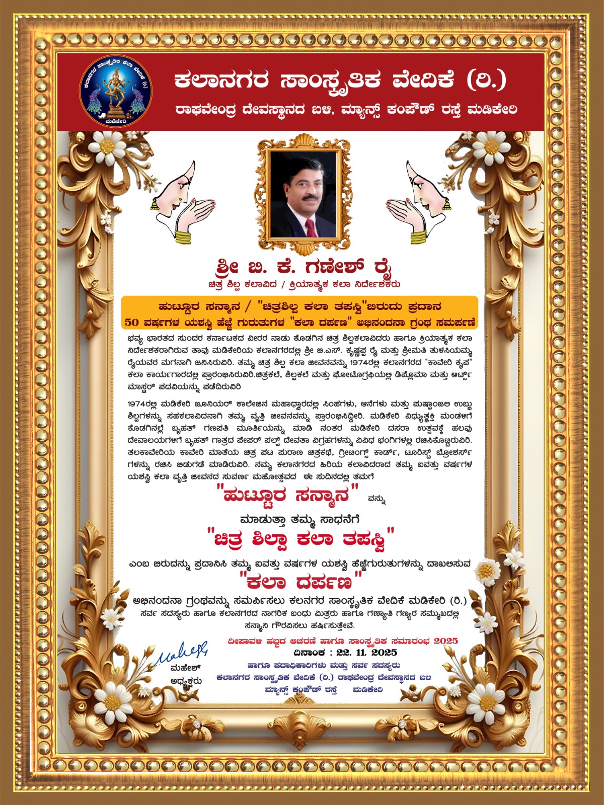 ಕಾರ್ಯಕ್ರಮವನ್ನು ಪ್ರತಿಮಾ ರೈ ನಿರೂಪಿಸಿದರು. ಕೊಡಗಿನ ಮಡಿಕೇರಿಯವರಾಗಿರುವ ಚಿತ್ರ ಶಿಲ್ಪ ಕಲಾವಿದ ಹಾಗೂ ಕ್ರಿಯಾತ್ಮಕ ಕಲಾನಿರ್ದೇಶಕರಾಗಿರುವ ಬಿ.ಕೆ.ಗಣೇಶ್ ರೈ ತಮ್ಮ ಚಿತ್ರಶಿಲ್ಪ ಕಲಾ ವೃತ್ತಿಯನ್ನು 1974ರಲ್ಲಿ ಪ್ರಾರಂಭಿಸಿ, 2025ಕ್ಕೆ ತಮ್ಮ ವೃತ್ತಿ ಜೀವನದ 50ನೇ ವರ್ಷದ ಸುವರ್ಣ ಸಂಭ್ರಮ. ಮಡಿಕೇರಿ ಸರ್ಕಾರಿ ಜೂನಿಯರ ಕಾಲೇಜಿನ ಮಹದ್ವಾರದ ಎರಡು ಬದಿಗಳಲ್ಲಿ ಪುಷ್ಪಾಂಜಲಿ, ಆನೆಗಳು ಉಬ್ಬುಶಿಲ್ಪ ಮತ್ತು ಸಿಂಹಗಳ ವಿಗ್ರಹಗಳನ್ನು ಮಾಡುವಲ್ಲಿ ಕಲಾವಿದರಾಗಿ ತಮ್ಮ ವೃತ್ತಿ ಜೀವನವನ್ನು ಪ್ರಾರಂಭಿಸಿದರು. ಮೈಸೂರಿನ ಚಾಮರಾಜೇಂದ್ರ ಟೆಕ್ನಿಕಲ್ ಸ್ಕೂಲ್ (ಕಾವಾ) ನಲ್ಲಿ ಚಿತ್ರಕಲೆ, ಶಿಲ್ಪಕಲೆ, ಫೋಟೊಗ್ರಫಿ ಯಲ್ಲಿ ಡಿಪ್ಲೋಮಾ ಪಡೆಯುದರ ಜೊತೆಗೆ ಆರ್ಟ್ ಮಾಸ್ಟರ್ ಪದವಿಯನ್ನು ಸಹ ಪಡೆದಿದ್ದಾರೆ. ವಿರಾಜಪೇಟೆಸಂತ ಅನ್ನಮ್ಮ ಪ್ರೌಢ ಶಾಲೆಯಲ್ಲಿ ಚಿತ್ರಕಲಾ ಅಧ್ಯಾಪಕರಾಗಿ ಸೇವೆಯನ್ನು ಸಲ್ಲಿಸಿದ್ದಾರೆ. ಭಾರತ್ ಸ್ಕೌಟ್ಸ್ ಆಂಡ್ ಗೈಡ್ಸ್ ವಿರಾಜಪೇಟೆ ತಾಲ್ಲೂಕು ಕಾರ್ಯದರ್ಶಿಯಾಗಿ ಸೇವೆ ಸಲ್ಲಿಸಿದ್ದಾರೆ. ಮಡಿಕೇರಿ ವಿದ್ಯುಚ್ಚಕ್ತಿ ಮಂಡಳಿಗೆ 1980 ದಶಕದಲ್ಲಿ ಬೃಹತ್ ಗಣಪತಿ ಮೂರ್ತಿಯನ್ನು ಮಾಡುತ್ತಾ ಮಡಿಕೇರಿ ದಸರ ಉತ್ಸವಕ್ಕೆ ಹಲವು ದೇವಾಸ್ಥಾನಗಳಿಗೆ ವಿವಿಧ ಭಂಗಿಯ ವಿವಿಧ ಅಳತೆಯ ದೇವತಾ ಮೂರ್ತಿಗಳನ್ನು ಮಾಡಿಕೊಟ್ಟಿರುವರು ಮಡಿಕೇರಿ ಪುರಭವನದ ಎದುರಿನಲ್ಲಿರುವ ಎರಡು ಬದಿಯಲ್ಲಿ ಮುಖವಿರುವ ಕಾವೇರಿ ಮಾತೆಯ ಪ್ರತಿಮೆಯನ್ನು 1980ರ ದಶಕದಲ್ಲಿ ಗಣೇಶ್ ರೈಯವರು ನಿರ್ಮಿಸಿದ್ದರು. ಪವಿತ್ರ ತೀರ್ಥ ಕ್ಷೇತ್ರ ತಲಕಾವೇರಿಯಲ್ಲಿ ಕಾವೇರಿ ಮಾತೆಯ ವರ್ಣ ಚಿತ್ರಗಳನ್ನು ಶಿವಕಾಶಿಯಲ್ಲಿ ಮುದ್ರಿಸಿ ಬಿಡುಗಡೆ ಮಾಡಿದ್ದಾರೆ. ಬರಹಗಾರರಾಗಿಯೂ ಹಲವಾರು ಲೇಖನಗಳನ್ನು ವಿವಿಧ ಪತ್ರಿಕೆ, ವೆಬ್ ಮಾದ್ಯಮಗಳಲ್ಲಿ ಪ್ರಕಟಿಸಿದ್ದಾರೆ. ಮಡಿಕೇರಿ ಕಾವೇರಿ ಕಲಾಕ್ಷೇತ್ರದ ಎದುರು ಬದಿಯಲ್ಲಿ ಎದುರು ಬದಿ ಹಾಗೂ ಹಿಂಬದಿಯಲ್ಲಿಯೂ ಸಹ ಮುಖವನ್ನು ಹೊಂದಿರುವ ಪೂರ್ಣ ರೂಪವಿರುವ ಶ್ರೀ ಕಾವೇರಿ ಮಾತೆಯ ಶಿಲ್ಪ ಗಣೇಶ್ ರೈಯವರ ಮಾಸ್ಟರ್ ಪೀಸ್ ಶಿಲ್ಪವಾಗಿದೆ. ಪ್ರಸ್ತುತ ದುಬಾಯಿಯಲ್ಲಿ ನೆಲೆಸಿದ್ದು ಜಾಹಿರಾತು ಸಂಸ್ಥೆಯಲ್ಲಿ ಕ್ರಿಯಾತ್ಮಕ ಕಲಾ ನಿರ್ದೇಶಕರಾಗಿ ಸೇವೆಯನ್ನುಸಲ್ಲಿಸಿದ್ದಾರೆ, ಕರ್ನಾಟಕ ಸಂಘ ಶಾರ್ಜಾದ ಅಧ್ಯಕ್ಷರಾಗಿ ಸೇವೆಯನ್ನು ಸಲ್ಲಿಸಿರುವ ಗಣೇಶ್ ರೈಯವರು ಕರ್ನಾಟಕ ಅನಿವಾಸಿ ಭಾರತೀಯ ಸಮಿತಿ ಯು.ಎ.ಇ. ಘಟಕದ ಉಪಾಧ್ಯಕ್ಷರಾಗಿ, ಕರ್ನಾಟಕ ಪ್ರೆಸ್ ಕ್ಲಬ್ ನ ಗಲ್ಫ್ ಘಟಕದ ಉಪಾಧ್ಯಕ್ಷರಾಗಿದ್ದಾರೆ. ಬಹುಮುಖ ವ್ಯಕ್ತಿತ್ವದ ಗಣೇಶ್ ರೈಯವರಿಗೆ ದುಬಾಯಿ ಸರ್ಕಾರ ಕಲ್ಚರಲ್ ಗೋಲ್ಡನ್ ವೀಸಾ ನೀಡಿ ಸನ್ಮಾನಿಸಿ ಗೌರವಿಸಿದೆ. ಹಲವಾರು ಸಾಧನೆಗಳ ದಾಖಲೆಯನ್ನು ಮಾಡಿರುವ ಇವರಿಗೆ ಹಲವಾರು ಅಂತರಾಷ್ಟ್ರೀಯ ಪ್ರಶಸ್ತಿಗಳ ಸರಮಾಲೆಯನ್ನೆ ಧರಿಸಿದ್ದಾರೆ. ಮಯೂರ ವಿಶ್ವಮಾನ್ಯ ಕನ್ನಡಿಗ ಅಂತರಾಷ್ಟ್ರೀಯ ಪ್ರಶಸ್ತಿ, ಶಿಲ್ಪಕಲಾ ಅಂತರಾಷ್ಟ್ರೀಯ ಪ್ರಶಸ್ತಿ ಆರ್ಯಭಟ ಅಂತರಾಷ್ಟ್ರೀಯ ಪ್ರಶಸ್ತಿ ಹಾಗೂ ಇನ್ನೂ ಹಲವಾರು ಅಂತರಾಷ್ಟ್ರೀಯ ಪ್ರಶಸ್ತಿಗಳಿಂದ ಪುರಸ್ಕೃತರಾಗಿದ್ದಾರೆ.