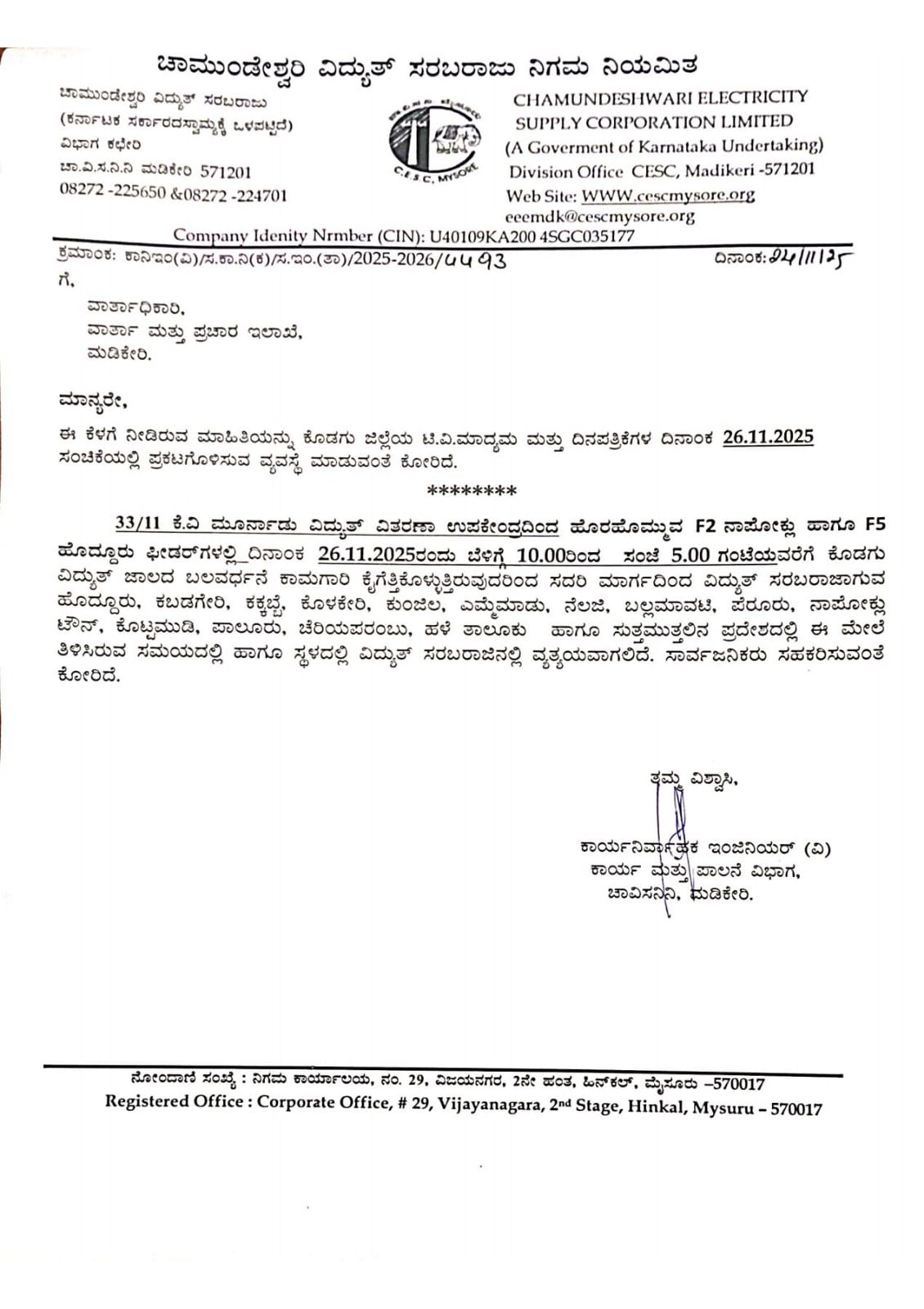 ಮಡಿಕೇರಿ ನ.25 NEWS DESK : ಮೂರ್ನಾಡು 33/11 ಕೆ.ವಿ ವಿದ್ಯುತ್ ವಿತರಣಾ ಉಪಕೇಂದ್ರದಿಂದ ಹೊರಹೊಮ್ಮುವ F2 ನಾಪೋಕ್ಲು ಹಾಗೂ F5 ಹೊದ್ದೂರು ಫೀಡರ್ಗಳಲ್ಲಿ ನ.26 ರಂದು ಬೆಳಿಗ್ಗೆ 10.00ರಿಂದ ಸಂಜೆ 5.00 ಗಂಟೆಯವರೆಗೆ ಕೊಡಗು ವಿದ್ಯುತ್ ಜಾಲದ ಬಲವರ್ಧನೆ ಕಾಮಗಾರಿ ಕೈಗೆತ್ತಿಕೊಳ್ಳುತ್ತಿರುವುದರಿಂದ ಸದರಿ ಮಾರ್ಗದಿಂದ ವಿದ್ಯುತ್ ಸರಬರಾಜಾಗುವ ಹೊದ್ದೂರು, ಕಬಡಗೇರಿ, ಕಕ್ಕಬ್ಬೆ, ಕೊಳಕೇರಿ, ಕುಂಜಿಲ, ಎಮ್ಮೆಮಾಡು, ನೆಲಜಿ, ಬಲ್ಲಮಾವಟಿ, ಪೆರೂರು, ನಾಪೋಕ್ಲು ಟೌನ್, ಕೊಟ್ಟಮುಡಿ, ಪಾಲೂರು, ಚೆರಿಯಪರಂಬು, ಹಳೆ ತಾಲೂಕು ಹಾಗೂ ಸುತ್ತಮುತ್ತಲಿನ ಪ್ರದೇಶದಲ್ಲಿ ಈ ಮೇಲೆ ತಿಳಿಸಿರುವ ಸಮಯದಲ್ಲಿ ಹಾಗೂ ಸ್ಥಳದಲ್ಲಿ ವಿದ್ಯುತ್ ಸರಬರಾಜಿನಲ್ಲಿ ವ್ಯತ್ಯಯವಾಗಲಿದೆ. ಸಾರ್ವಜನಿಕರು ಸಹಕರಿಸುವಂತೆ ಚಾವಿಸನಿನಿ ಕಾರ್ಯ ಮತ್ತು ಪಾಲನೆ ವಿಭಾಗದ ಕಾರ್ಯನಿರ್ವಾಹಕ ಎಂಜಿನಿಯರ್ ಕೋರಿದ್ದಾರೆ.