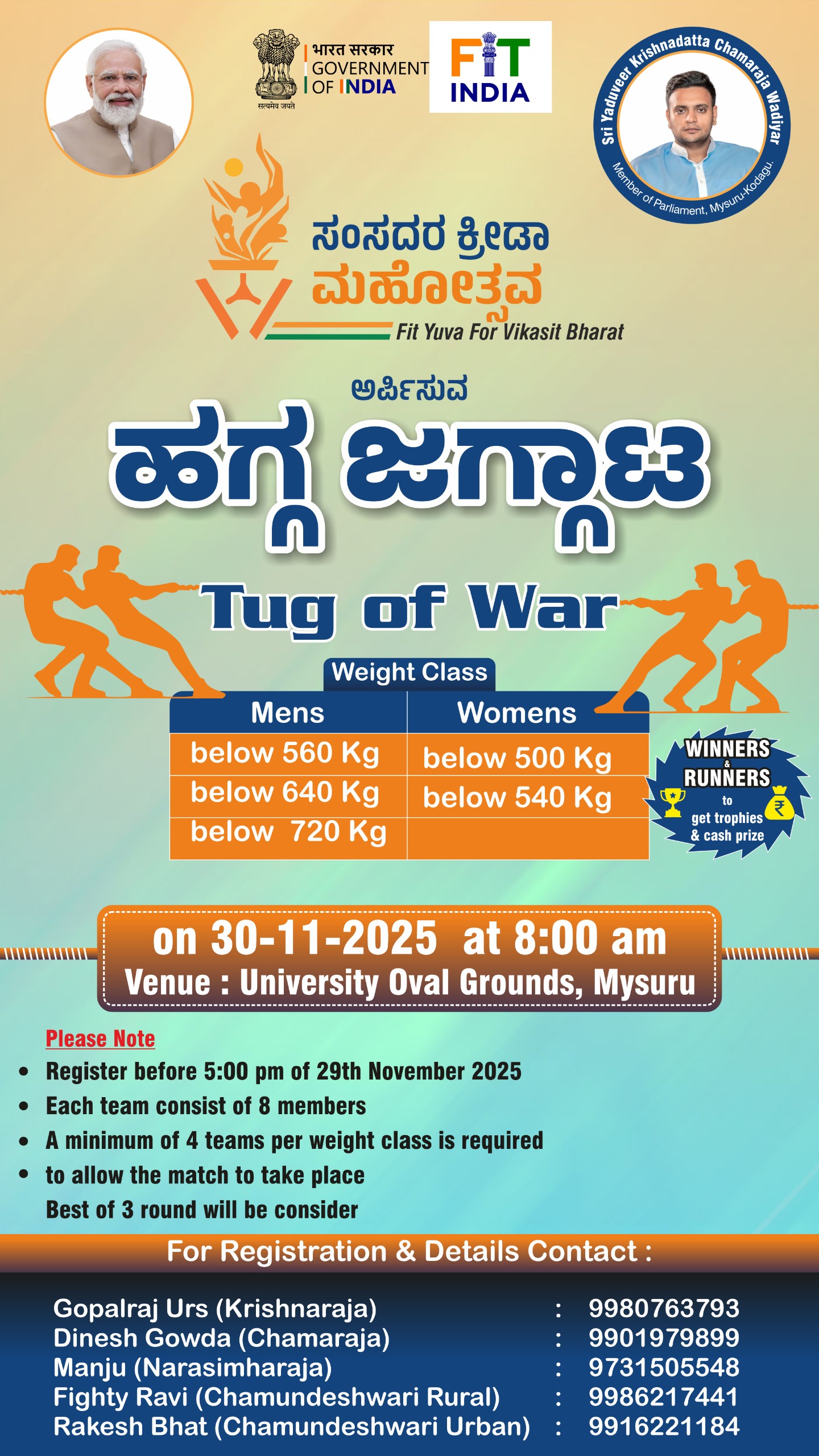 ಮೈಸೂರು, ನ.26 NEWS DESK : ಸಂಸದರ ಕ್ರೀಡಾ ಮಹೋತ್ಸವದ ಅಂಗವಾಗಿ ಫಿಟ್ ಯುವ ಫಾರ್ ವಿಕಸಿತ್ ಭಾರತದ ಯೋಜನೆಯಡಿ ಮೈಸೂರಿನಲ್ಲಿ ಈ ಬಾರಿ ವಿಶೇಷ ಕ್ರೀಡೆಯನ್ನು ಆಯೋಜಿಸಲಾಗಿದೆ. ಅತ್ಯಂತ ಪ್ರಾಚೀನ ಹಾಗೂ ಹಳ್ಳಿ ಸೊಗಡಿನ ಮತ್ತು ದೈಹಿಕ ಸಾಮರ್ಥ್ಯದ ಜೊತೆಗೆ ಚಾಣಾಕ್ಷತನವನ್ನೂ ಕೋರುವ “ಹಗ್ಗ-ಜಗ್ಗಾಟ” ಸ್ಪರ್ಧೆಯನ್ನು ಆಯೋಜಿಸಲಾಗಿದೆ. ಇದೇ ನವೆಂಬರ್ 30ರ ಭಾನುವಾರದಂದು ಬೆಳಗ್ಗೆ 8 ಗಂಟೆಗೆ ಮೈಸೂರಿನ ವಿಶ್ವವಿದ್ಯಾಲಯದ ಓವಲ್ ಗ್ರೌಂಡ್ನಲ್ಲಿ ಈ ಕ್ರೀಡಾಕೂಟ ನಡೆಯಲಿದೆ. ಮೈಸೂರು-ಕೊಡಗು ಲೋಕಸಭಾ ಕ್ಷೇತ್ರದ ಸಂಸದರಾದ ಶ್ರೀ ಯದುವೀರ್ ಕೃಷ್ಣದತ್ತ ಚಾಮರಾಜ ಒಡೆಯರ್” ನೇತೃತ್ವದಲ್ಲಿ ಈ ಕ್ರೀಡಾಕೂಟ ಆಯೋಜಿಸಲಾಗುತ್ತಿದೆ. ಮೈಸೂರಿನಲ್ಲಿ ನಡೆಯಲಿರುವ ಹಗ್ಗ-ಜಗ್ಗಾಟ ಸ್ಪರ್ಧೆಯಲ್ಲಿ ಪುರುಷ-ಮಹಿಳೆಯರ ತಂಡಗಳು ಭಾಗವಹಿಸಬಹುದಾಗಿದೆ. ಪ್ರತಿ ತಂಡದಲ್ಲಿ ಕನಿಷ್ಠ 8 ಮಂದಿ ಇರಬೇಕಾಗಿದೆ. ಪುರುಷರಿಗೆ 560 ಕೆಜಿಗಿಂತ ಕಡಿಮೆ, 640 ಕೆಜಿಗಿಂತ ಕಡಿಮೆ ಹಾಗೂ 720 ಕೆಜಿಗಿಂತ ಕಡಿಮೆ ತೂಕದ ವಿಭಾಗ ಹಾಗೂ ಮಹಿಳೆಯರ ವಿಭಾಗದಲ್ಲಿ 500 ಕೆಜಿಗಿಂತ ಕಡಿಮೆ ಹಾಗೂ 540 ಕೆಜಿ ಕಡಿಮೆ ತೂಕದ ವಿಭಾಗದಲ್ಲಿ ಸ್ಪರ್ಧೆಗಳು ನಡೆಯಲಿವೆ. ಪ್ರತಿ ವಿಭಾಗದಲ್ಲಿ ವಿಜೇತ ತಂಡಗಳಿಗೆ ಟ್ರೋಫಿ ಹಾಗೂ ನಗದು ಬಹುಮಾನ ಹಾಗೂ ಪ್ರಶಸ್ತಿ ಪತ್ರ ವಿತರಿಸಲಾಗುವುದು.