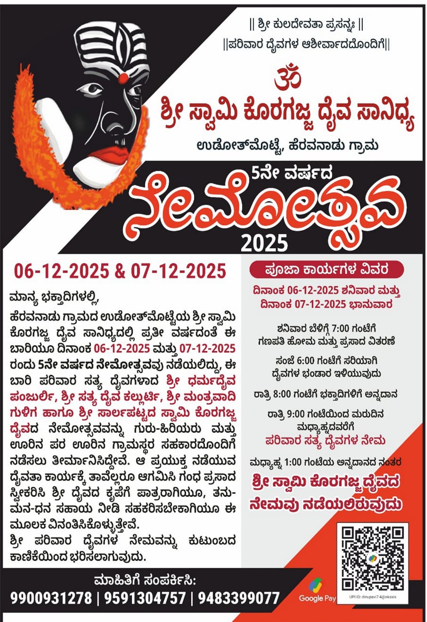 ಮಡಿಕೇರಿ ಡಿ.3 NEWS DESK : ಉಡೋತ್ಮೊಟ್ಟೆಯ ಶ್ರೀ ಸ್ವಾಮಿ ಕೊರಗಜ್ಜ ದೈವ ಸಾನಿಧ್ಯದಲ್ಲಿ ಡಿ.6 ಮತ್ತು 7 ರಂದು ಐದನೇ ವರ್ಷದ ನೇಮೋತ್ಸವ ನಡೆಯಲಿದೆ. ಡಿ.6 ರಂದು ಬೆಳಿಗ್ಗೆ 7 ಗಂಟೆಗೆ ಗಣಪತಿ ಹೋಮ ಮತ್ತು ಪ್ರಸಾದ ವಿತರಣೆ ನಡೆಯಲಿದೆ. ಸಂಜೆ 6 ಗಂಟೆಗೆ ದೈವದ ಭಂಡಾರ ಇಳಿಯುವುದು, ರಾತ್ರಿ 9 ಗಂಟೆಯಿಂದ ಡಿ.7ರ ಮಧ್ಯಾಹ್ನದ ವರೆಗೆ ಪರಿವಾರ ಸತ್ಯ ದೈವಗಳಾದ ಶ್ರೀ ಧರ್ಮದೈವ, ಪಂಜುರ್ಲಿ, ಶ್ರೀ ಸತ್ಯ ದೈವ ಕಲ್ಲುರ್ಟಿ, ಶ್ರೀ ಮಂತ್ರವಾದಿ ಗುಳಿಗ ಹಾಗೂ ಶ್ರೀ ಸಾರ್ಲಪಟ್ಟದ ಸ್ವಾಮಿ ಕೊರಗಜ್ಜ ದೈವದ ನೇಮ ಜರುಗಲಿದೆ. ಎರಡು ದಿನವೂ ಅನ್ನದಾನ ನೆರವೇರಲಿದ್ದು, ಭಕ್ತಾಧಿಗಳು ಹೆಚ್ಚಿನ ಸಂಖ್ಯೆಯಲ್ಲಿ ಪಾಲ್ಗೊಳ್ಳುವಂತೆ ದೈವಸ್ಥಾನದ ಪ್ರಮುಖರು ಮನವಿ ಮಾಡಿದ್ದಾರೆ. ಹೆಚ್ಚಿನ ಮಾಹಿತಿಗೆ 9900931278, 9591304757, 9483399077 ಸಂಪರ್ಕಿಸಬಹುದಾಗಿದೆ.