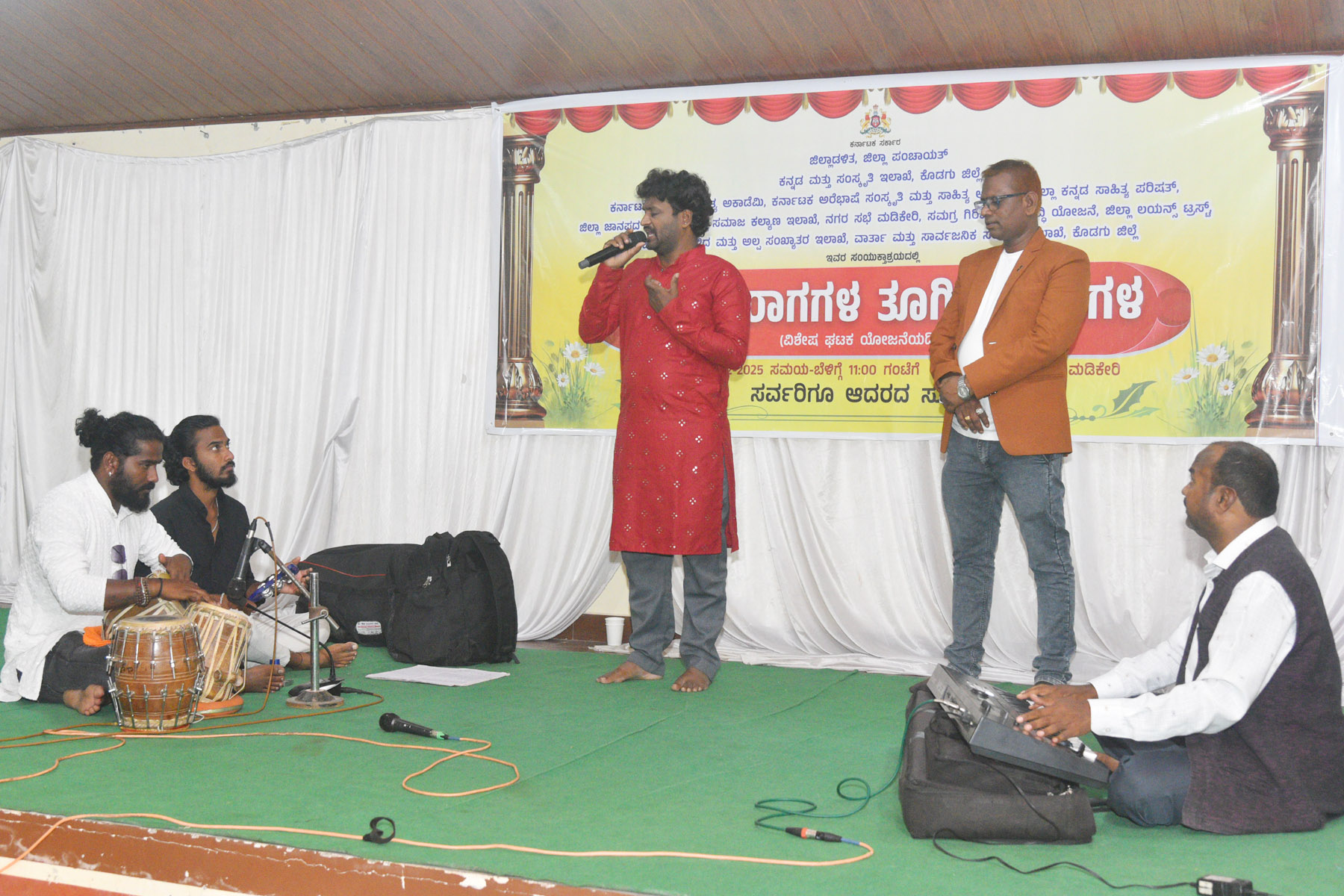 ಮಡಿಕೇರಿ ಡಿ.4 NEWS DESK : ನಗರದ ಗಾಂಧಿ ಭವನದಲ್ಲಿ ಜಿಲ್ಲಾಡಳಿತ ಸಹಕಾರದಲ್ಲಿ ಕನ್ನಡ ಮತ್ತು ಸಂಸ್ಕೃತಿ ಇಲಾಖೆ ವತಿಯಿಂದ ‘ಹಾಡಿರೆ ರಾಗಗಳ ತೂಗಿರೆ ದೀಪಗಳ’ ವಿಶೇಷ ಘಟಕ ಯೋಜನೆಯಡಿ ನಡೆದ ಹಾಡು, ನೃತ್ಯ ವಿಶೇಷ ಹಾಗೂ ವಿಭಿನ್ನತೆಯೊಂದಿಗೆ ಸಾಂಸ್ಕೃತಿಕ ವೈವಿಧ್ಯತೆಗಳಿಗೆ ಸಾಕ್ಷಿಯಾಯಿತು. ಬೆಂಗಳೂರಿನ ಜೋಗಿಲ ಸಿದ್ದರಾಜು ಮತ್ತು ತಂಡದವರು ಹಾಡಿರೆ ರಾಗಗಳ ತೂಗಿರೆ ದೀಪಗಳ ಹಾಡುವ ಮೂಲಕ ಸಾಂಸ್ಕೃತಿಕ ಕಾರ್ಯಕ್ರಮಕ್ಕೆ ಚಾಲನೆ ನೀಡಿದರು. ಗುರುವೆ ನಿನ್ನ ಆಟ ಬಲ್ಲವರ್ಯಾರೂ, ಶಿವನೇ ನಿನ್ನ ಆಟ ಬಲ್ಲವರ್ಯಾರೂ, ಚೆಲ್ಲಿದರೂ ಮಲ್ಲಿಗೆಯ ಬಾನಸು ಏರಿ ಮೇಲೆ, ಮಾದಪ್ಪ ಬರುವಾಗ, ಮಾಳೆಲ್ಲಾ ಗಮ್ಮೆಂದಿತು, ಮತ್ತಿತರ ಜಾನಪದ ಗೀತೆಗಳನ್ನು ಹಾಡುವ ಮೂಲಕ ಕಲಾಪ್ರೇಮಿಗಳನ್ನು ಕುಣಿಯುವಂತೆ ಮಾಡಿದ್ದು, ವಿಶೇಷವಾಗಿತ್ತು. ಮೈಸೂರು ಜಿಲ್ಲೆ ಎಚ್ಡಿಕೋಟೆ ತಾಲ್ಲೂಕಿನ ದೇವರಾಜು ಮತ್ತು ತಂಡದವರು ಸುಗಮ ಸಂಗೀತ ನುಡಿಸುವ ಮೂಲಕ ಗಮನ ಸೆಳೆದರು. ಬೆಂಗಳೂರು ದಕ್ಷಿಣ ಜಿಲ್ಲೆಯ ಮಹೇಶ್ ಕುಮಾರ್ ಮತ್ತು ತಂಡದವರು ರಂಗ ಗೀತೆ ಹಾಡುವ ಮೂಲಕ ಗಮನ ಸೆಳೆದರು. ವಿರಾಜಪೇಟೆ ತಾಲ್ಲೂಕಿನ ಚೆನ್ನಯ್ಯನ ಕೋಟೆಯ ಪವಿತ್ರ ಎಚ್.ಆರ್. ತಂಡದವರು ಕೊಡವ ಓಲಗ ನುಡಿಸುವ ಮೂಲಕ ಕೊಡಗಿನ ಸಾಂಸ್ಕೃತಿಕ ಮಹತ್ವವನ್ನು ಸಾರಿದರು. ಹಾಗೆಯೇ ರಾಮನಗರ ಜಿಲ್ಲೆಯ ಸಂತೋಷ್ ಆರ್. ತಂಡದವರು ಡೊಳ್ಳು ಕುಣಿತ ಕಾರ್ಯಕ್ರಮ ನೀಡುವ ಮೂಲಕ ರಂಜಿಸಿದರು. ಒಟ್ಟಾರೆ ಇಡೀ ಕಾರ್ಯಕ್ರಮ ಸಂಗೀತಮಯವಾಗಿ ಎಲ್ಲರಲ್ಲಿಯೂ ಹಾಡು ಹಾಡುವಂತೆ ಪ್ರೇರೇಪಿಸಿತ್ತು. ಸಭಾ ಕಾರ್ಯಕ್ರಮವನ್ನು ದೀಪಬೆಳಗಿಸಿ ಉದ್ಘಾಟಿಸಿದ ಮಡಿಕೇರಿ ತಹಶೀಲ್ದಾರ್ ಶ್ರೀಧರ್ ಅವರು ನಾಡು, ನುಡಿ, ಭಾಷೆ, ಮತ್ತು ಜಾನಪದ ಕಲೆ ಹೆಚ್ಚಾಗಿ ಬೆಳೆಸಬೇಕು ಎಂದು ಕರೆ ನೀಡಿದರು. ಜಿಲ್ಲಾಡಳಿತ, ಜಿಲ್ಲಾ ಪಂಚಾಯತ್, ಕನ್ನಡ ಮತ್ತು ಸಂಸ್ಕೃತಿ ಇಲಾಖೆ, ಕರ್ನಾಟಕ ಕೊಡವ ಸಾಹಿತ್ಯ ಅಕಾಡೆಮಿ, ಕರ್ನಾಟಕ ಅರೆಭಾಷೆ ಸಂಸ್ಕೃತಿ ಮತ್ತು ಸಾಹಿತ್ಯ ಅಕಾಡೆಮಿ, ಜಿಲ್ಲಾ ಕನ್ನಡ ಸಾಹಿತ್ಯ ಪರಿಷತ್, ಜಿಲ್ಲಾ ಜಾನಪದ ಪರಿಷತ್, ಮಡಿಕೇರಿ ತಾಲೂಕು ಜಾನಪದ ಪರಿಷತ್, ಜಿಲ್ಲಾ ಸಮಾಜ ಕಲ್ಯಾಣ ಇಲಾಖೆ, ನಗರಸಭೆ, ಸಮಗ್ರ ಗಿರಿಜನ ಅಭಿವೃದ್ಧಿ ಯೋಜನೆ, ಜಿಲ್ಲಾ ಲಯನ್ಸ್ ಟ್ರಸ್ಟ್, ಜಿಲ್ಲಾ ಹಿಂದುಳಿದ ಮತ್ತು ಅಲ್ಪಸಂಖ್ಯಾತರ ಇಲಾಖೆ ಮತ್ತು ವಾರ್ತಾ ಮತ್ತು ಸಾರ್ವಜನಿಕ ಸಂಪರ್ಕ ಇಲಾಖೆ ಇವರ ಸಹಯೋಗದೊಂದಿಗೆ ನಗರದ ಗಾಂಧಿ ಭವನದಲ್ಲಿ ಬುಧವಾರ ನಡೆದ ಹಾಡಿರೆ ರಾಗಗಳ ತೂಗಿರೆ ದೀಪಗಳ ಕಾರ್ಯಕ್ರಮವನ್ನು ಉದ್ಘಾಟಿಸಿ ಅವರು ಮಾತನಾಡಿದರು. ಜಾನಪದ ಕಲೆ ಬೆಳೆಸುವುದು ಎಲ್ಲರ ಕರ್ತವ್ಯ ಹಾಗೂ ಪ್ರತಿಯೊಬ್ಬರು ಜಾನಪದ ಸೊಗಡನ್ನು ಬೆಳೆಸಲು ಮುಂದಾಗಬೇಕು ಎಂದರು. ಕನ್ನಡ ಸಾಹಿತ್ಯ ಪರಿಷತ್ ಜಿಲ್ಲಾಧ್ಯಕ್ಷರಾದ ಕೇಶವ ಕಾಮತ್ ಅವರು ಡೊಳ್ಳು ಬಾರಿಸುವ ಮೂಲಕ ಸಾಂಸ್ಕೃತಿಕ ಕಾರ್ಯಕ್ರಮಕ್ಕೆ ಚಾಲನೆ ನೀಡಿ ಮಾತನಾಡಿ ಜಾನಪದ ನಮ್ಮೆಲ್ಲರ ಜೀವನಾಡಿ ಹಾಗೂ ಜಾನಪದ ಸಂಗೀತವು ಮನಸ್ಸಿನ ಆರೋಗ್ಯವನ್ನು ಸುಧಾರಿಸುತ್ತದೆ ಎಂದರು. ಒತ್ತಡ ಮತ್ತು ಖಿನ್ನತೆ ಕಡಿಮೆ ಮಾಡುತ್ತದೆ. ಸೃಜನಾತ್ಮಕ ಮತ್ತು ಸಮೂಹ ಕೌಶಲ್ಯ ಬೆಳೆಸುತ್ತದೆ. ಭಾಷೆ ಕೌಶಲ್ಯ, ಗಣಿತ, ವಿಜ್ಞಾನ, ದೈಹಿಕ ಸಮಾನತೆಯನ್ನು ನೂತನಗೊಳಿಸುತ್ತದೆ ಎಂದು ಹೇಳಿದರು. ಸಾಂಸ್ಕೃತಿಕ ಮತ್ತು ಸಾಂಪ್ರದಾಯಿಕ ಸಂರಕ್ಷಿಸಲು ಧಾರ್ಮಿಕ ಮತ್ತು ಸಾಮಾಜಿಕ ಕಾರ್ಯಕ್ರಮಗಳು ಆನಂದವನ್ನು ಹೆಚ್ಚಿಸಲು ಸಂಗೀತ ತುಂಬಾ
