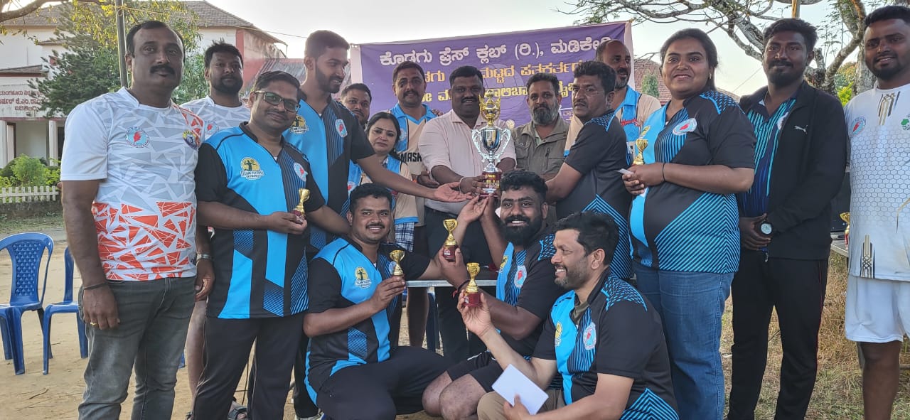 ಮಡಿಕೇರಿ ಡಿ.15 NEWS DESK : ಕೊಡಗು ಪ್ರೆಸ್ ಕ್ಲಬ್ ವತಿಯಿಂದ ನಗರದ ಫೀಲ್ಡ್ ಮಾರ್ಷಲ್ ಕೆ.ಎಂ.ಕಾರ್ಯಪ್ಪ ಕಾಲೇಜು ಮೈದಾನದಲ್ಲಿ ಭಾನುವಾರ ಆಯೋಜಿಸಲಾಗಿದ್ದ 2ನೇ ವರ್ಷದ ಕೊಡಗು ಜಿಲ್ಲಾಮಟ್ಟದ ಪತ್ರಕರ್ತರ ವಾಲಿಬಾಲ್ ಪಂದ್ಯಾವಳಿಯಲ್ಲಿ ಟೀಂ ಸ್ಮ್ಯಾಶರ್ಸ್ ತಂಡ ಚಾಂಪಿಯನ್ ಪಟ್ಟ ಅಲಂಕರಿಸಿತು. ಪಂದ್ಯಾಟದಲ್ಲಿ ಟೀಂ ಸ್ಮ್ಯಾಶರ್ಸ್, ಟೀಂ ಚೀತಾ, ಟೀಮ್ ಫ್ಲೈಯರ್ಸ್, ಟೀಂ ಜಂಪರ್ಸ್, ಟೀಂ ಹಂಟರ್ಸ್ ಮತ್ತು ಟೀಂ ಬ್ಲಾಕರ್ಸ್ ತಂಡಗಳು ಪಾಲ್ಗೊಂಡಿತ್ತು. ಲೀಗ್ ಮಾದರಿಯಲ್ಲಿ ನಡೆದ ಪಂದ್ಯಾಟದಲ್ಲಿ 4 ತಂಡಗಳು ಕ್ವಾಲಿಫಯರ್ ಹಂತಕ್ಕೆ ಪ್ರವೇಶ ಪಡೆಯಿತು. ಮೊದಲ ಕ್ಲಾಲಿಫೈಯರ್ ಪಂದ್ಯಾಟದಲ್ಲಿ ಇಸ್ಮಾಯಿಲ್ ಕಂಡಕರೆ ನಾಯಕತ್ವದ ಟೀಂ ಸ್ಮ್ಯಾಶರ್ಸ್ ತಂಡ 26-24 ಪಾಯಿಂಟ್ಗಳಿಂದ ಅಕ್ಷಯ್ ನಾಯಕತ್ವದ ಟೀಂ ಫ್ಲೈಯರ್ಸ್ ತಂಡವನ್ನು ಮಣಿಸಿತು. ನಂತರ ನಡೆದ ಮೊದಲ ಎಲಿಮಿನೇಟರ್ ಪಂದ್ಯದಲ್ಲಿ ಪ್ರೇಮ್ ನಾಯಕತ್ವದ ಟೀಂ ಚೀತಾ ತಂಡ 25-19 ಪಾಯಿಂಟ್ಗಳಿಂದ ಆದರ್ಶ್ ನಾಯಕತ್ವದ ಟೀಂ ಜಂಪರ್ಸ್ ತಂಡವನ್ನು ಮಣಿಸಿತು. 2ನೇ ಕ್ವಾಲಿಫೈಯರ್ ಪಂದ್ಯದಲ್ಲಿ ಪ್ರೇಮ್ ನಾಯಕತ್ವದ ಟೀಂ ಚೀತಾ ತಂಡ 25-27 ಪಾಯಿಂಟ್ಗಳಿಂದ ಅಕ್ಷಯ್ ನಾಯಕತ್ವದ ಟೀಂ ಫ್ಲೈಯರ್ಸ್ ತಂಡವನ್ನು ಮಣಿಸಿತು. ಫೈನಲ್ ಪಂದ್ಯದಲ್ಲಿ ಟೀಂ ಸ್ಮ್ಯಾಶರ್ಸ್ ತಂಡ 2-1 ಸೆಟ್ಗಳಿಂದ ಟೀಂ ಚೀತಾ ತಂಡವನ್ನು ಮಣಿಸಿ ಚಾಂಪಿಯನ್ ಪಟ್ಟ ಅಲಂಕರಿಸಿತು. ಟೀಂ ಚೀತಾ ತಂಡ ದ್ವಿತೀಯ ಸ್ಥಾನ ಪಡೆದರೆ, ಟೀಂ ಫ್ಲೈಯರ್ಸ್ ತಂಡ ತೃತೀಯ ಸ್ಥಾನ ಪಡೆಯಿತು. ಬೆಸ್ಟ್ ಪ್ಲೇಯರ್ ಪ್ರಶಸ್ತಿಯನ್ನು ಟೀಂ ಸ್ಮ್ಯಾಶರ್ಸ್ ತಂಡದ ಇಸ್ಮಾಯಿಲ್ ಕಂಡಕರೆ ಪಡೆದುಕೊಂಡರೆ, ಉತ್ತಮ ಮಹಿಳಾ ಆಟಗಾರ್ತಿ ಪ್ರಶಸ್ತಿಯನ್ನು ಟೀಂ ಫ್ಲೈಯರ್ಸ್ ತಂಡದ ಚೈತನ್ಯ ಚಂದ್ರಮೋಹನ್ ಪಡೆದುಕೊಂಡರು. ವಿಜೇತ ತಂಡಕ್ಕೆ ಆಕರ್ಷಕ ಟ್ರೋಫಿ ಮತ್ತು ನಗದನ್ನು ನೀಡಿ ಗೌರವಿಸಲಾಯಿತು. ತೀರ್ಪುಗಾರರಾಗಿ ಫೀಲ್ಡ್ ಮಾರ್ಷಲ್ ಕೆ.ಎಂ.ಕಾರ್ಯಪ್ಪ ಕಾಲೇಜಿನ ದೈಹಿಕ ಶಿಕ್ಷಕರಾದ ರಮೇಶ್ ಮತ್ತು ವಾಲಿಬಾಲ್ ಆಟಗಾರ ಧವನ್, ಸ್ಕೋರರ್ ಆಗಿ ಬಾಚರಣಿಯಂಡ ಶಶಾಂಕ್ ಸೋಮಯ್ಯ ಕಾರ್ಯನಿರ್ವಹಿಸಿದರು. :: ಉದ್ಘಾಟನಾ ಸಮಾರಂಭ : : 2ನೇ ವರ್ಷದ ಜಿಲ್ಲಾ ಮಟ್ಟದ ಪತ್ರಕರ್ತರ ವಾಲಿಬಾಲ್ ವೈಭವವನ್ನು ಉದ್ಘಾಟಿಸಿ ಮಾತನಾಡಿದ ಫೀಲ್ಡ್ ಮಾರ್ಷಲ್ ಕೆ.ಎಂ.ಕಾರ್ಯಪ್ಪ ಕಾಲೇಜಿನ ಪ್ರಾಂಶುಪಾಲರಾದ ಪ್ರೊ.ಮೇ.ಬಿ.ರಾಘವ್, ಆರ್ಥಿಕ ತಾರತಮ್ಯ, ಮತೀಯ ವ್ಯತ್ಯಾಸವನ್ನು ಹೋಗಲಾಡಿಸಿ ಎಲ್ಲರನ್ನೂ ಒಂದುಗೂಡಿಸುವ ಶಕ್ತಿ ಕ್ರೀಡೆಗಿದೆ. ದೃಢತೆ, ಸಂಕಲ್ಪ, ಸಹನೆ, ದೈರ್ಯವನ್ನು ಹೆಚ್ಚಿಸುತ್ತದೆ. ಕ್ರೀಡಾಕೂಟಗಳು ಮನಸ್ಸಿನ ಒತ್ತಡವನ್ನು ನಿವಾರಿಸಿ ಉಲ್ಲಾಸ ನೀಡುತ್ತದೆ. ಸೋಲನ್ನು ಮೆಟ್ಟಿ ನಿಂತು ಯಶಸ್ಸು ಗಳಿಸಲು ಮನೋಧೈರ್ಯ ನೀಡುತ್ತದೆ. ಕ್ರೀಡಾಪಟುಗಳಿಗೆ ಶಿಸ್ತು ಅತೀ ಮುಖ್ಯ ಎಂದರು. ಕುಶಾಲನಗರ ತಾಲೂಕಿನ ಹೇರೂರು ಗ್ರಾಮದ ಉದ್ಯಮಿ ಮೋಹಿನಿ ಪ್ರಕಾಶ್ ಮಾತನಾಡಿ, ಕ್ರೀಡೆಯು ನಮ್ಮಲ್ಲಿರುವ ಆತ್ಮವಿಶ್ವಾಸವನ್ನು ಹೆಚ್ಚಿಸುತ್ತದೆ. ಕ್ರೀಡಾಪಟುಗಳು ಜನರಿಂದ ಹೆಚ್ಚು ಪ್ರೀತಿ ಗಳಿಸುತ್ತಾರೆ. ಪತ್ರಿಕಾ ಮಾಧ್ಯಮಗಳು ಕ್ರೀಡಾ ಕ್ಷೇತ್ರದ ಬಗ್ಗೆಯೂ ಹೆಚ್ಚು ಬೆಳಕು ಚೆಲ್ಲುವಂತಾಗಬೇಕು ಎಂದರು. ಜಿಲ್ಲಾ ಹಿಂದೂ ಮಲೆಯಾಳಿ ಸಮಾಜದ ಸಲಹೆಗಾರ ಹಾಗೂ ಎಸ್ಎನ್ಡಿಪಿ ಮಡಿಕೇರಿ ತಾಲೂಕು ಅಧ್ಯಕ್ಷ ಟಿ.ಆರ್.ವಾಸುದೇವ್ ಮಾತನಾಡಿ, ಹೆಸರಿಗೆ ತಕ್ಕಂತೆ ಪಂದ್ಯಾವಳಿ ವೈಭವಯುತವಾಗಿದೆ. ದುರ್ಬಲರು, ಎಲೆಮರೆ ಕ
