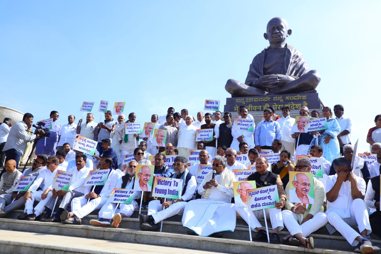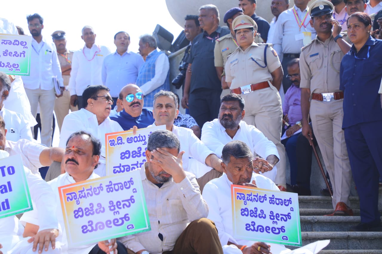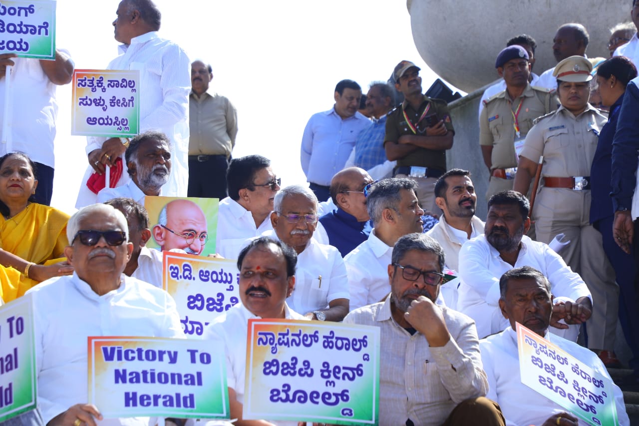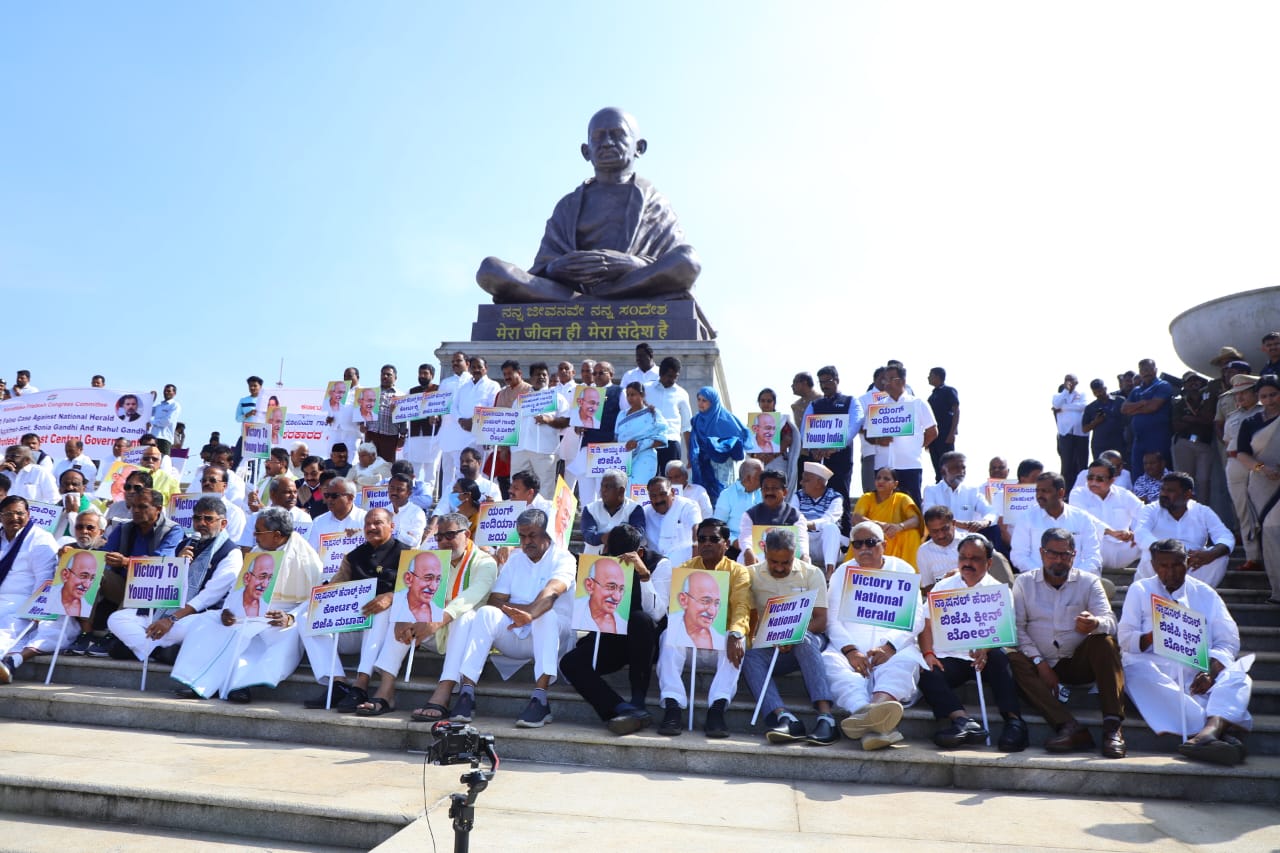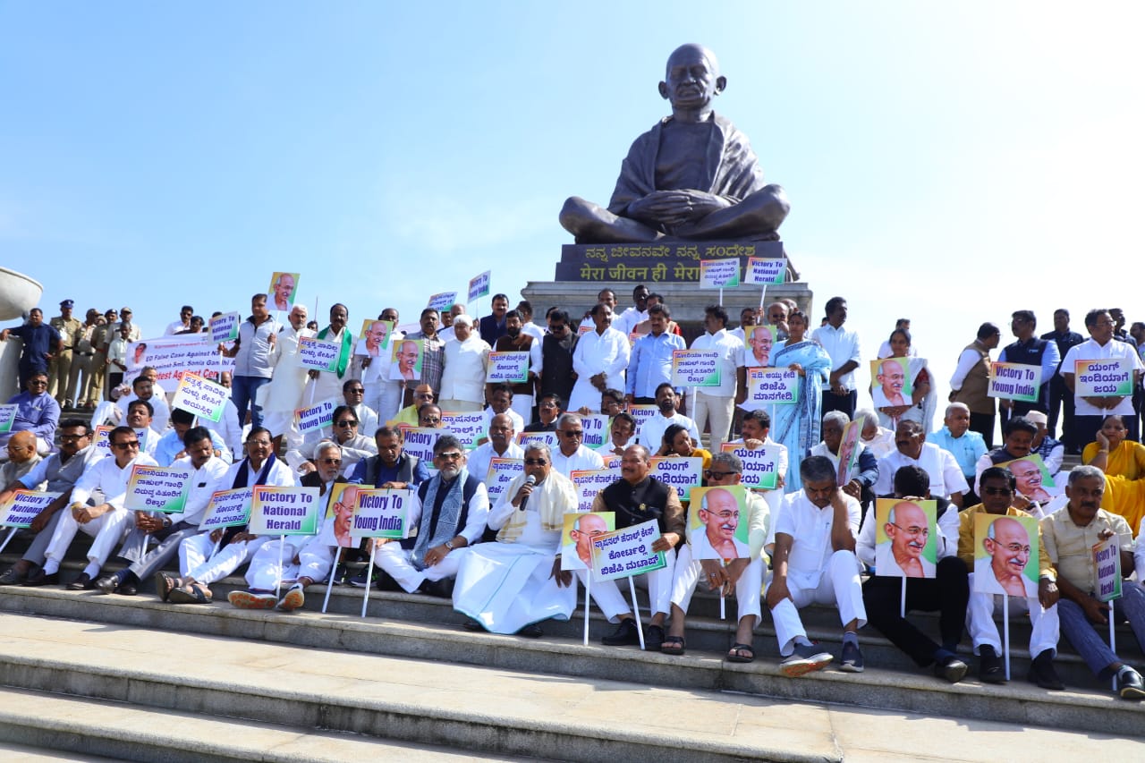ಬೆಳಗಾವಿ ಡಿ.17 NEWS DESK : ಕೇಂದ್ರ ಸರ್ಕಾರವು ಅಸ್ತಿತ್ವದಲ್ಲಿರುವ ನರೇಗಾ ಯೋಜನೆಯಿಂದ ಮಹಾತ್ಮ ಗಾಂಧಿ ಹೆಸರನ್ನು ತೆಗೆದುಹಾಕುವ ಕ್ರಮ ಮತ್ತು ನ್ಯಾಷನಲ್ ಹೆರಾಲ್ಡ್ ಪ್ರಕರಣದಲ್ಲಿ ಪಕ್ಷದ ನಾಯಕರ ವಿರುದ್ಧ ‘ದ್ವೇಷ ರಾಜಕೀಯ’ ನಡೆಸುತ್ತಿದೆ ಎಂದು ಆರೋಪಿಸಿ ಆಡಳಿತಾರೂಢ ಕಾಂಗ್ರೆಸ್ ಬೃಹತ್ ಪ್ರತಿಭಟನೆ ನಡೆಸಿತು. ಮುಖ್ಯಮಂತ್ರಿ ಸಿದ್ದರಾಮಯ್ಯ ಮತ್ತು ಉಪಮುಖ್ಯಮಂತ್ರಿ ಡಿಕೆ ಶಿವಕುಮಾರ್ ನೇತೃತ್ವದಲ್ಲಿ ಸುವರ್ಣ ಸೌಧದ ಗಾಂಧಿ ಪ್ರತಿಮೆ ಮುಂದೆ ನಡೆದ ಪ್ರತಿಭಟನೆಯಲ್ಲಿ ಸಚಿವರು, ಶಾಸಕರು ಮತ್ತು ವಿಧಾನ ಪರಿಷತ್ ಸದಸ್ಯರು ಭಾಗವಹಿಸಿದ್ದರು.